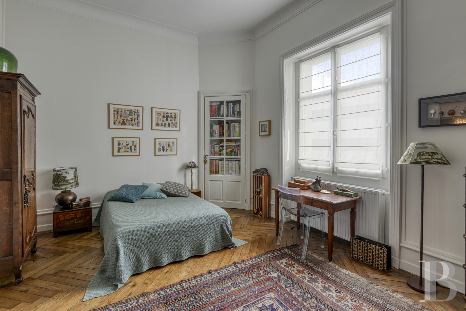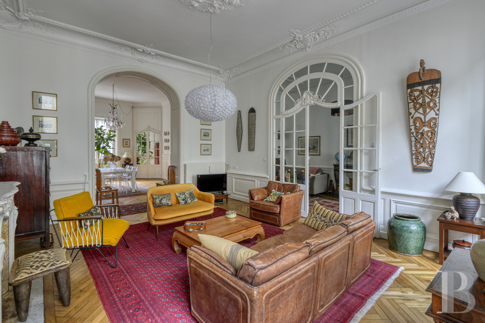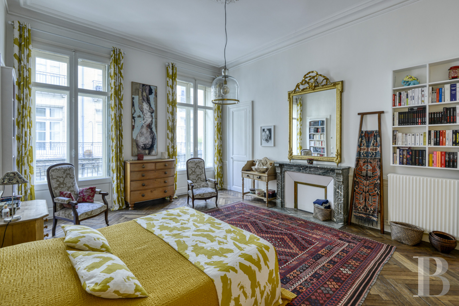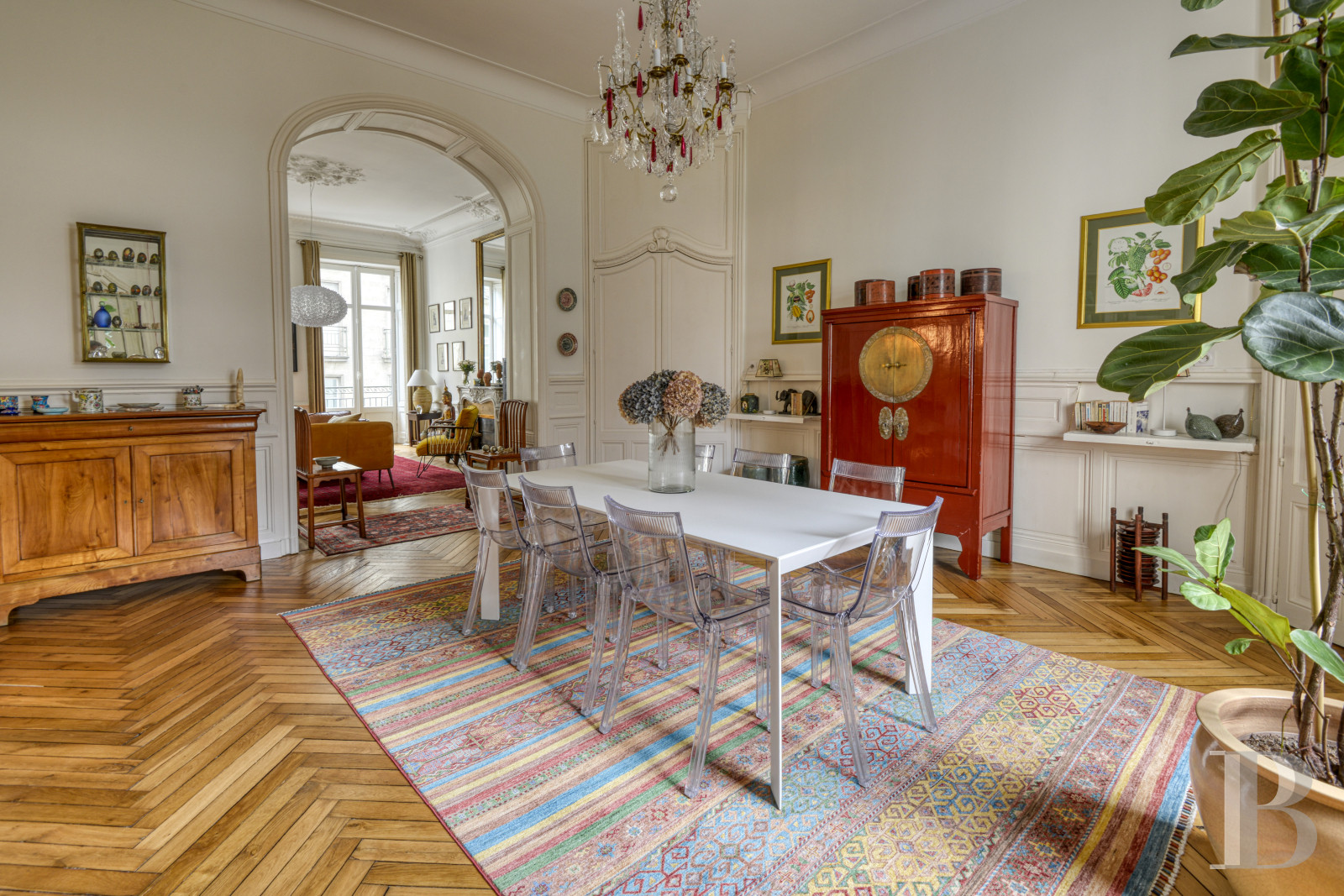 Access is via a staircase with stone steps that wind in regular flights around a wrought-iron balustrade with curved motifs. The walls are covered in deep blue painted panelling. The landing floor is tiled with cement tiles in a black and white geometric pattern. At the end of the entrance door, a corridor leads to a vast double reception room of over 60 m² with period features. The ceilings, around 3.90 m high, are decorated with mouldings enhanced by floral decorations and motifs in relief. The walls are highlighted with supporting panelling. A Louis XV-style fireplace in Carrara marble is set against one of the living room walls. The lintel is carved with a shell in the centre and rests on sheathed jambs. Large cupboards, also adorned with Louis XV mouldings, line the corners of the dining room. The interior glazed French windows are edged with arched arches highlighted by sculpted decoration. A 17 m² room, with a Napoleon III fireplace carved from sea-green marble and supported by sculpted lion paws, is currently used as an office. The floors are herringbone parquet in the main rooms, followed in the entrance hall and corridors by cement tiles with black cabochons. The long, independent kitchen of around 10 m² is fitted and equipped. The base and wall units are contemporary and in light wood. A large window illuminates the space. This is followed by two comfortable bedrooms of around 28 m² and 22 m², also covered with parquet flooring. One opens onto the courtyard, while the other overlooks the street through two high double-leaf windows extended by a balcony. The high ceilings are accentuated by an antique rose window. The light-coloured walls are punctuated by supporting panelling. A green marble fireplace is set against one of the walls. Nearby, a discreet door conceals a built-in storage area. The bedrooms share a shower room, where the uniform small square tiles in a sandy beige hue evoke the Putman style.