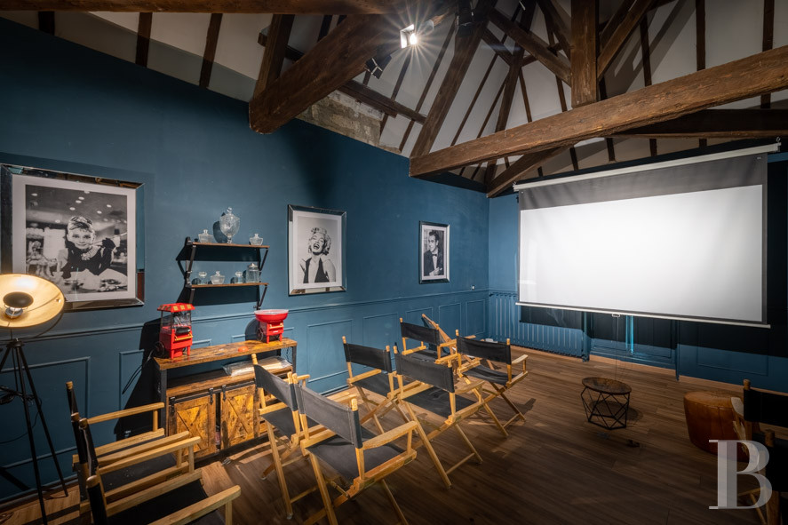 On this level, a skylight with coloured stained glass panes illuminates a corridor that leads to six bedrooms which are simpler than those on the first floor. At the end of the corridor, a narrow wooden staircase leads to a screening room in the tower, where paintings and knick-knacks pay tribute to the seventh art. It boasts an old, solid oak roof structure supporting the cathedral ceiling.