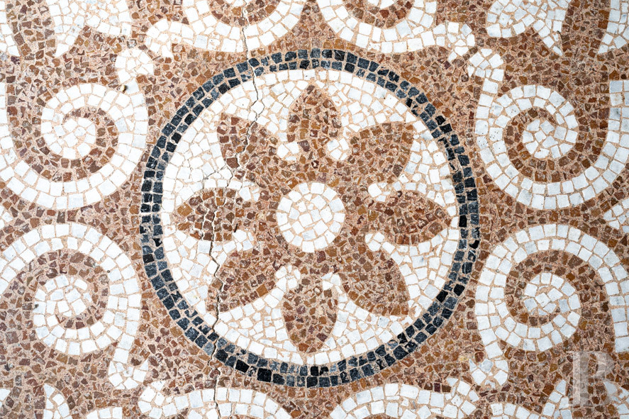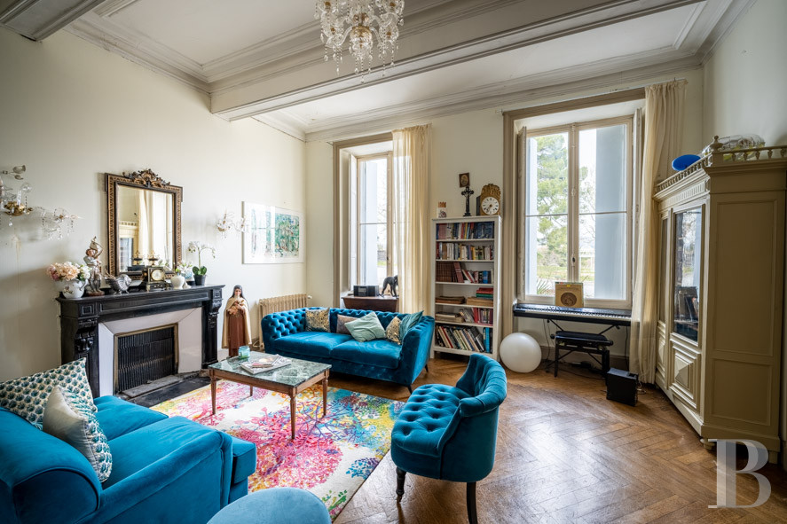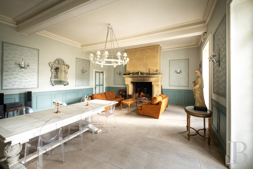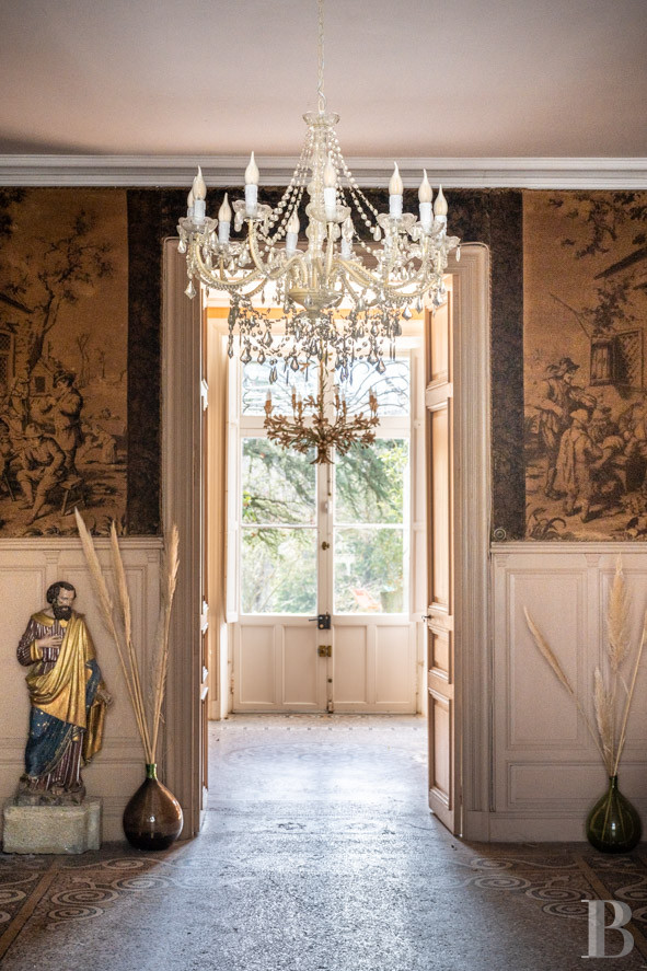 The front elevation of the central corps de logis faces east. The heavy wooden entrance door with glazed transom opens directly into a wide hall with a mosaic floor - an original terrazzo granito - and walls covered with 19th century hangings depicting scenes of daily life in the 18th century. It serves the main reception rooms, including two ceremonial halls, over 3.5 m high, with herringbone parquet flooring, black marble fireplaces and moulded ceilings with coffered beams. The floor of the third sitting room features Art Deco mosaic tiles, similar to those in the entrance hall. It connects directly to a family room that serves as a sitting room and dining room, with a monumental dressed stone fireplace and large paving stones on the floor.