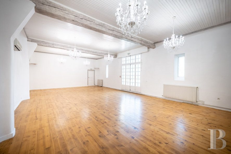 Set at right angles to and extending from the chapel, this wing contains a reception room of over 90 m², with solid oak parquet flooring, chandeliers with pendants and high ceilings. Weddings are held here all year round, with some guests staying in the adjoining gîtes.