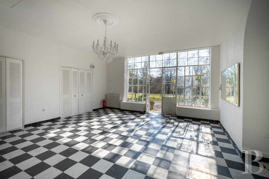 The ground floor orangery on the western side houses a reception hall with solid oak parquet flooring and six chandeliers with pendants. An east-facing room with an authentic 1900s steel and glass structure with black and white chequered floor, red marble fireplace and beams covered in moulded plaster provides access to this reception space.
