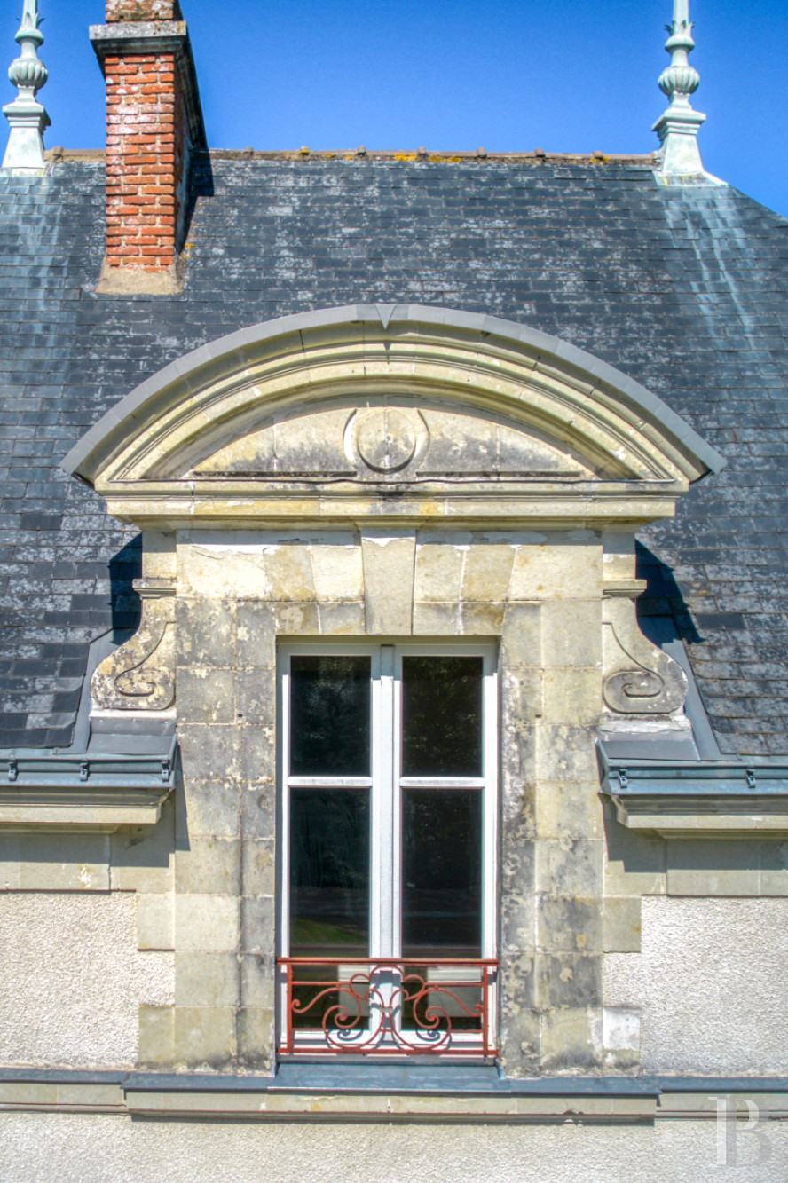 Topped with a slate roof punctuated by dormer windows, it includes a main building, cadenced by three vertical rows of windows, which is extended on either side by a wing with one vertical row of windows. Placed at right angles, the wings form an interior courtyard and give the building its U shape. Abutting the eastern wing at a right angle, a polygonal pavilion in tuffeau stone with three rows of vertical windows projects outwards. while the chateau’s roof is adorned with dormer windows topped with triangular pediments, except for the dormer window over the main building’s central row of windows, which is crowned with a basket-handle pediment.