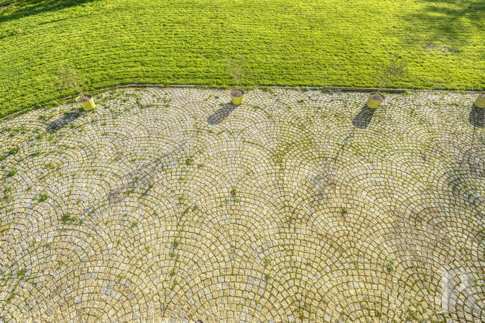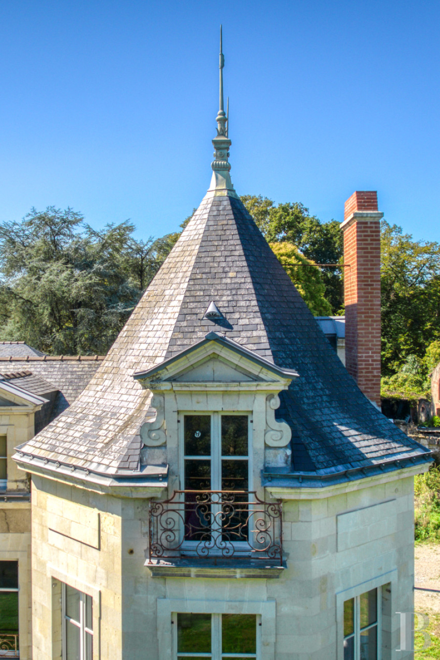 The chateau’s exteriors are coated in lime plaster, except for the pavilion’s outer walls, which are made out of tuffeau stone as are the window and door surrounds, quoins, cornices and dormer windows, whereas the chimneys were constructed out of brick and tuffeau stone. Surrounding the chateau, along its façade, eastern wing and up until the pavilion, the ground is covered in fish-scale pavers, while the interior courtyard is clad in ochre travertine slabs.
