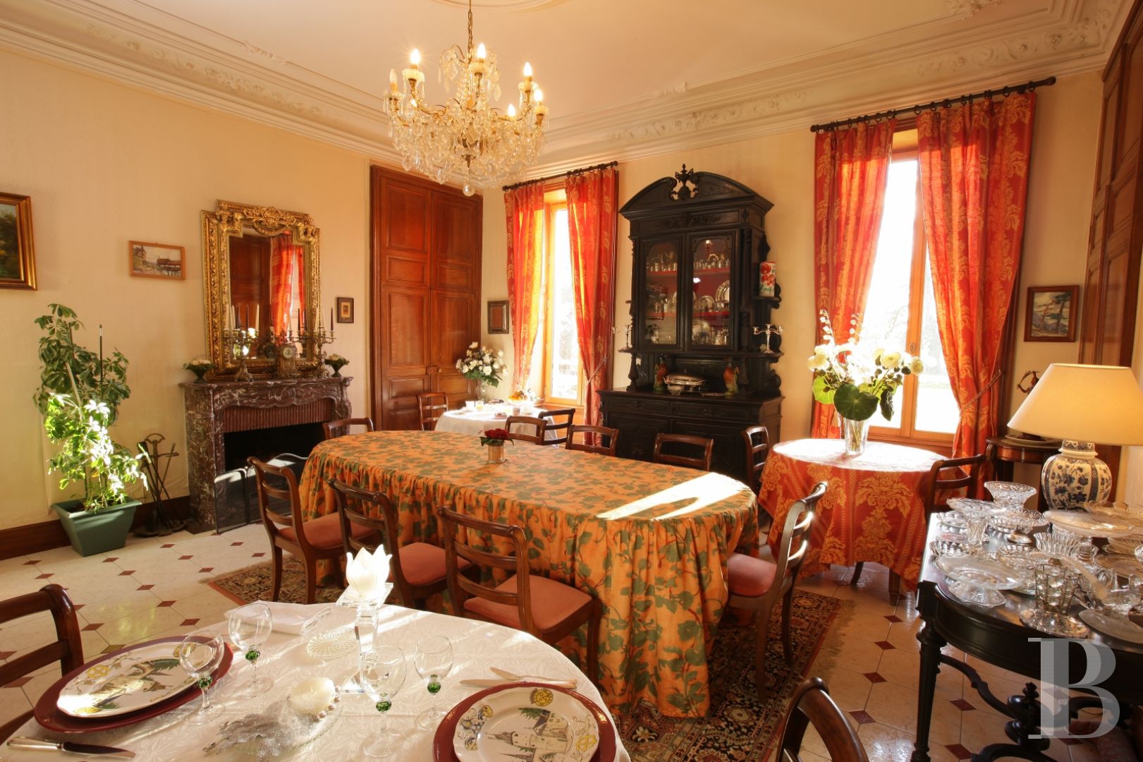 The chateau is accessed via a summer lounge which leads to its impressive glazed entrance door, flanked by carved wooden ornamentation. A long corridor leads, left, to a south-facing dining room, steeped in sunlight courtesy of its two tall windows. A fitted kitchen houses an impressive, 18th century, exposed granite and brick fireplace. It adjoins a storeroom and a back kitchen. Opposite the dining room is a linen room as well as a storage area with a toilet. The other rooms, on the right-hand side of the central corridor, include a study in the rotunda, a reception room with a granite, Louis XVI style fireplace, a bedroom with a view over the parklands and the main lounge with its solid oak wood parquet flooring, laid in a herringbone pattern.