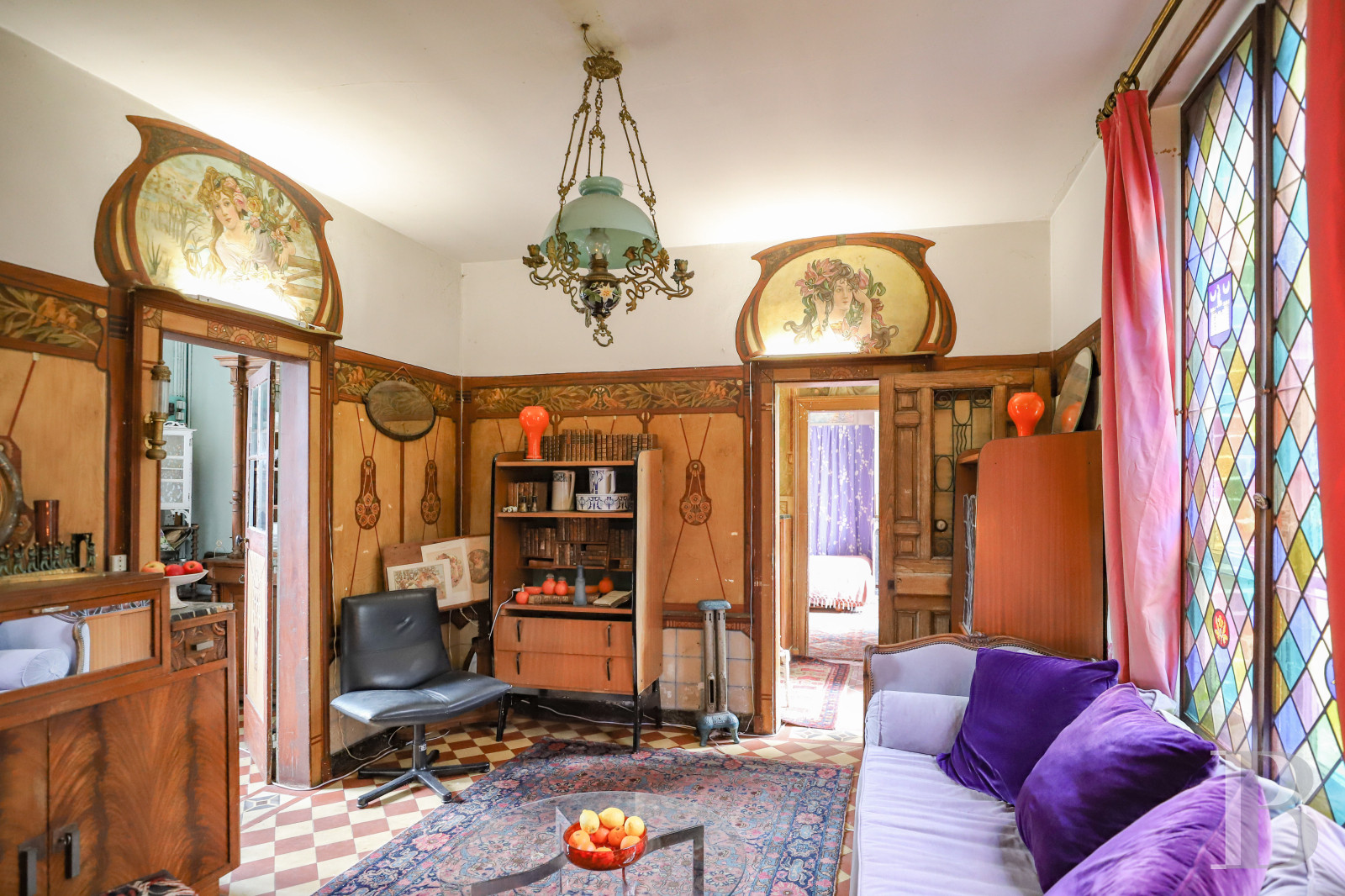 This is a unique property not in terms of its architecture, however pleasant, but in terms of its interior painted decor. As soon as you pass the front door, you are confronted by a dreamlike atmosphere with a profusion of colours, faces and landscapes. Discovering Art Nouveau paintings with Art Deco trompe l'oeil decorations in a village house is a unique experience. While it may seem unlikely to find such a sophisticated decor, living in the midst of it is a daily delight. Indeed, these outstanding works deserve to be added to the list of protected historic sites.