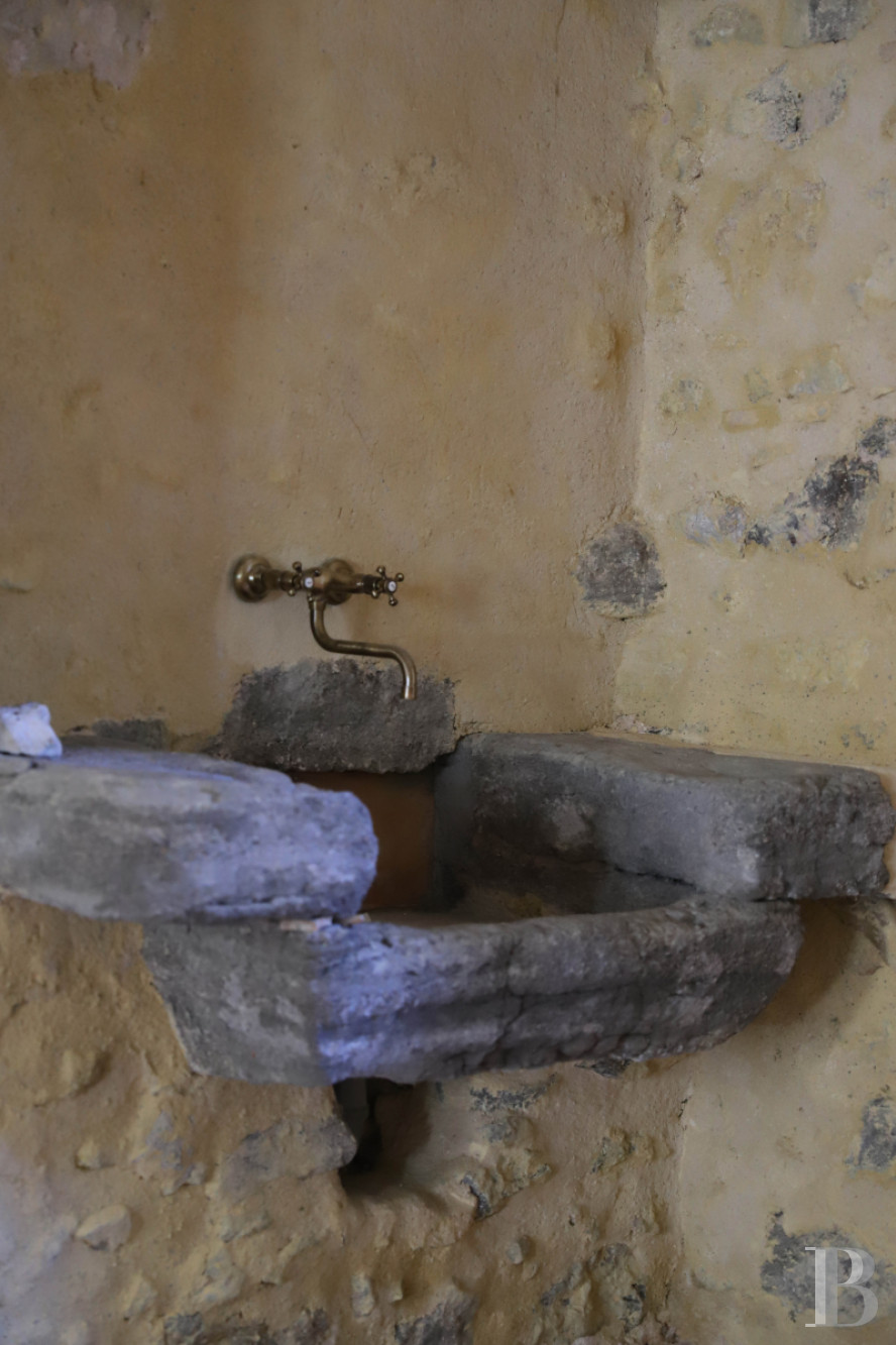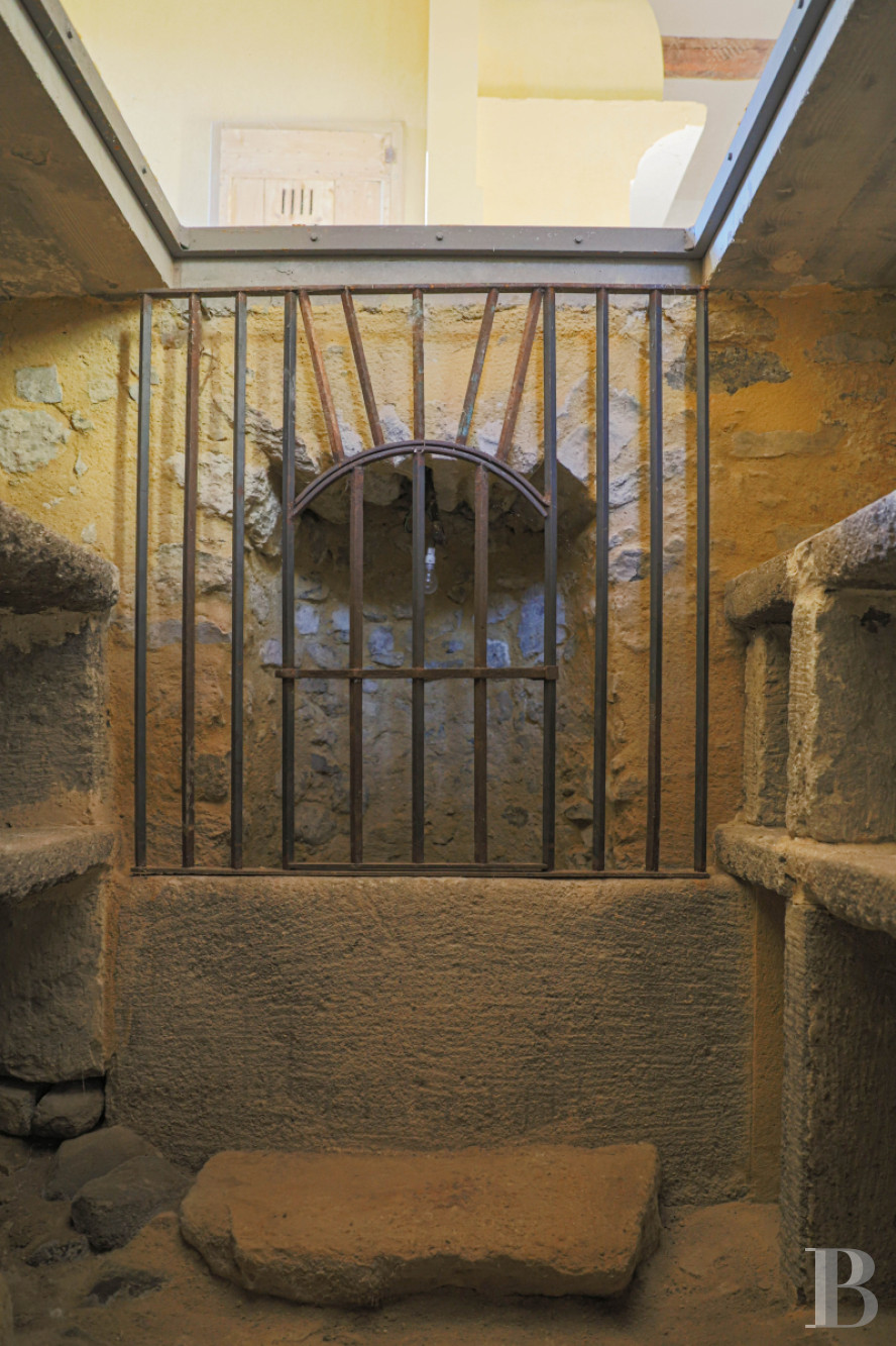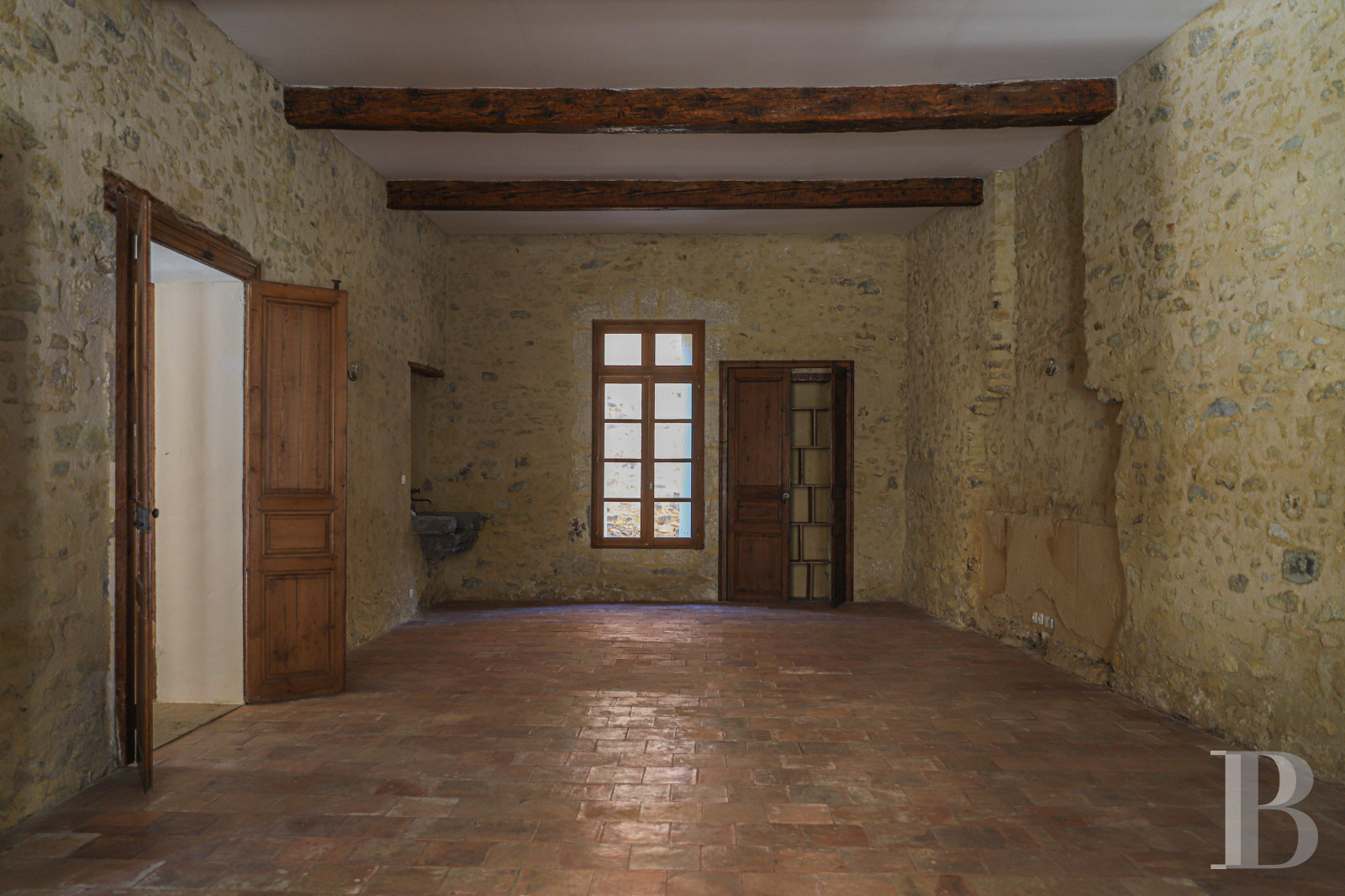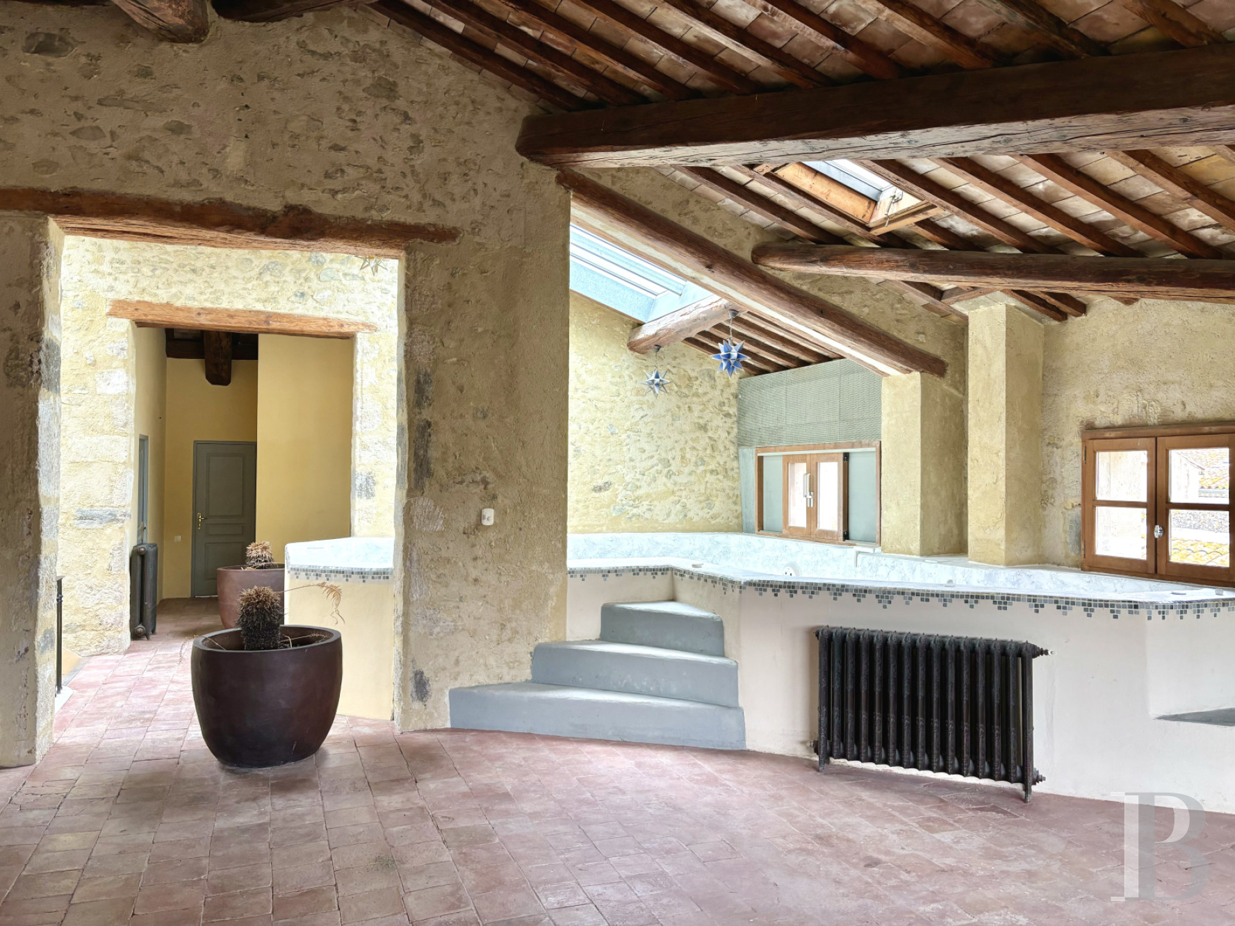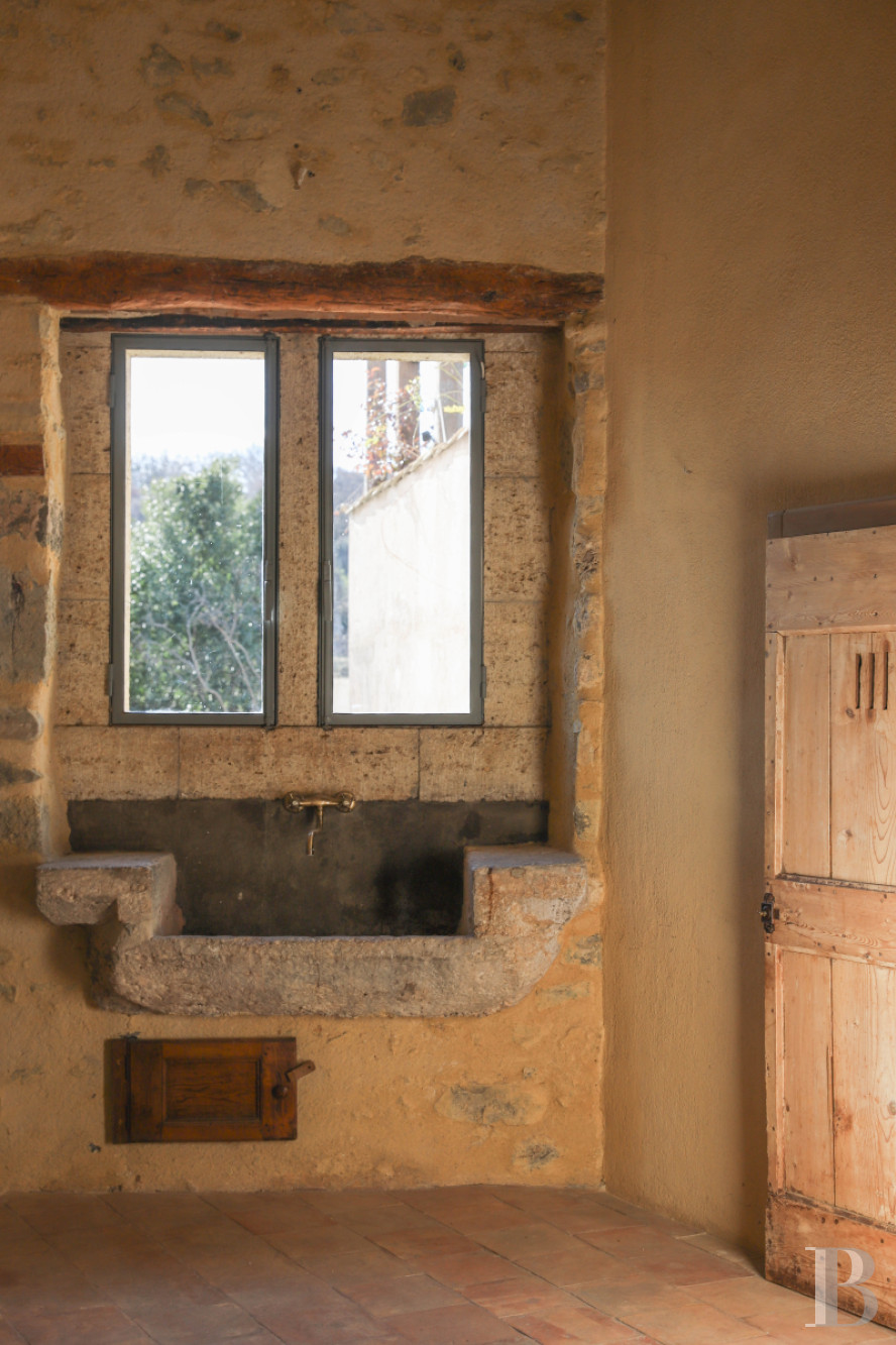 The doors on the right open onto a large room with a terracotta floor, once the main living room, with a large Languedoc stone fireplace used for cooking and heating, and which now serves as a kitchen and dining room. Opposite the hearth, an equipped kitchen has been installed, from where a door opens into a scullery. A few steps lead from there down to the basement. The old stone sink has kept its original place under a window. Combined with other period elements, it lends the room the charm of bygone days. In the centre of the kitchen and framed by the terracotta floor, a secured glass hatch gives a glimpse of the bottles of wine stored in the cellar, while providing the basement with natural light. Finally, at the back of the room, a washroom with a whirlpool bath has been installed under a mezzanine.