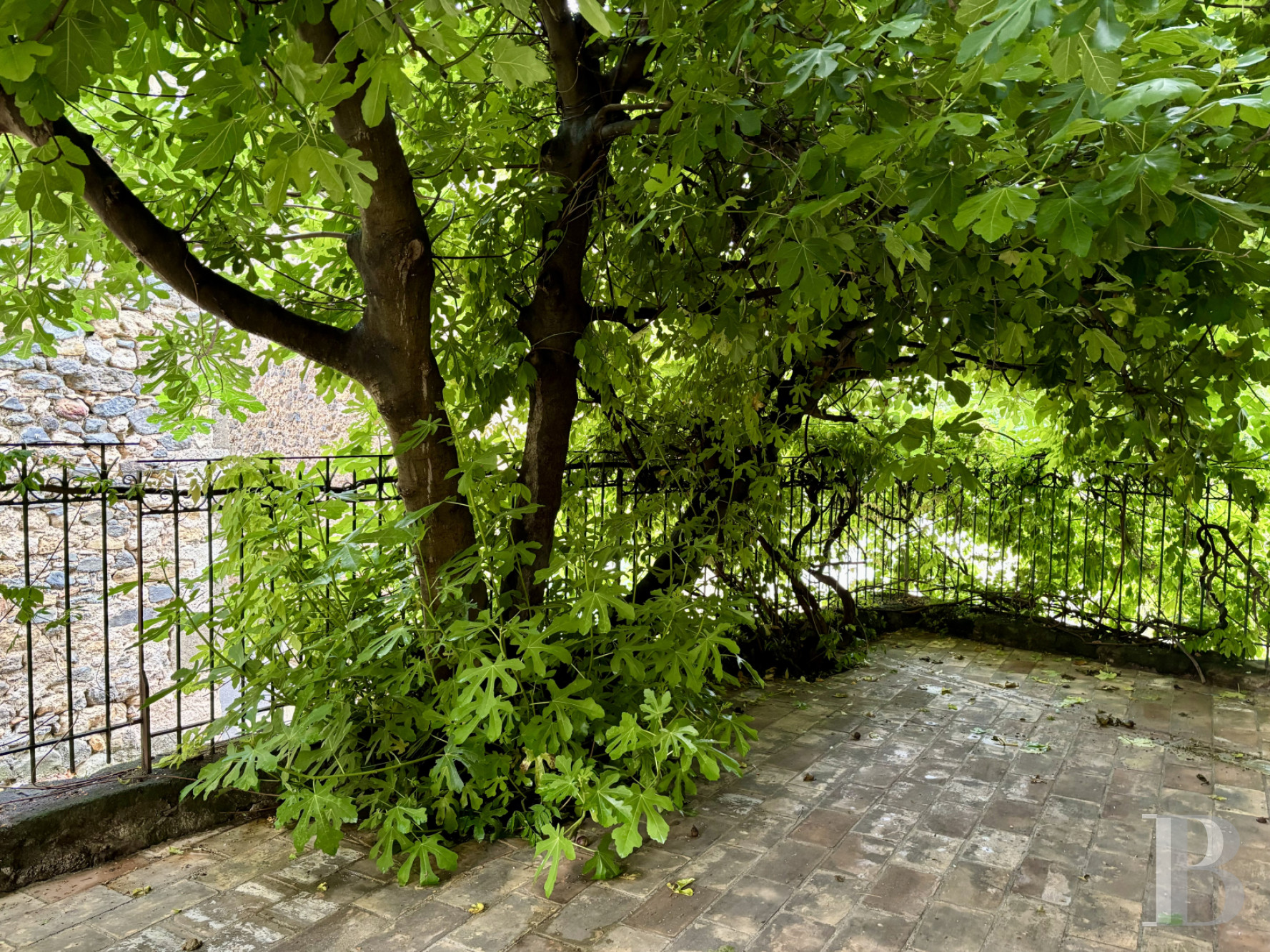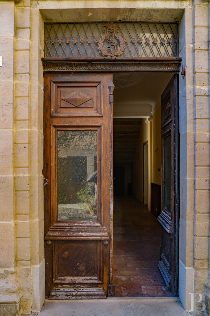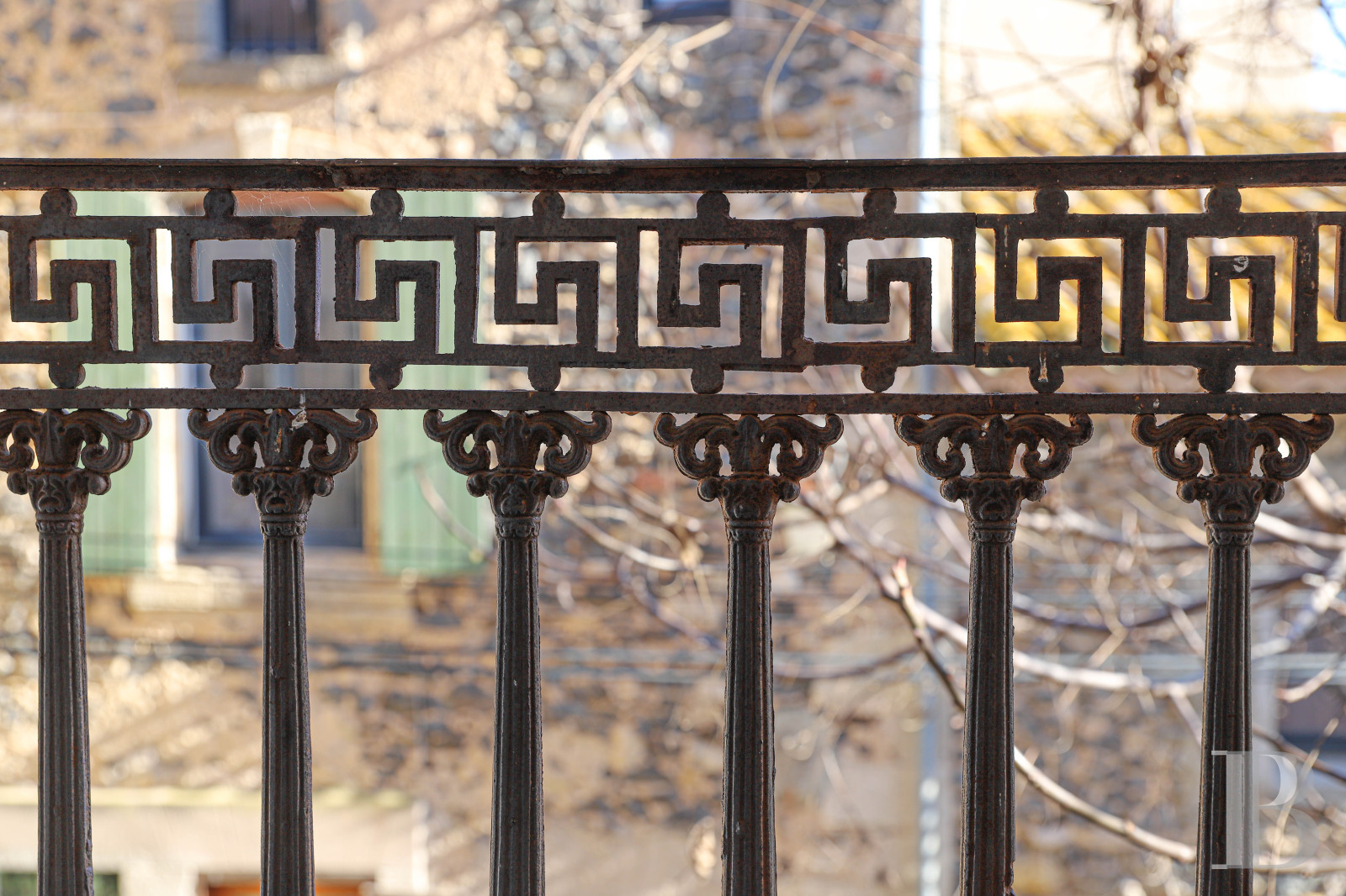 The residence spans three levels, all featuring numerous windows and glass doors with wooden frames. Adorned with Greek friezes, the sober ironwork guard-rails and balconies strictly follow the main lines of the classical-style facade. The natural stone cornices add a distinctive finish to the house and are a fine substitute for a classical Provençal frieze. The roofs are clad with terracotta monk-and-nun tiles. The entrance from the cobbled alleyway is through an old doorway, partly glazed and framed by stone pilasters crowned by Ionic capitals. The capitals are topped by a dentilled cornice which supports a corbelled balcony on the first floor.