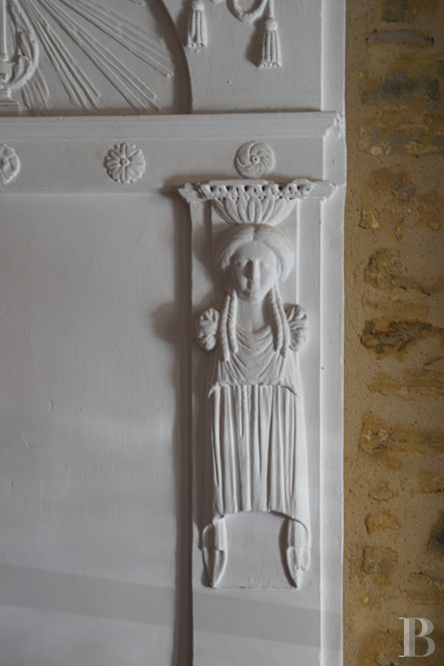 To the left of the entrance, accessed through two double doors, is a generously sized living room that lends itself to various uses. A marble fireplace topped by a Neo-Directory style plaster overmantel adorns the room. Here too, a corner of the room features an antique stone sink that is still in use. Completing this level, a lavatory has judiciously and discreetly found its place under the stone staircase of the entrance. Finally, a door in this space provides access to the alleyway at the back.