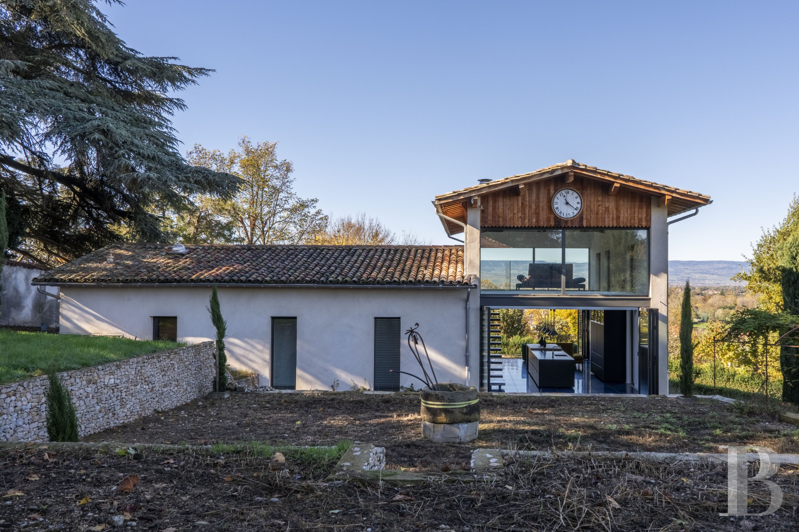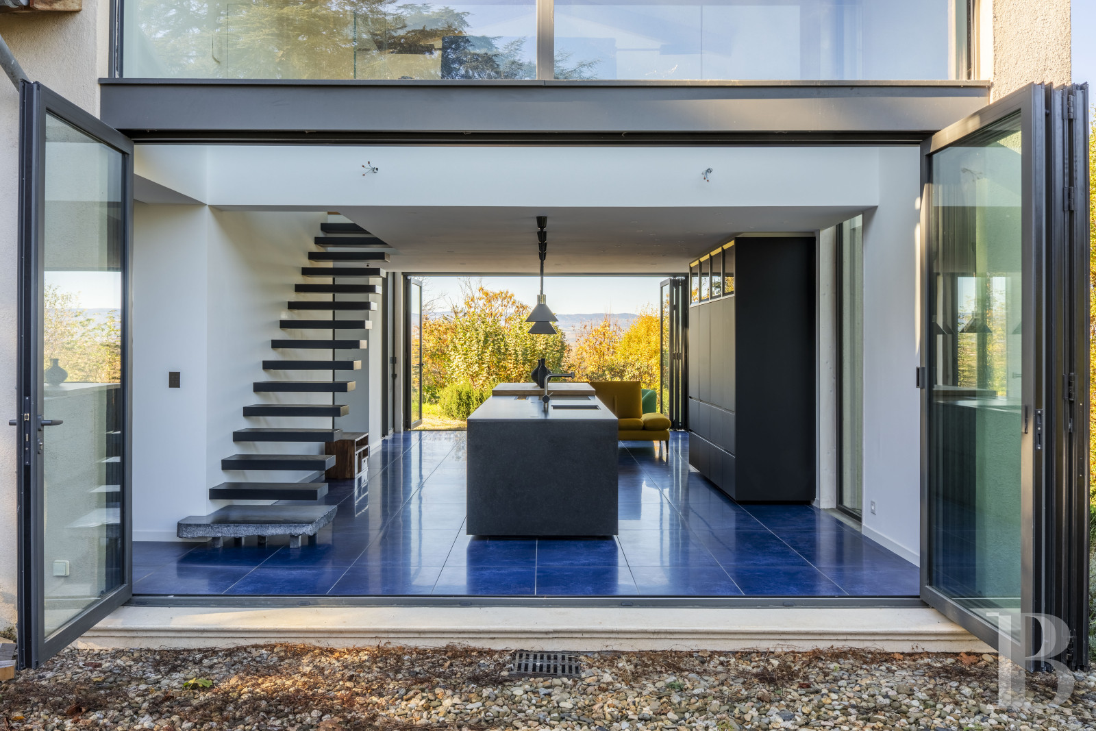 The villa’s old outside appearance, with its cedar tip embellishments along the top of the facade and its wooden clock, contrasts with the interior, where modernity is everywhere. You enter the villa from the east side, from the parkland where you can admire a sweeping view. It has a kitchen with a large central island unit, a sliding table and different household appliances, as well as drawers that are lit up from inside when opened. There are fold-away glazed doors on both the east and west sides, making this floor a dual-aspect space. On one side, there is a series of ovens from the company Neff, built into a large black cupboard with doors that slide and fold away. On the west side, there is a lounge with a view of the Forez plain. Lastly, from the kitchen, there is a flight of backlit floating stairs that starts with a large blue millstone, which is well paired with the tone of the floor tiles. These stairs lead up to a 34m² mezzanine that currently serves as an office with a far-reaching view out over the Forez plain. From the kitchen, a gallery fitted with several wooden doors that are built into the wall and have no exposed hinges – thanks to the flush-to-the-wall Filomuro system – connects to the other rooms, which face west: