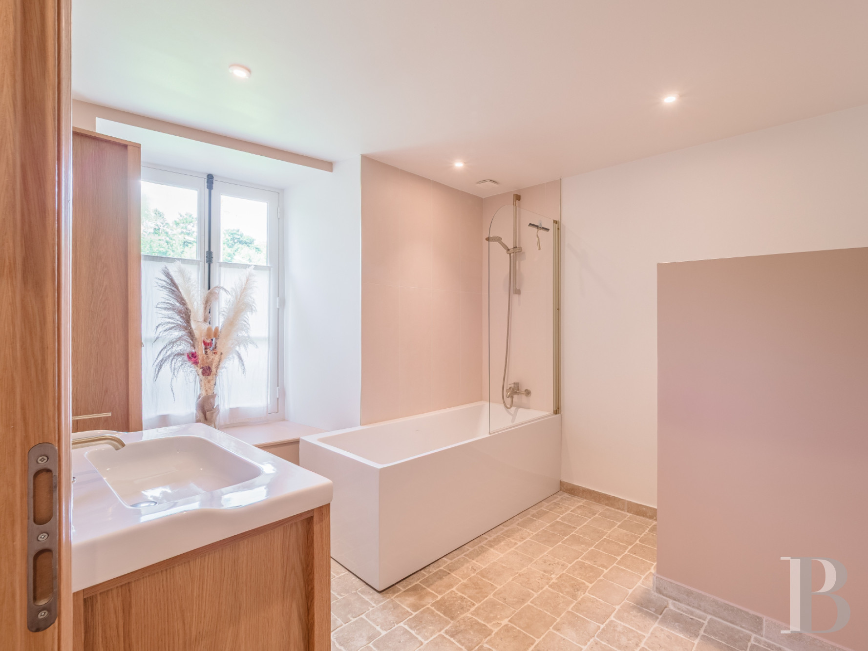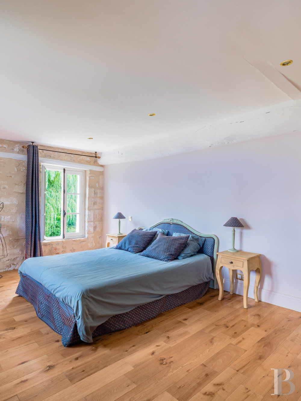 The first floor is organised around an open landing showcased by a dual-aspect stairwell that brings light and depth. A wooden spiral staircase with a metal balustrade and solid steps with a patina of time stands out as the building’s centrepiece. From the landing, two corridors with exposed beams and exposed stonework connect to the bedrooms and bathrooms. There are four bedrooms, two bathrooms with a lavatory, and a suite with a bedroom, a walk-in wardrobe and a private shower room. Wood strip flooring extends across most of the rooms. The bathroom floors have old terracotta tiles.