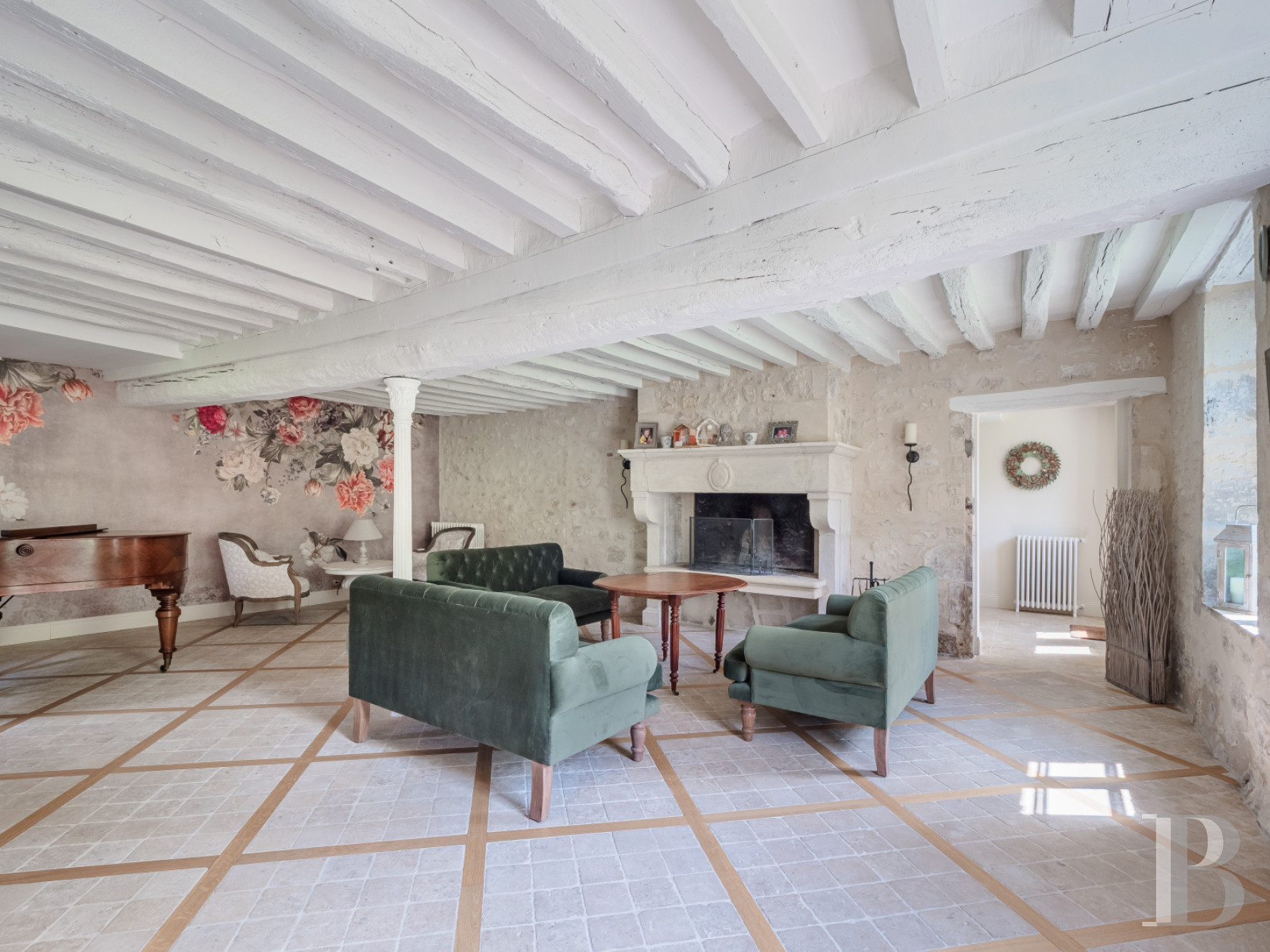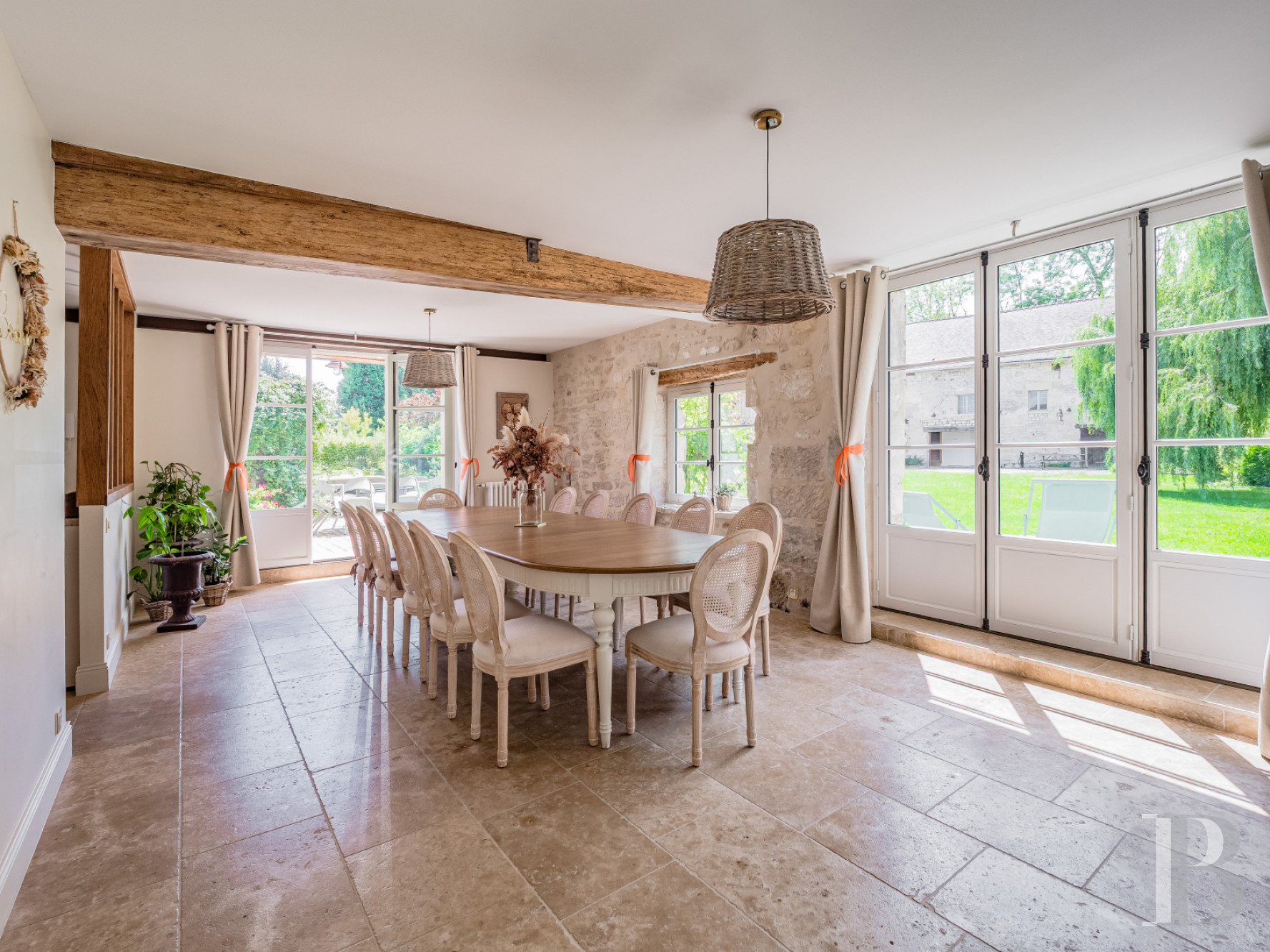 Travertine tiles cover all the floors on this lower level. There are two separate entrance halls. One of them leads in from the road and can be reached from the conservatory between the house and the garages. This garden-facing conservatory forms a direct link between the outside, the kitchen and the utility room, which adjoins the former looseboxes. The other entrance hall leads in from the garden and has a cloakroom and storage spaces. It connects to the different rooms on the ground floor. The kitchen, a separate room, is fully fitted. This spacious kitchen is bathed in natural light from a glazed wall that separates it from the dining room. This dining room is a vast reception room with large windows. Its exposed beams and exposed stonework underline its old character. Beyond it, there is a spacious lounge with a large-hearth stone fireplace. Its exposed ceiling beams and stone floor are showcased by the natural light that floods into it from even windows.