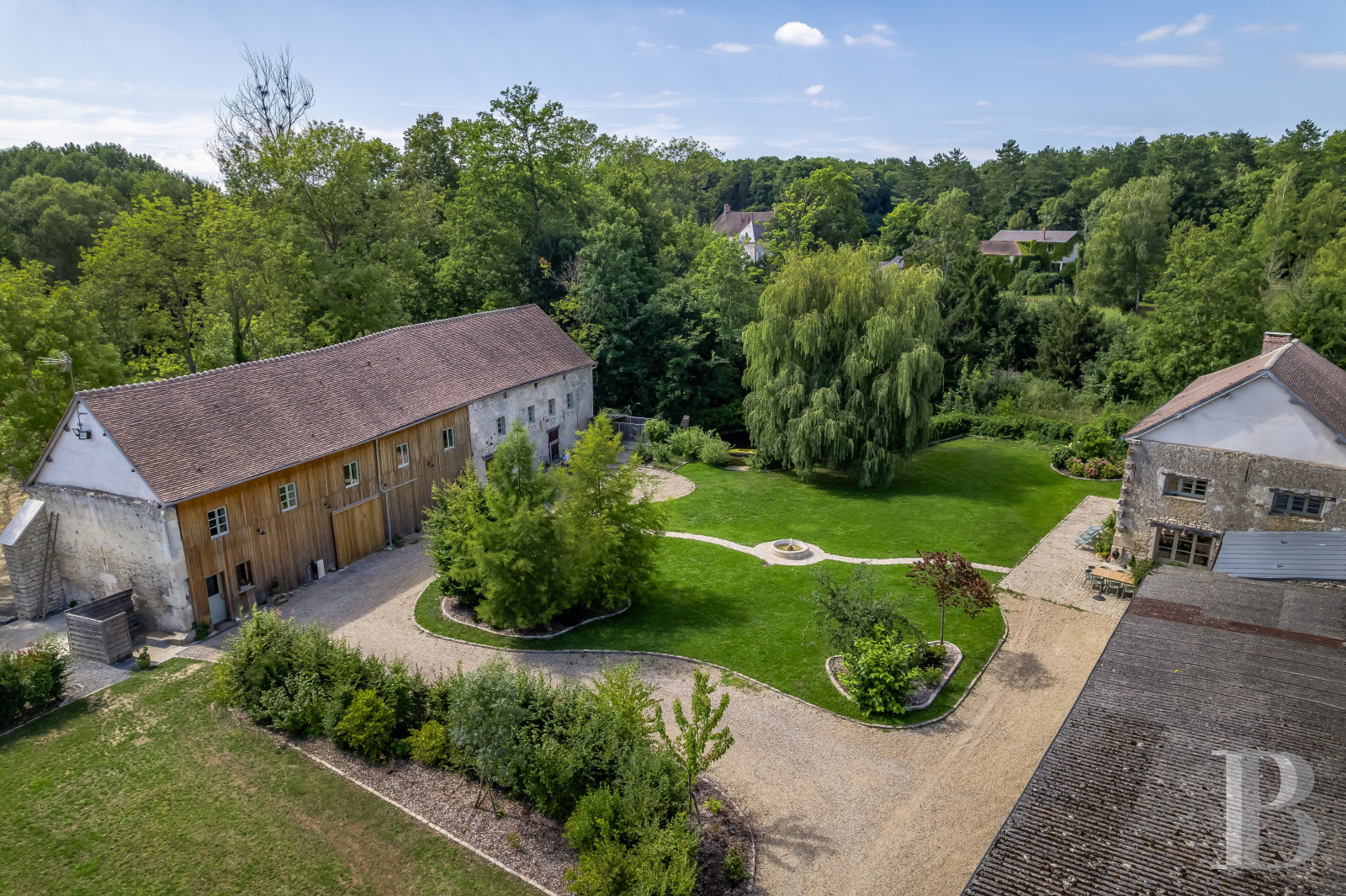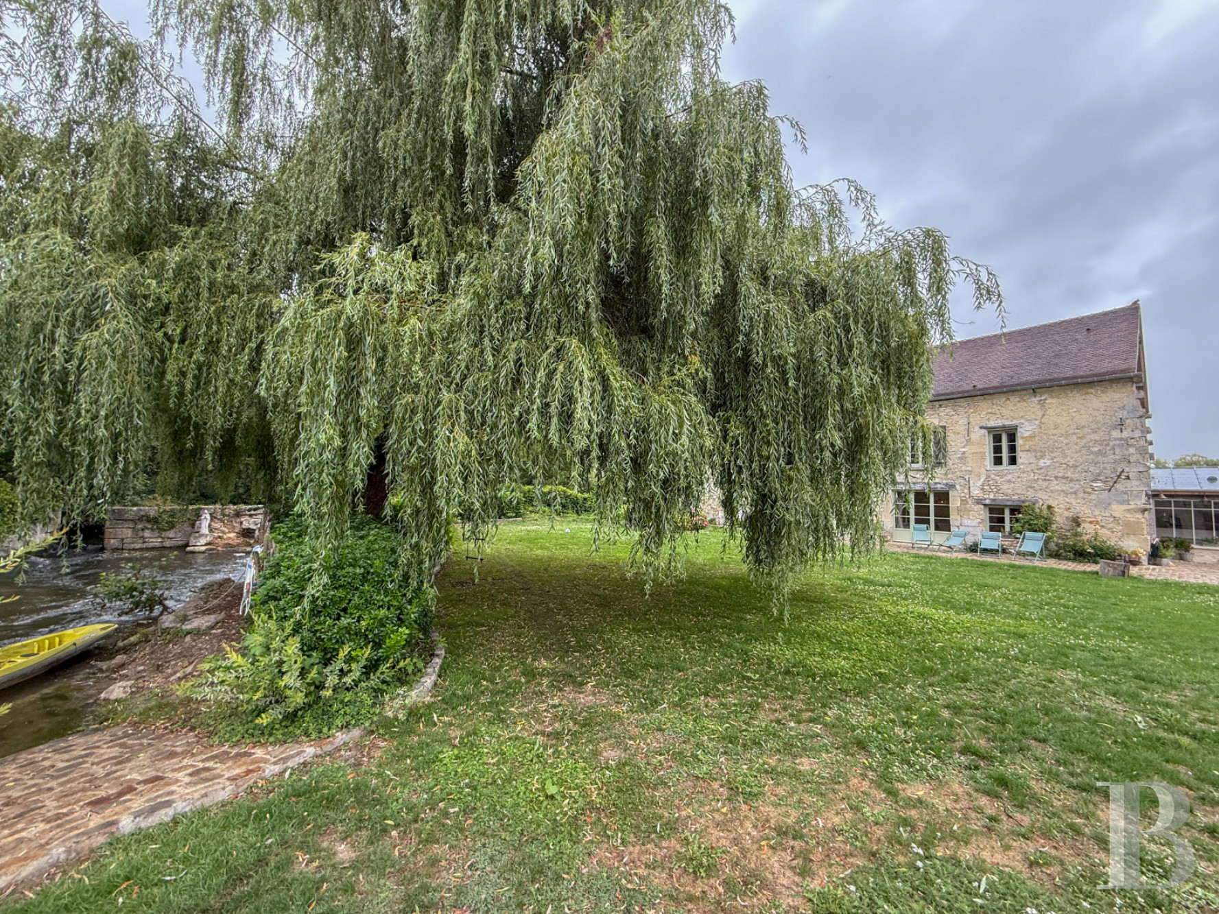The landscaped garden covers 4,328m² and is enclosed with tall walls. It is entirely walled and is organised into lawns dotted with trees and shrubs. Gravel paths run through it, linking the watermill to the converted barn. This beautiful garden has a hushed atmosphere. It features a majestic weeping willow, which has become the place’s centrepiece. The river, which flows along one edge of the garden and discreetly runs through the property, has a beach from where you can go swimming or canoeing.