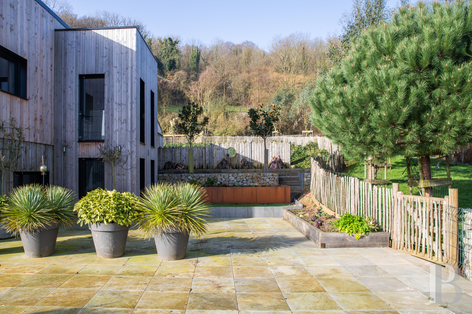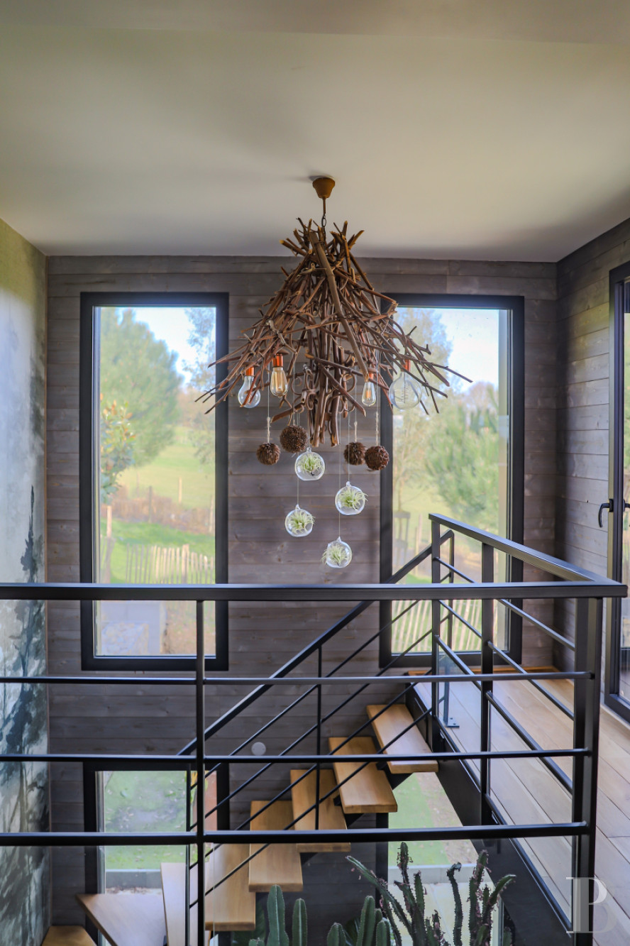 Although the dwelling is not visible from its gate, hidden by the property’s contours, it suddenly appears around a hairpin bend, while its design, both large and geometric, features a wood-clad silhouette punctuated by wraparound windows. Perched on a hill, the two-storey dwelling clearly stands out against the surrounding bucolic countryside and gives on to an interior courtyard to the west, whereas its northern entrance opens on to a staircase tower reinterpreted with a modern look.