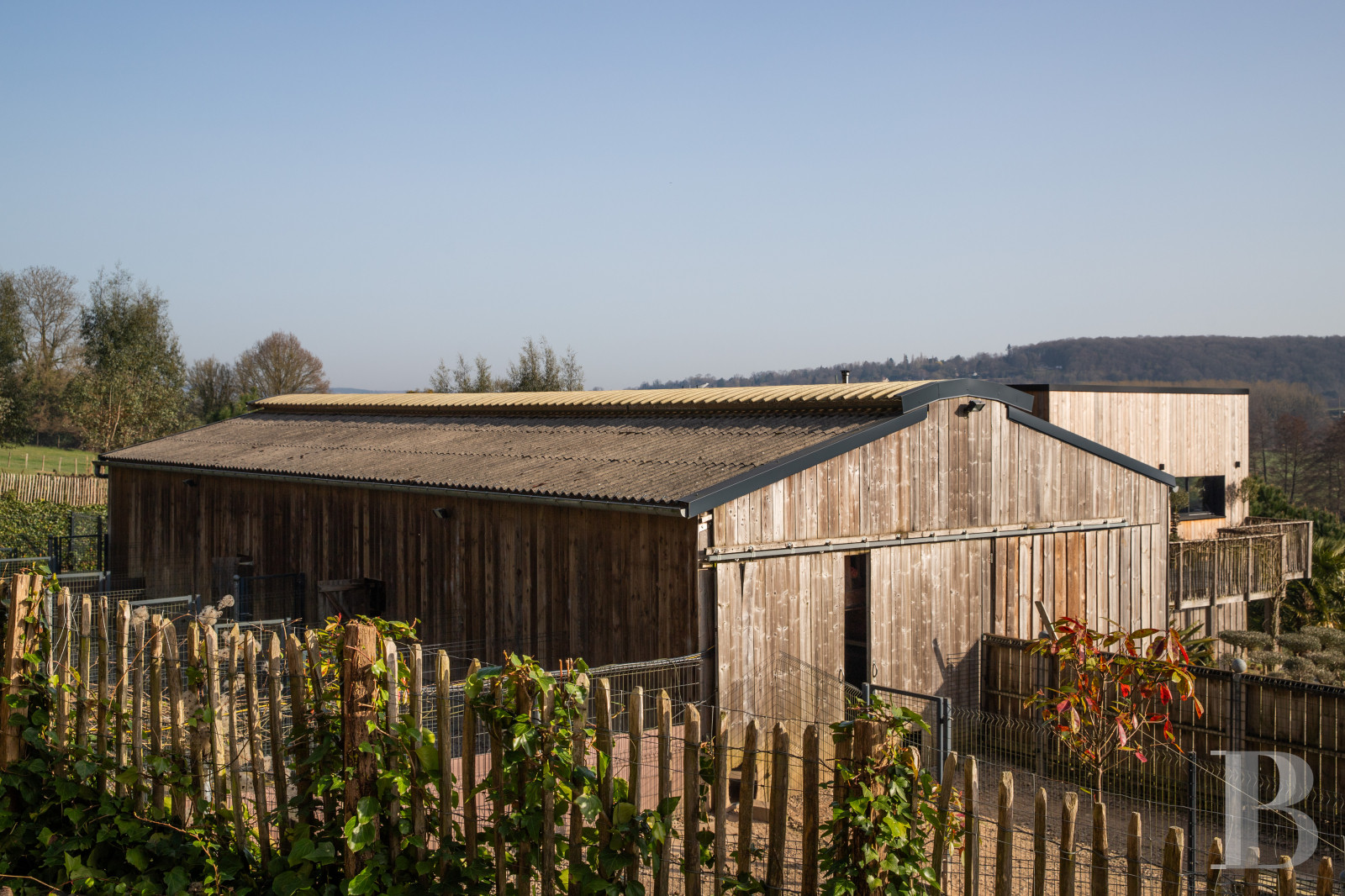 With its exteriors combining vertical wooden cladding, understated metallic details, large south-facing picture windows as well as carefully chosen views to the west and the valley, the well-defined edges of its walls and roofline highlight the edifice’s minimalist character, while, surrounded by outbuildings, patios, manicured vegetation and paths, beyond the dwelling, immense buildings and an enclosure are used for the current occupants’ dog-breeding business.