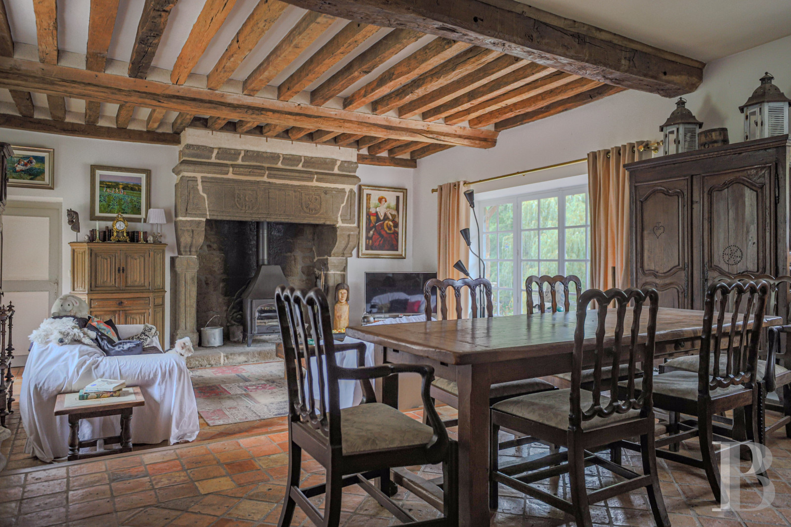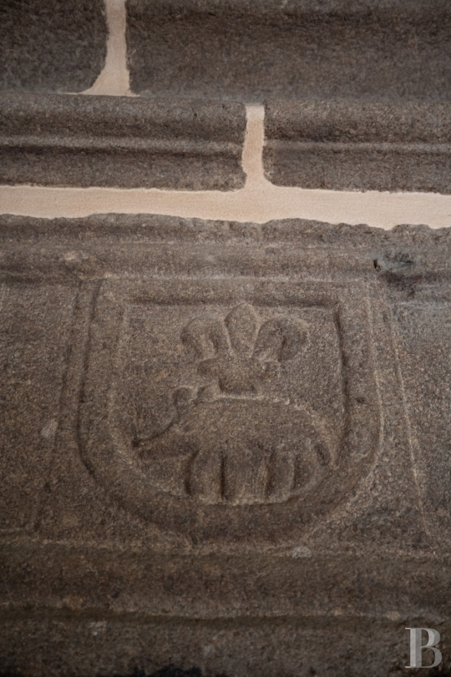 In addition, the living room, made up of two different spaces and separated by a couple of steps, opens on to the garden to the west via an immense picture window, whereas an impressive and massive sculpted granite fireplace abuts its back wall and features corbels with graceful scroll patterns, which dialogue with its chiselled coats of arms. Lastly, behind the living room, a cosy study boasts a number of cupboards as well as a lavatory and faces the courtyard and garden to the south.