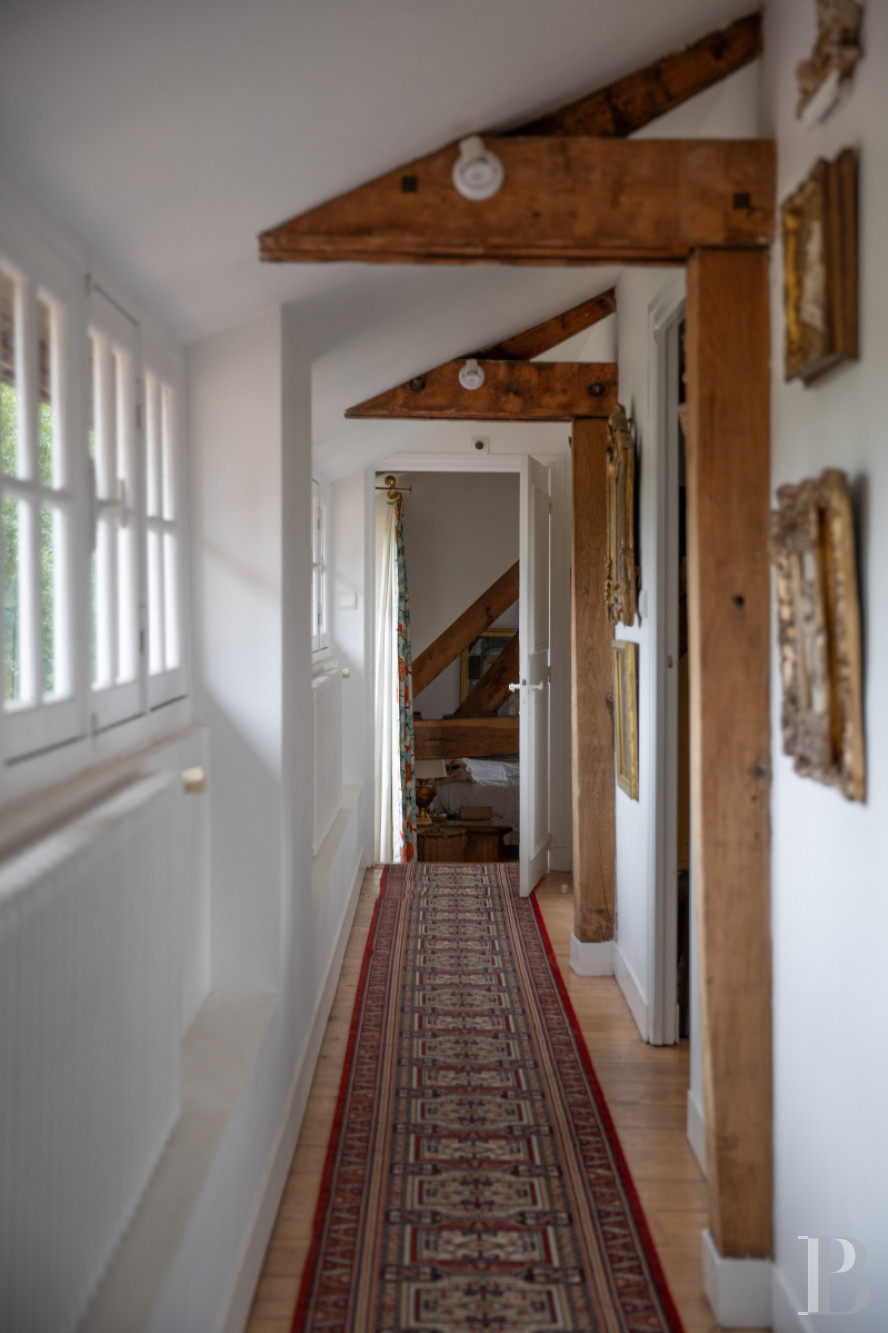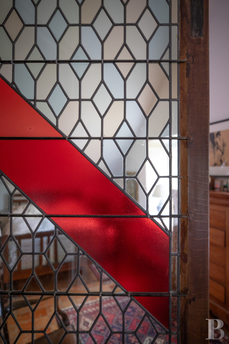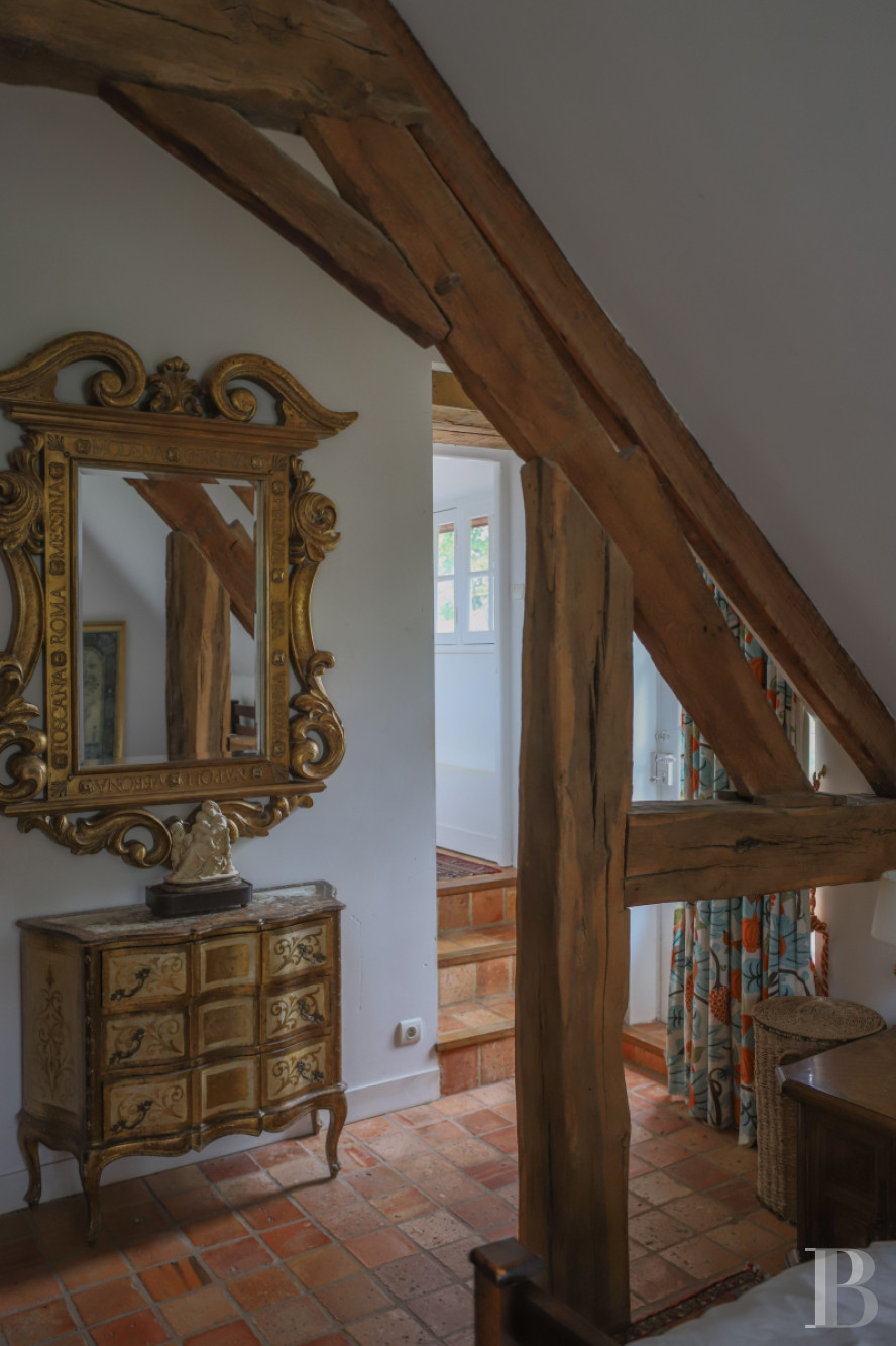 Accessible from the staircase, with terracotta tile steps, the landing provides access to a shared bathroom, a bedroom and the gallery. As for the bedroom, immense in size, it features terracotta floor tiles, dormer windows on either side as well as visible wooden rafters, while the gallery, drenched in light thanks to its succession of windows, has hardwood floors and provides access to a lavatory as well as two bedrooms with westward-facing dormers. At one end of the gallery, after descending a few steps, the main bedroom, facing south thanks to two windows on the dwelling’s gable end, abuts a private bathroom, separated from the bedroom by a stained glass door.