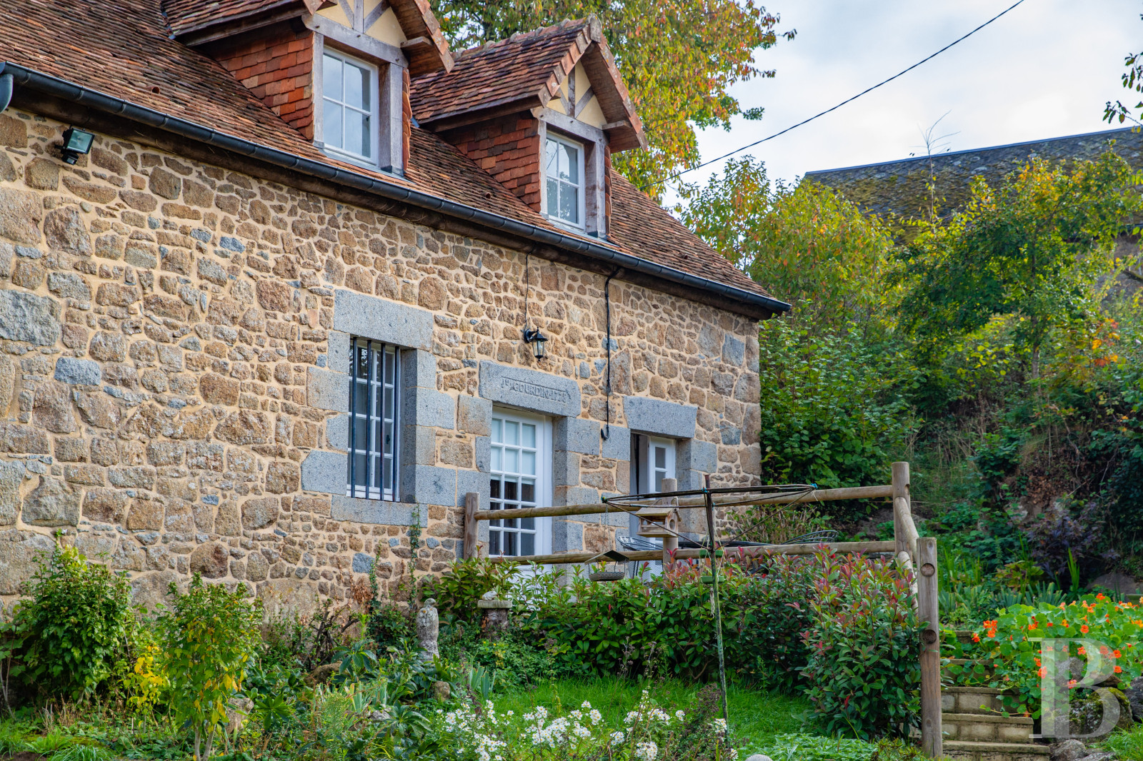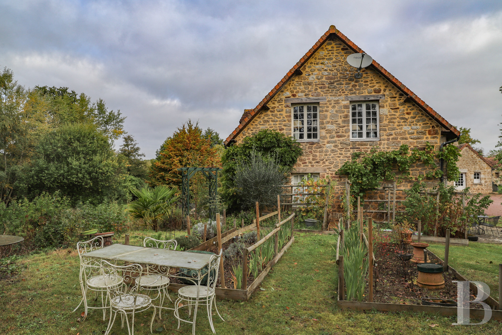 Facing east-west, the two-storey main dwelling features a pointed stone exterior on its courtyard side, which is, in turn, cadenced by wood-framed windows as well as dormers on its red tile roof. Behind, on the house’s western side, glass double doors open on to a patio festooned with a grapevine as well as a garden planted with trees, providing unobstructed views overlooking a stream, the latter of which is traversable via a small bridge and winds its way through the garden, flowing over small waterfalls and irrigating aquatic vegetation, such as horsetails and reeds.
