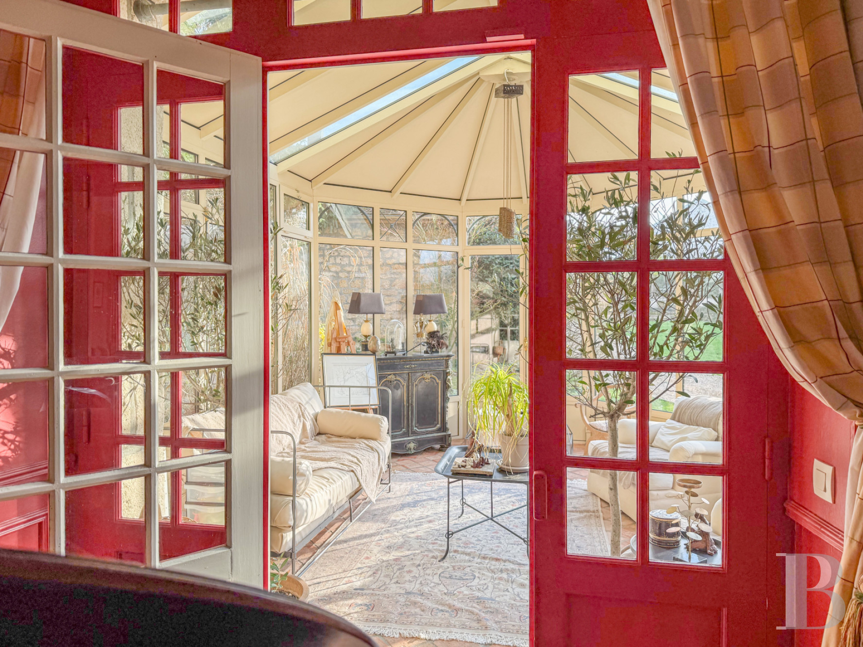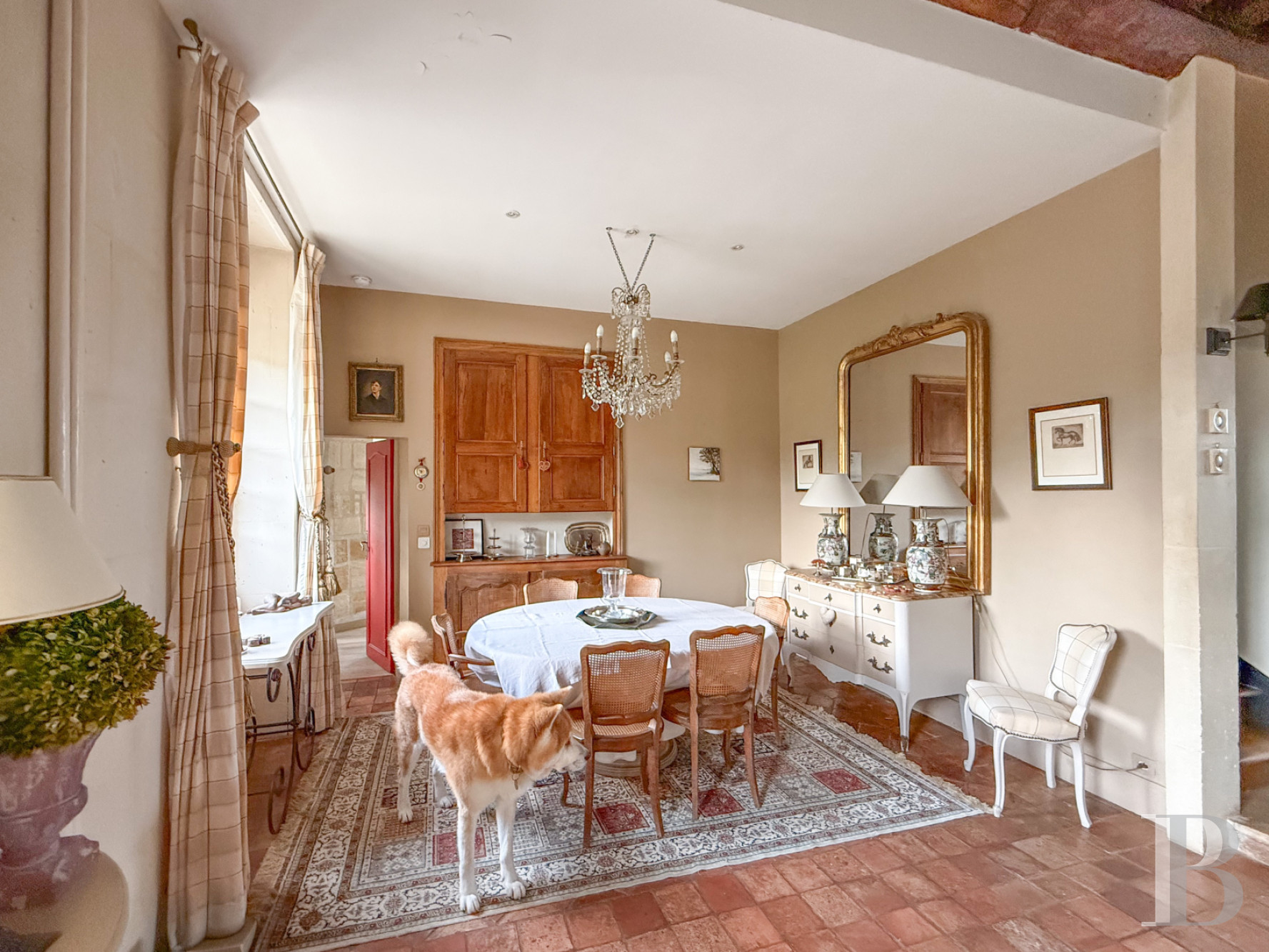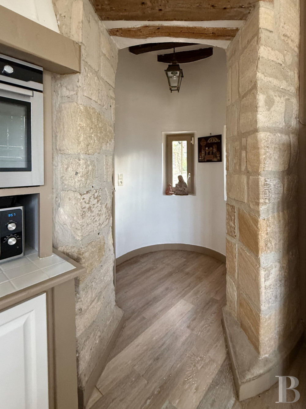 Beyond the entrance hall, several connecting reception rooms extend beneath ceilings of exposed beams. They have terracotta-tiled floors. On one side, there is a first lounge with a large stone fireplace. It is filled with natural light from several garden-facing windows. Beyond it there is a second lounge with dark red walls and a more hushed atmosphere. It has a large in-built series of wooden bookshelves. This room connects straight to the conservatory, which forms an intermediate area leading outside. This entirely glazed room extends the reception rooms and leads out to the walled garden and vegetation. On the other side of the entrance hall, there is a dining room in a central position. It connects to a kitchen via a passageway created in the adjoining round tower. This round space showcases the old stonework and the true thickness of the walls. The kitchen is spacious and filled with natural light. It leads straight outside. A scullery, which serves as a utility room, lies beside a lavatory. Beyond it, a corridor connects to a vaulted cellar and leads to the lounge with a fireplace. From this lounge, a wooden staircase leads upstairs.