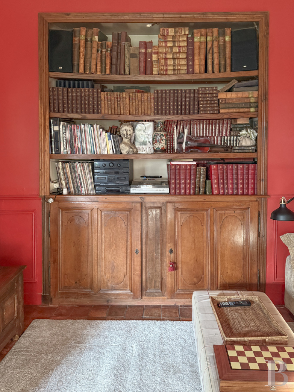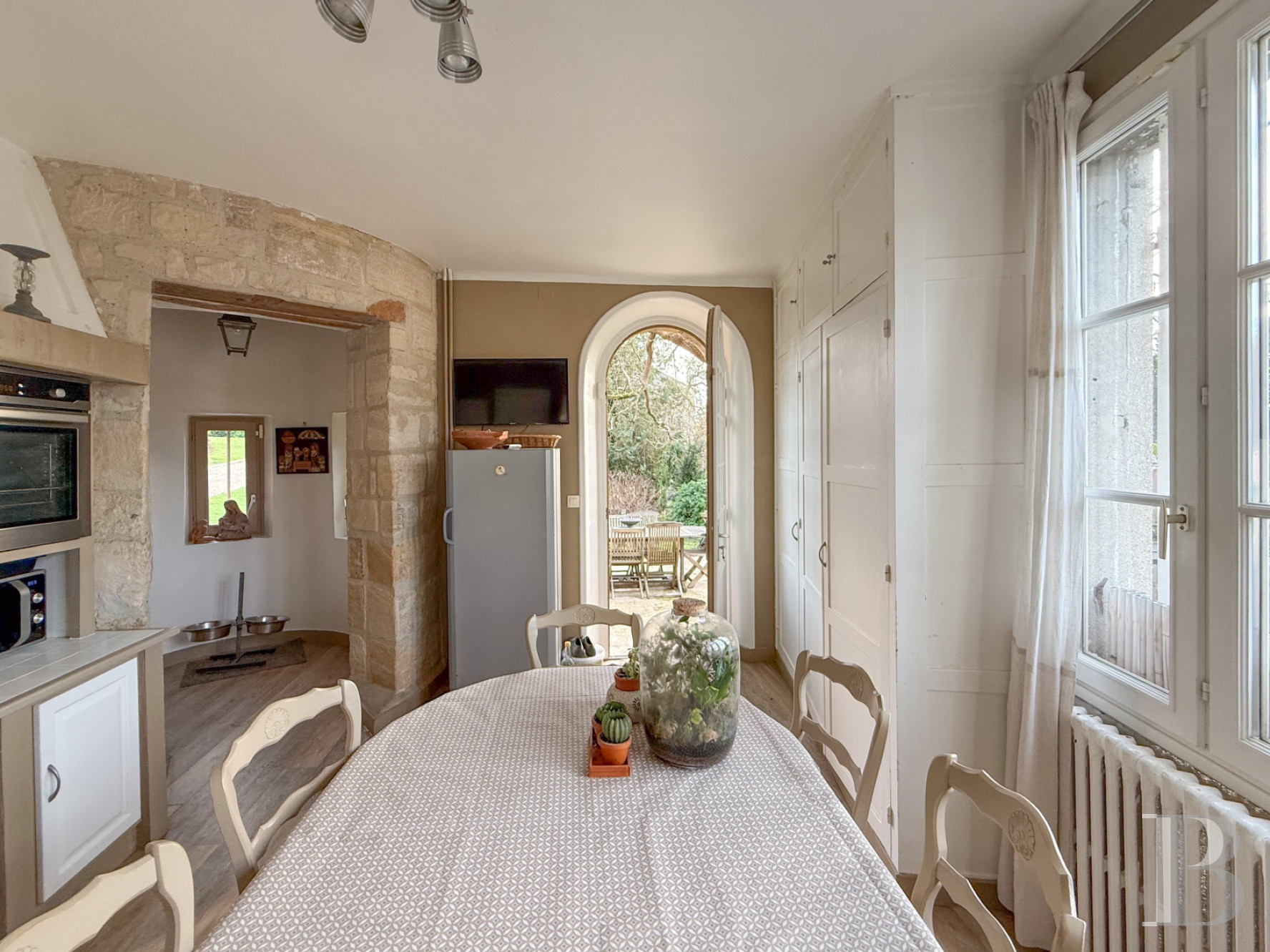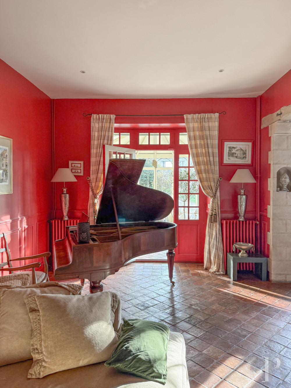 Beyond the entrance hall, several connecting reception rooms extend beneath ceilings of exposed beams. They have terracotta-tiled floors. On one side, there is a first lounge with a large stone fireplace. It is filled with natural light from several garden-facing windows. Beyond it there is a second lounge with dark red walls and a more hushed atmosphere. It has a large in-built series of wooden bookshelves. This room connects straight to the conservatory, which forms an intermediate area leading outside. This entirely glazed room extends the reception rooms and leads out to the walled garden and vegetation. On the other side of the entrance hall, there is a dining room in a central position. It connects to a kitchen via a passageway created in the adjoining round tower. This round space showcases the old stonework and the true thickness of the walls. The kitchen is spacious and filled with natural light. It leads straight outside. A scullery, which serves as a utility room, lies beside a lavatory. Beyond it, a corridor connects to a vaulted cellar and leads to the lounge with a fireplace. From this lounge, a wooden staircase leads upstairs.
