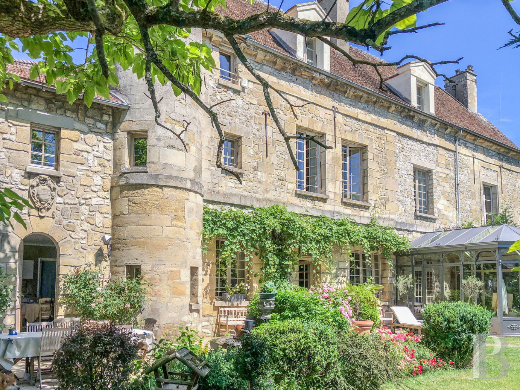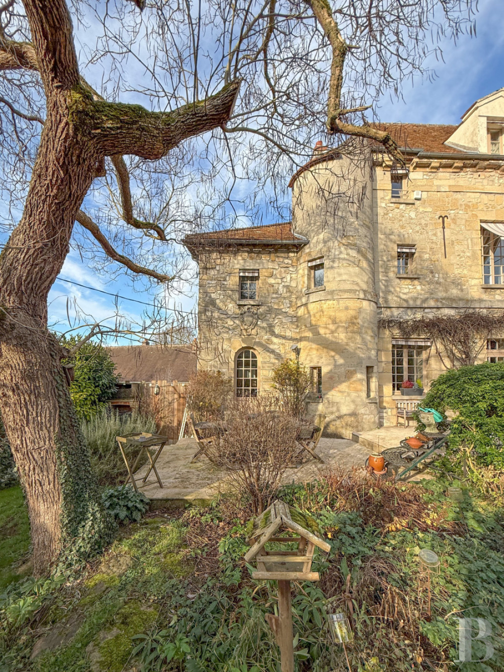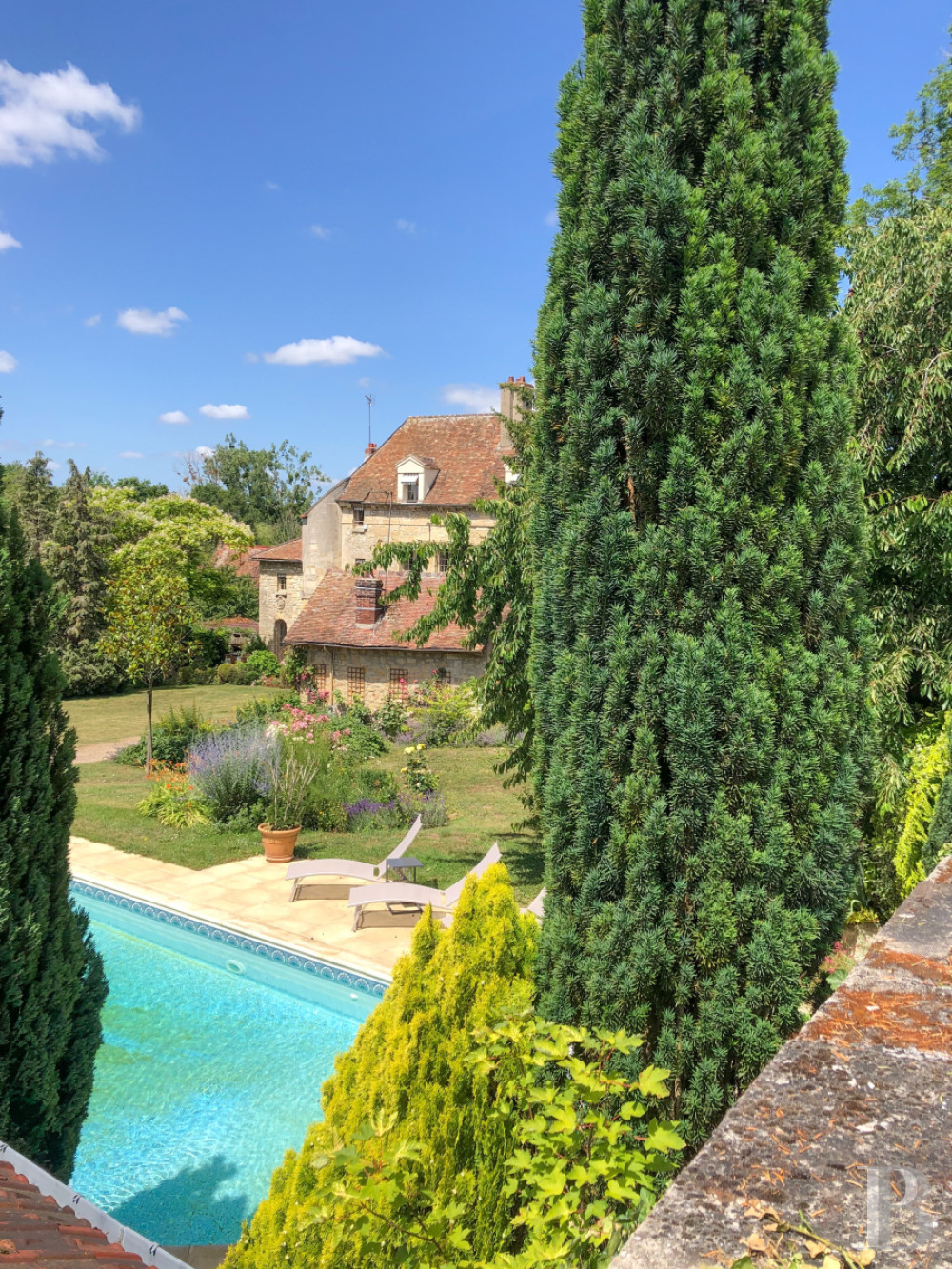 In front of the entrance, an orchard extends along the edge of the plot. There are two looseboxes here, beside one of the outbuildings. A covered carriage entrance leads to a space where the grand dwelling with its adjoining tower stands. The outbuildings, lower down, punctuate the edges and suggest the layout of a little farm complex. The self-contained secondary dwellings are positioned so as to preserve privacy. Their doors and facades face the outside of the plot and the sides of the court, yet without being overlooked and without gazes directed at the main house. Only the small guesthouse stands near the main edifice. The garden is divided into several sections with a lawn, clusters of plants, shrubs and tall trees. A terrace edges the wall of the main house and extends to the conservatory. Lastly, a swimming pool, hidden behind hedges and the surrounding vegetation, is set back within the garden.