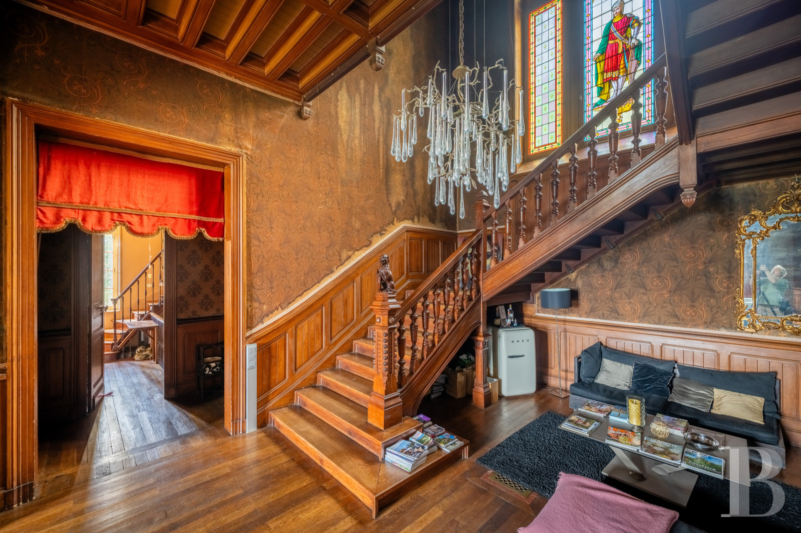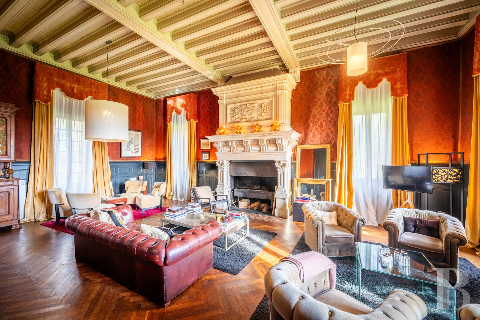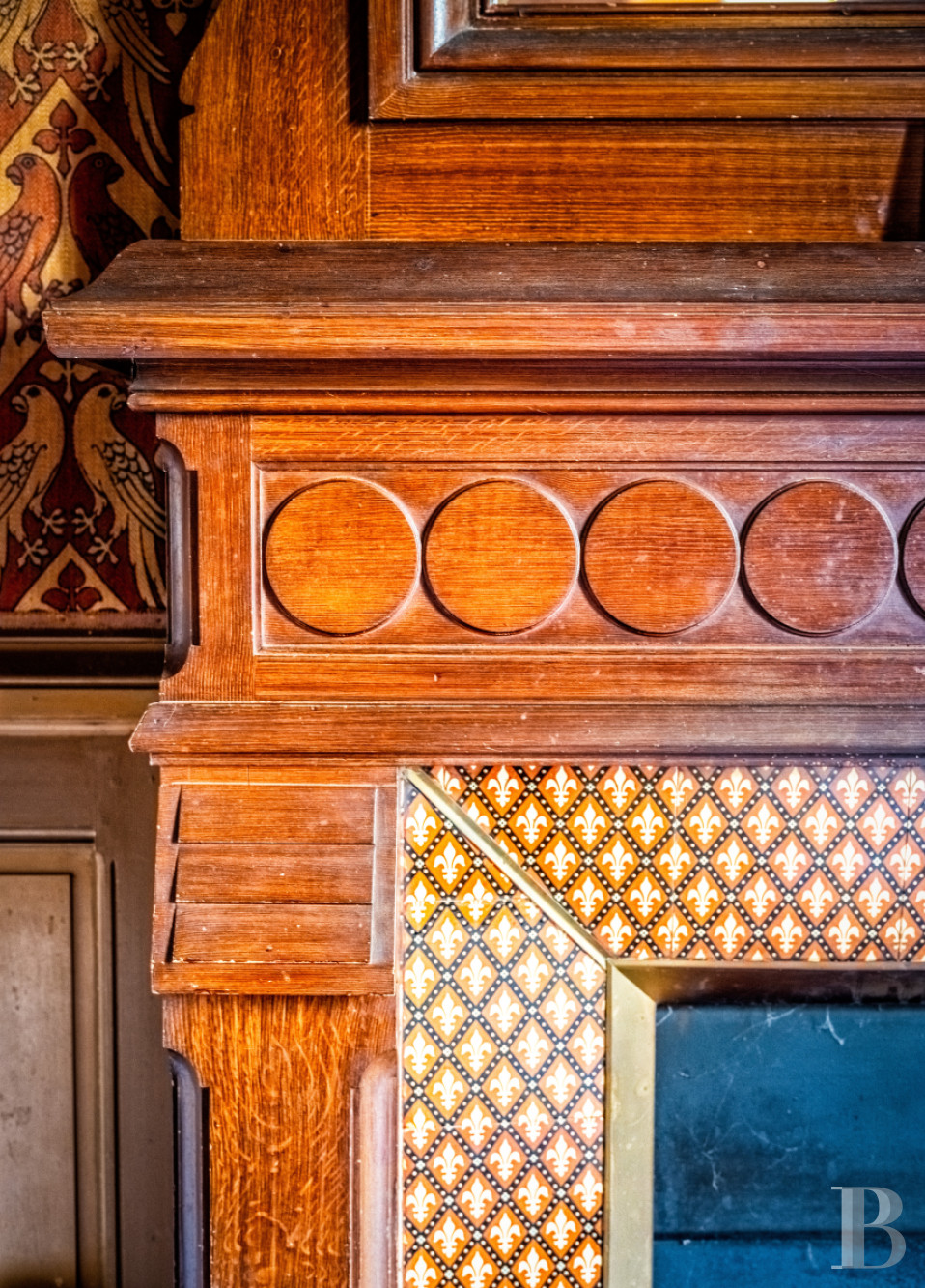 The dual-aspect entrance hall is spacious. It connects to the different reception rooms. There is a dining room with a French-style beamed ceiling and chevron parquet. A bay window bathes the room in natural light. A hidden door that is flush with wall surface leads to a flight of backstairs. There is a billiard room with floral-patterned cement tiles, a wooden fireplace adorned with ceramic tiles painted with fleurs-de-lys motifs, walls decorated with historical fabric wallpaper depicting parrots, and a remarkable coffered ceiling. French windows lead out onto a northern terrace. Five windows fill the lounge with natural light. The lounge’s majestic fireplace, made of Saint-Astier stone, mirrors that in the dining room through its antique-inspired style. One fireplace represents flames and a dragon. The other one symbolises abundance through an ear of wheat.