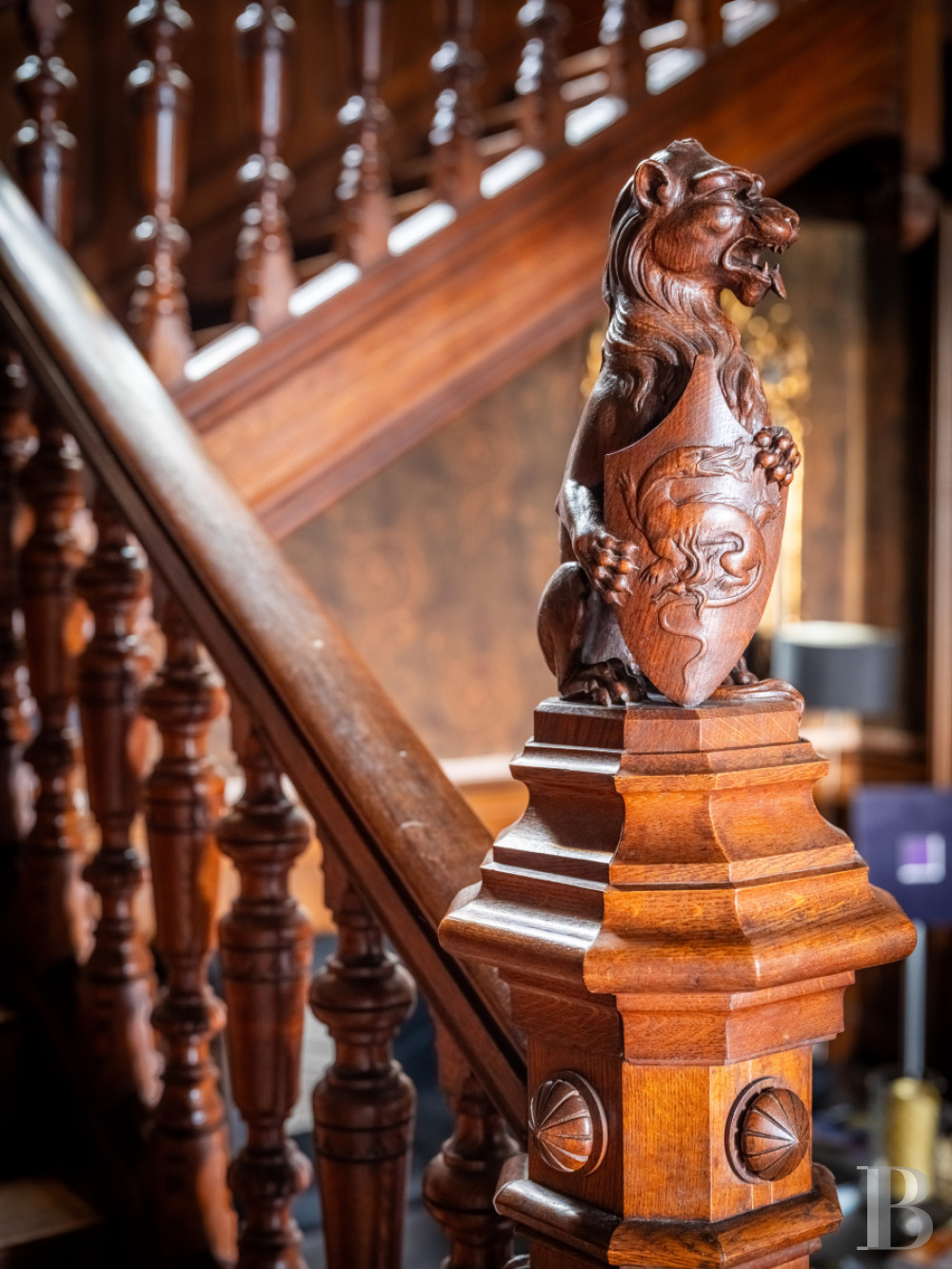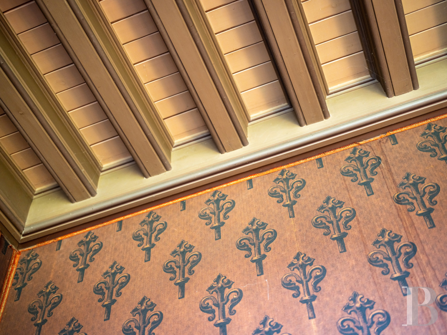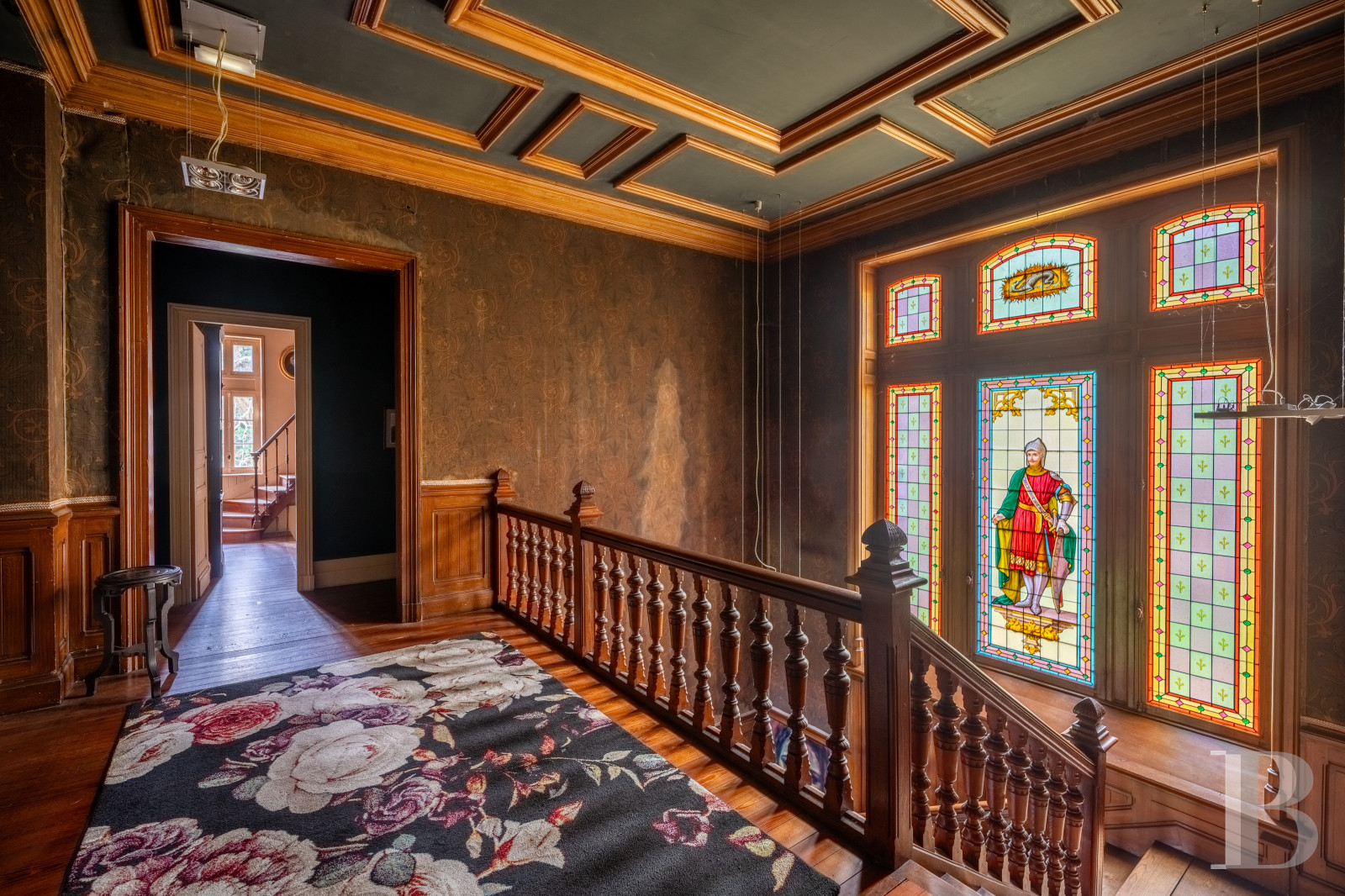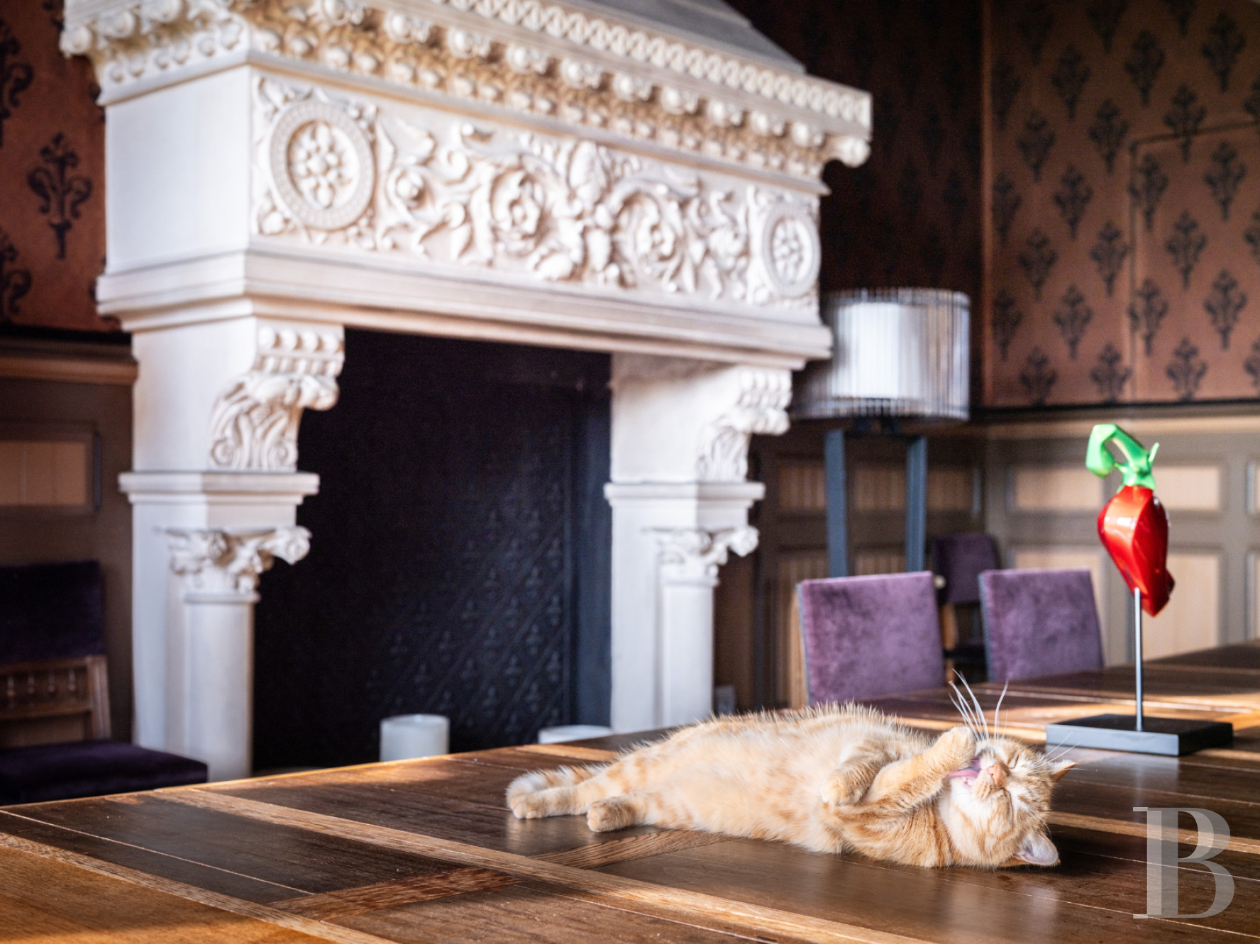 The dual-aspect entrance hall is spacious. It connects to the different reception rooms. There is a dining room with a French-style beamed ceiling and chevron parquet. A bay window bathes the room in natural light. A hidden door that is flush with wall surface leads to a flight of backstairs. There is a billiard room with floral-patterned cement tiles, a wooden fireplace adorned with ceramic tiles painted with fleurs-de-lys motifs, walls decorated with historical fabric wallpaper depicting parrots, and a remarkable coffered ceiling. French windows lead out onto a northern terrace. Five windows fill the lounge with natural light. The lounge’s majestic fireplace, made of Saint-Astier stone, mirrors that in the dining room through its antique-inspired style. One fireplace represents flames and a dragon. The other one symbolises abundance through an ear of wheat.