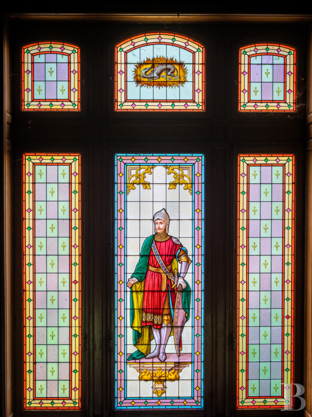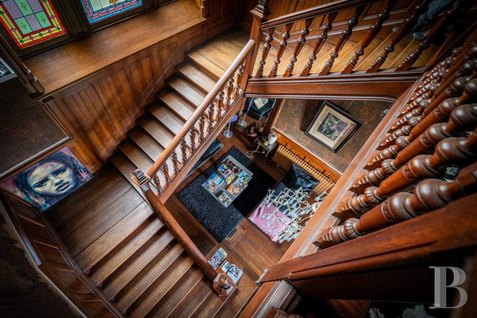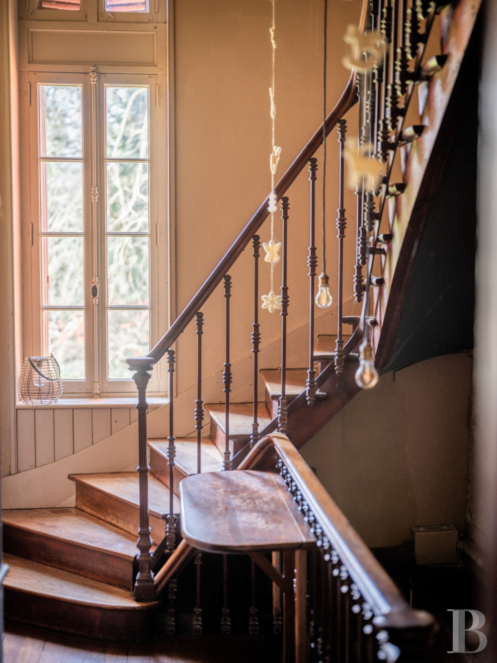 The main staircase is brightened up on the north side with an original imposing stained-glass window that dates back to 1892. In this window, the house’s original owner is depicted as a knight. The balustrade of solid wood features turned-wood balusters and, upon the starting post, a sculpted lion and dragon. This dragon is represented in six other places: on the fireplaces, the door lintels, the roof’s lightning conductor and the stained-glass window. Around the stairs, there is fabric wallpaper that was impaired by considerable water damage half a century ago. Despite this water damage, a decision to give priority to authenticity was made during the renovation, so the wallpaper has remained in its damaged state. A spacious landing connects to a flight of backstairs, a separate lavatory and four suites with bedrooms, shower rooms and a terrace upon the ground-floor bay window. Historical pinewood strip flooring extends across the rooms. Red marble fireplaces contrast with ceiling cornices and small-paned windows with Cremona bolts and fanlights. These bedrooms have been entirely renovated for guests’ comfort, with the addition of large beds, reversible air conditioning and spotlights.