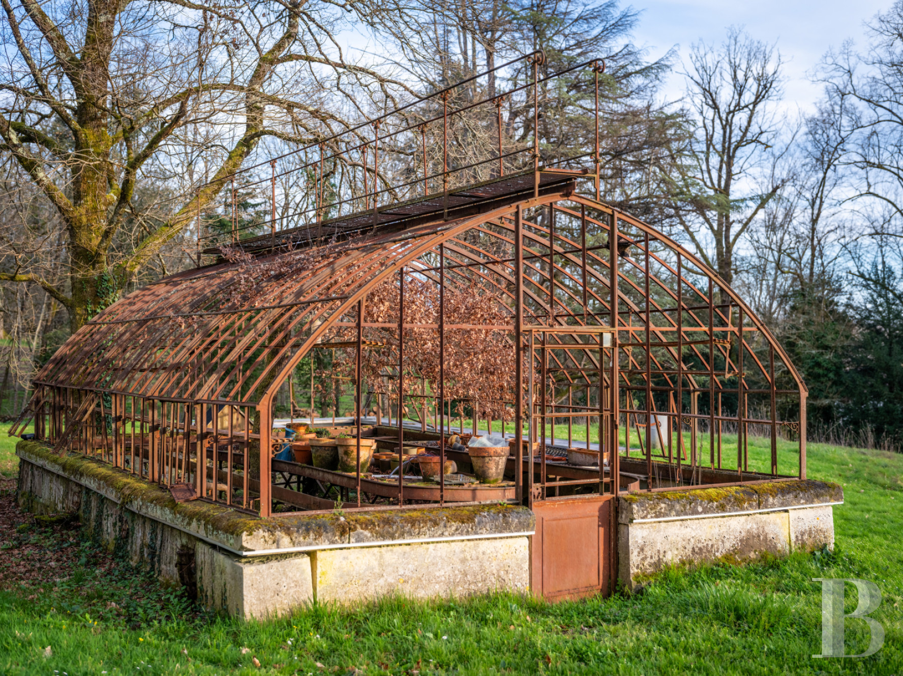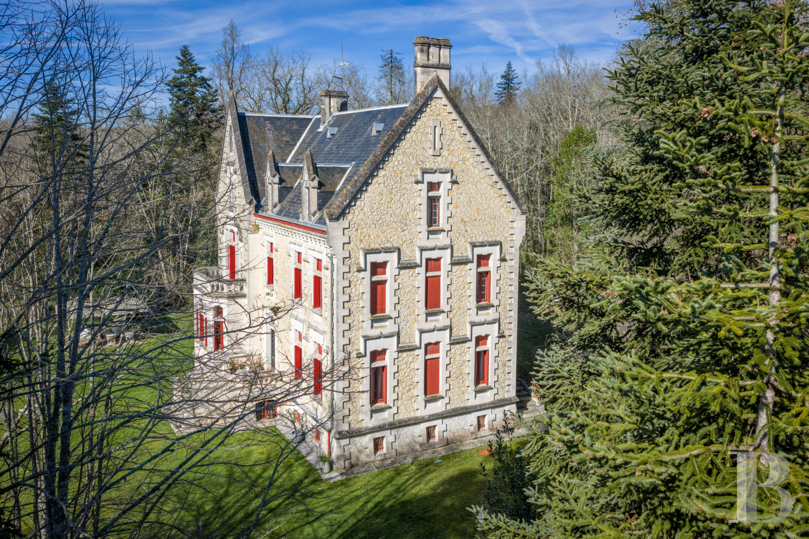 The grounds are well maintained. They have been barely transformed in order to preserve the natural character of the estate and the commanding position of the house. A 2.5-hectare meadow stretches in the foreground, extended with four hectares of woods made up of various types of trees, including pines, cedars, sequoias, maples, oaks and acacias. These trees frame broad, clear vistas of the surrounding landscape.