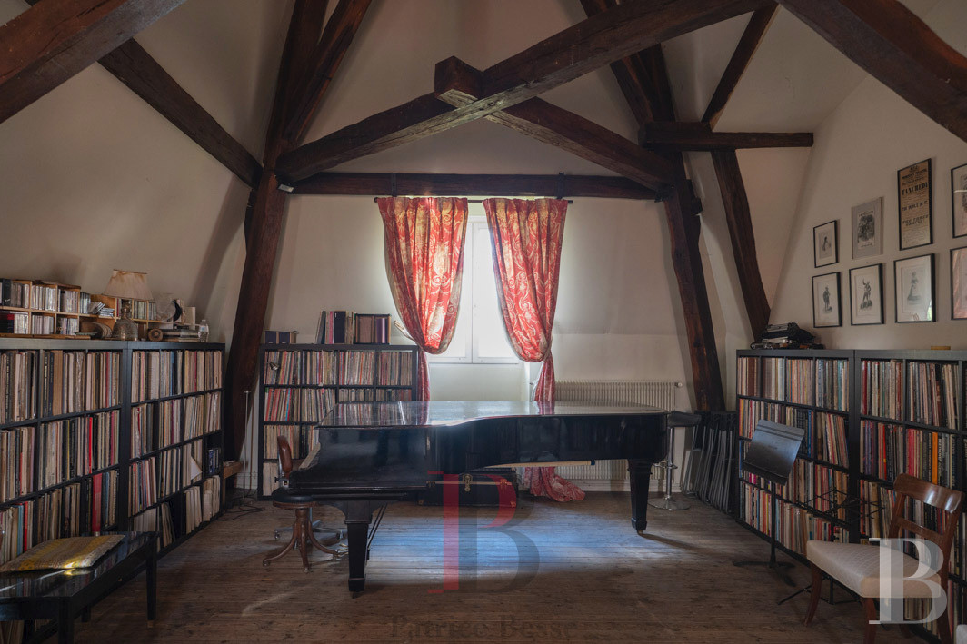 The main staircase ascends to an intermediary landing with a door that opens on to a long corridor. One end of this corridor gives on to an immense dual-aspect room, spanning the chateau’s entire width and topped with visible wooden rafters, which has been converted into a music room and features a one-of-a-kind environment thanks to its ancient wooden beams, while, directly opposite, a similar-sized space was separated into two bedrooms with two diminutive storage rooms as well as access to a small portion of the attic level with a low ceiling.