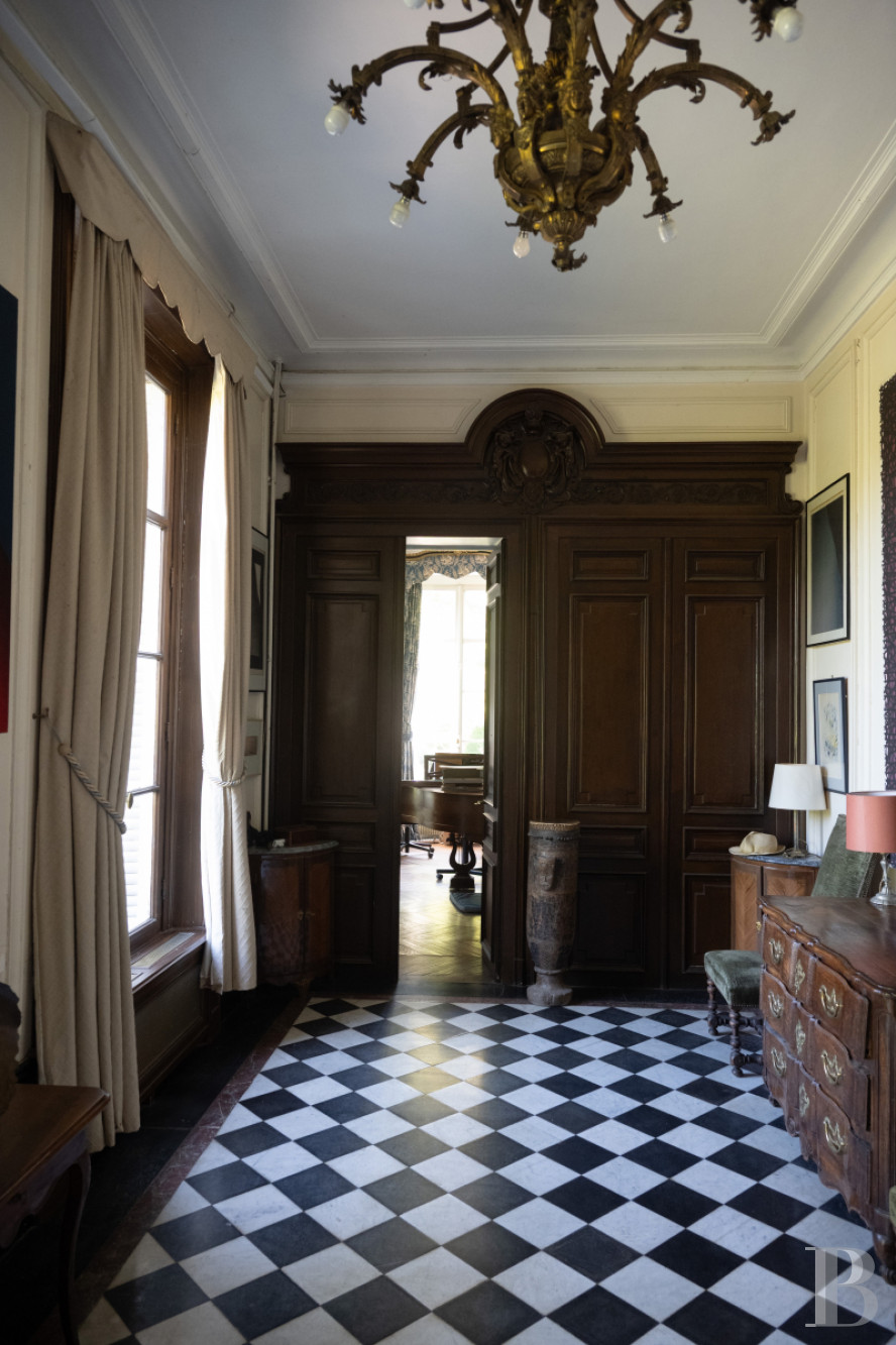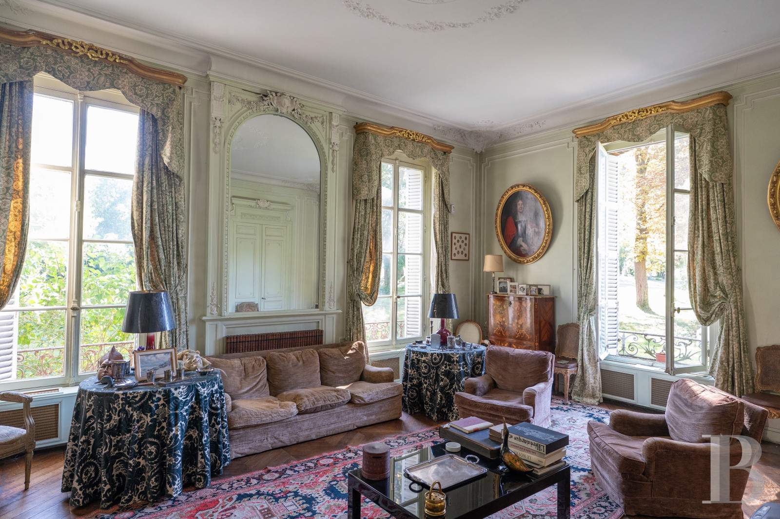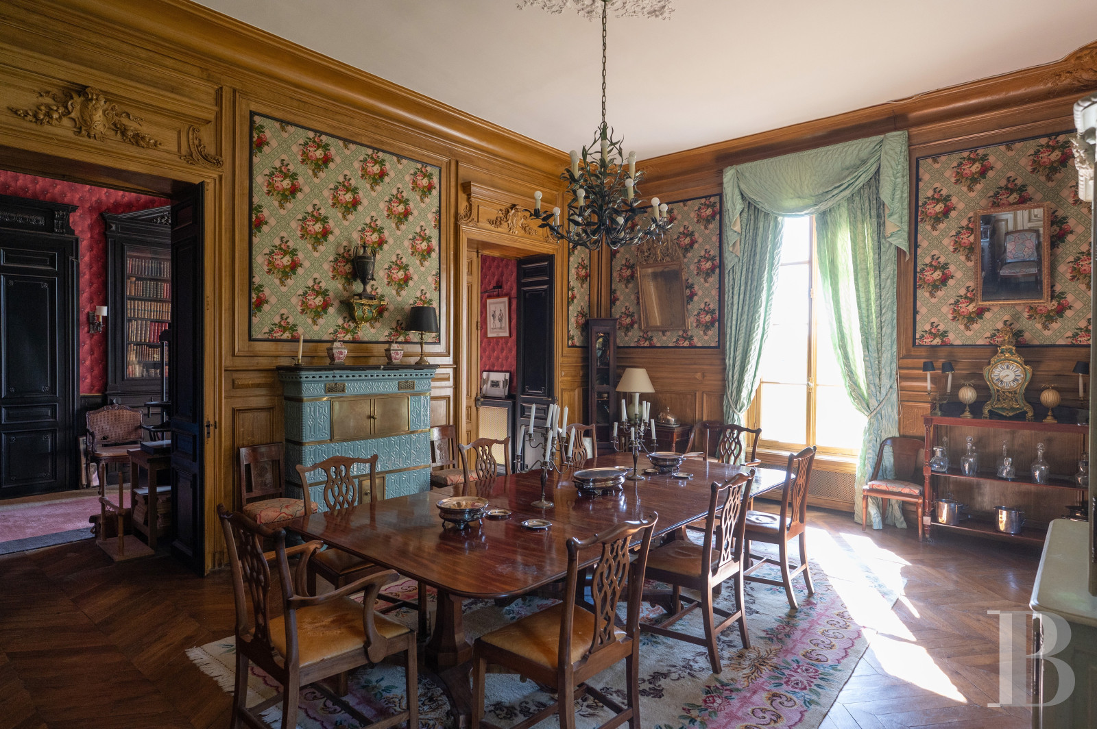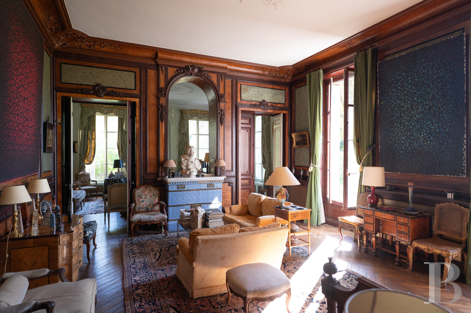 Directly opposite the entrance hall, an initial drawing room features tall windows overlooking the grounds with, in particular, glass double doors providing access to the grounds’ vast lawn. Warm-colour wood panelling, highlighted by carved chimneybreasts and ornamental panels, frame a sky-blue Austrian ceramic wood-burning stove, which provides this room with a one-of-a-kind charm, while two sets of wide double doors communicate, on the left, with a second living room. Much lighter in colour, this room is clad in pastel painted wainscoting and tall mirrors, whose reflections magnify this room’s dazzling sunlight, whereas the hearths in these two rooms have been placed back to back and the partition that normally separated them has been removed, creating a sort of upper alcove that provides a dual-aspect perspective from one end of this immense living area to the other.