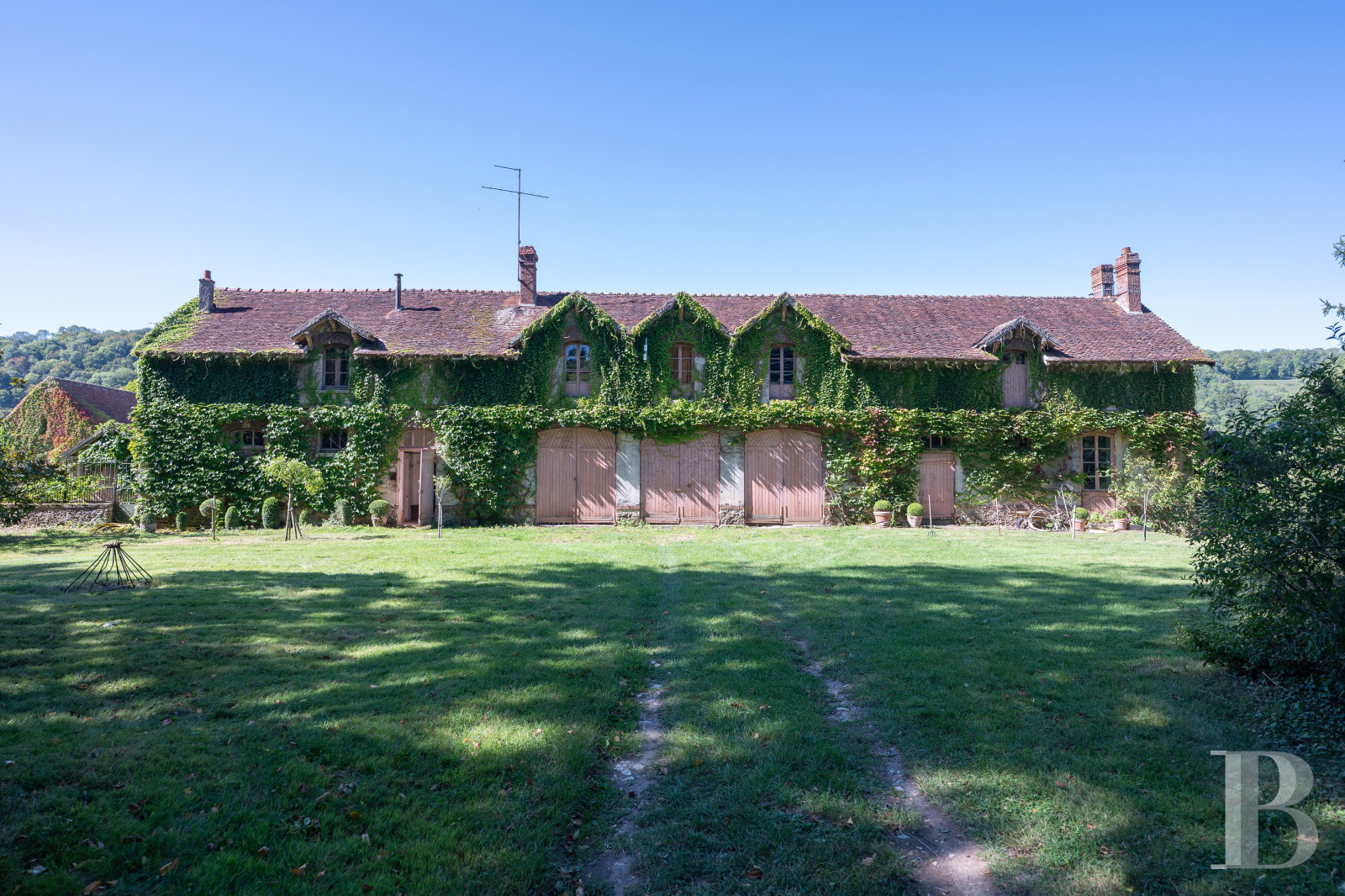 Besides the chateau, the property also features two outbuildings: the caretaker’s cottage near the entrance gate, which will need to be renovated, and, in the back of the grounds, a former stable. This long building, covered in Virginia creeper, is cadenced in the middle by three sets of large solid wooden double doors, which are, in turn, topped with three tall windows on the first floor. Back on the ground floor, the horse stalls and other spaces dedicated to equines are still in place, but are currently used as storage and a garage, while the first floor includes the former accommodations for the chateau’s personnel, which are divided into several rooms and equipped with a washbasin.