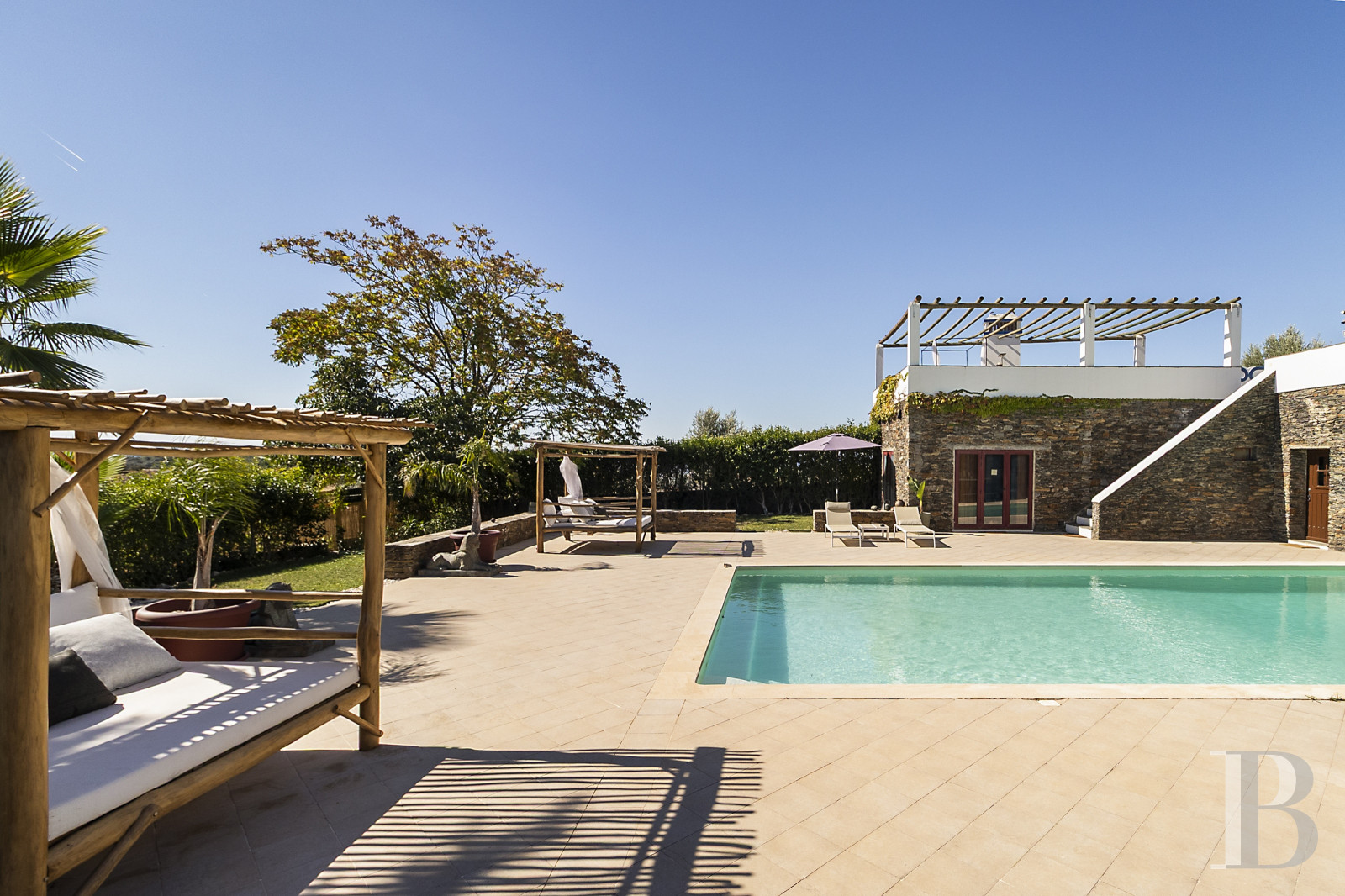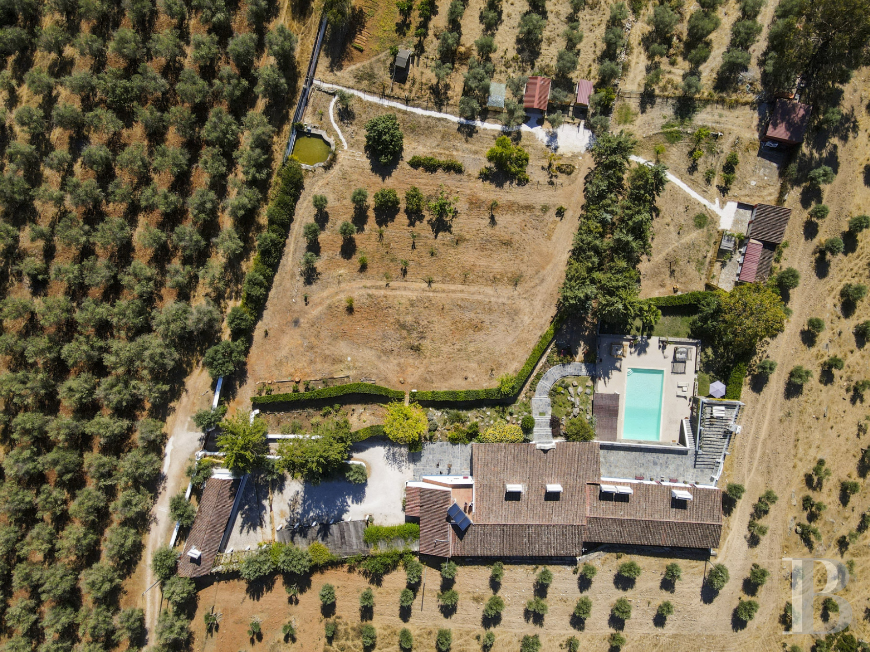 Five minutes from Estremoz, an estate built in the early 2000s brings together several traditional Alentejo dwellings around an architectural design that respects the old volumes. The complex covers nearly 500 square metres of living space, divided between a main residence organised into two wings connected by arches, a separate house and an annex near the swimming pool. Each wing has its own entrance. The four and a half hectares of hilly land feature an olive grove, an orchard and a vegetable garden irrigated by two boreholes, an old well and a pond. Water self-sufficiency allows for agricultural use without dependence on the mains supply. The proximity of Estremoz does not detract from the tranquillity of the location. With its layout and multiple spaces, the property is equally suited to family life, a hospitality project or a retirement home in the Alentejo hinterland.