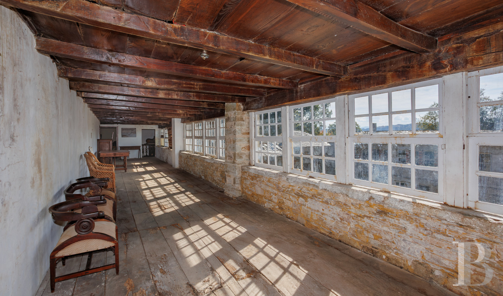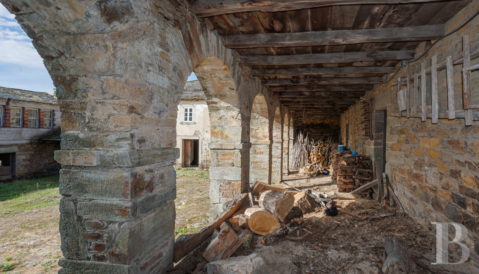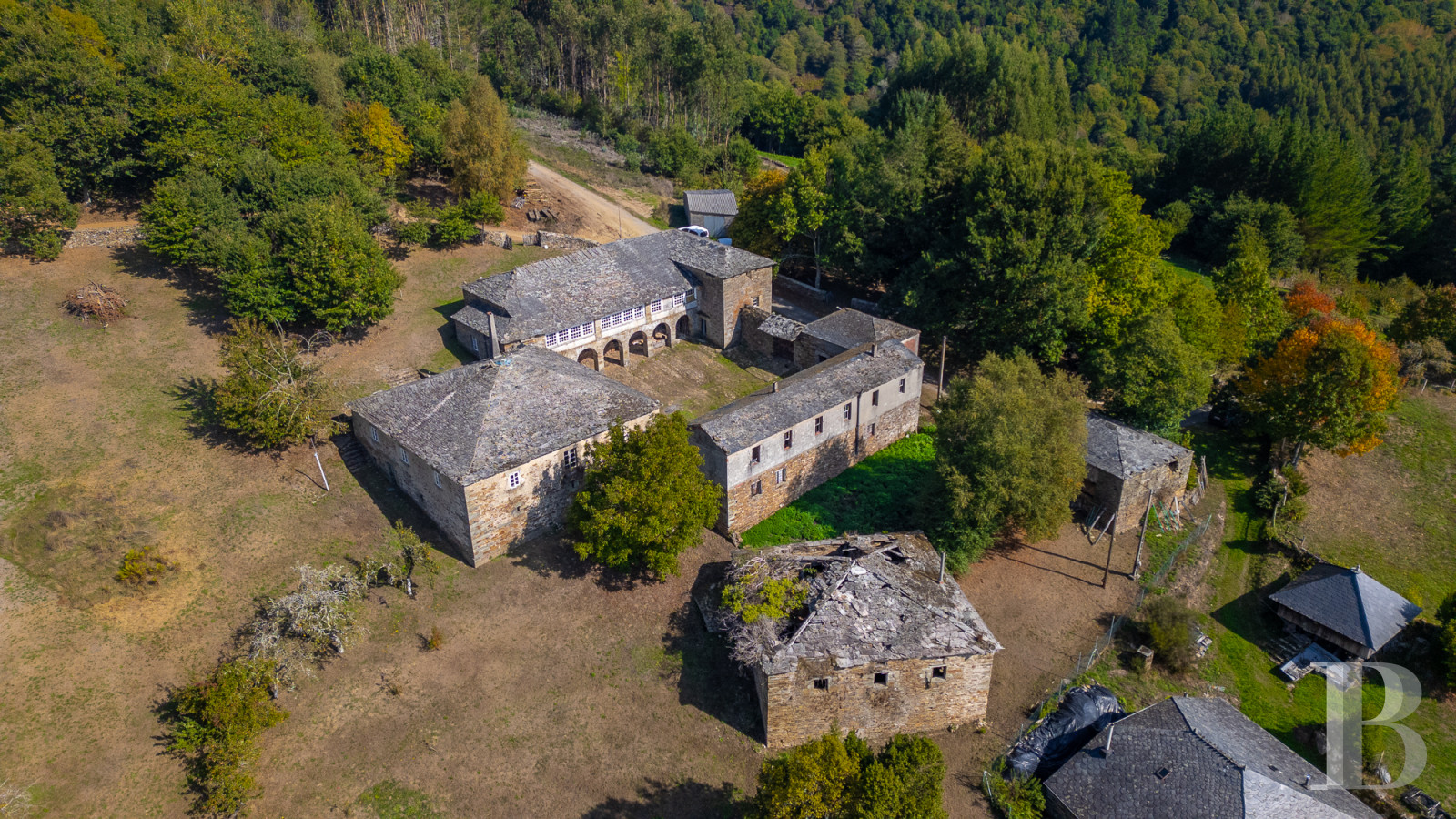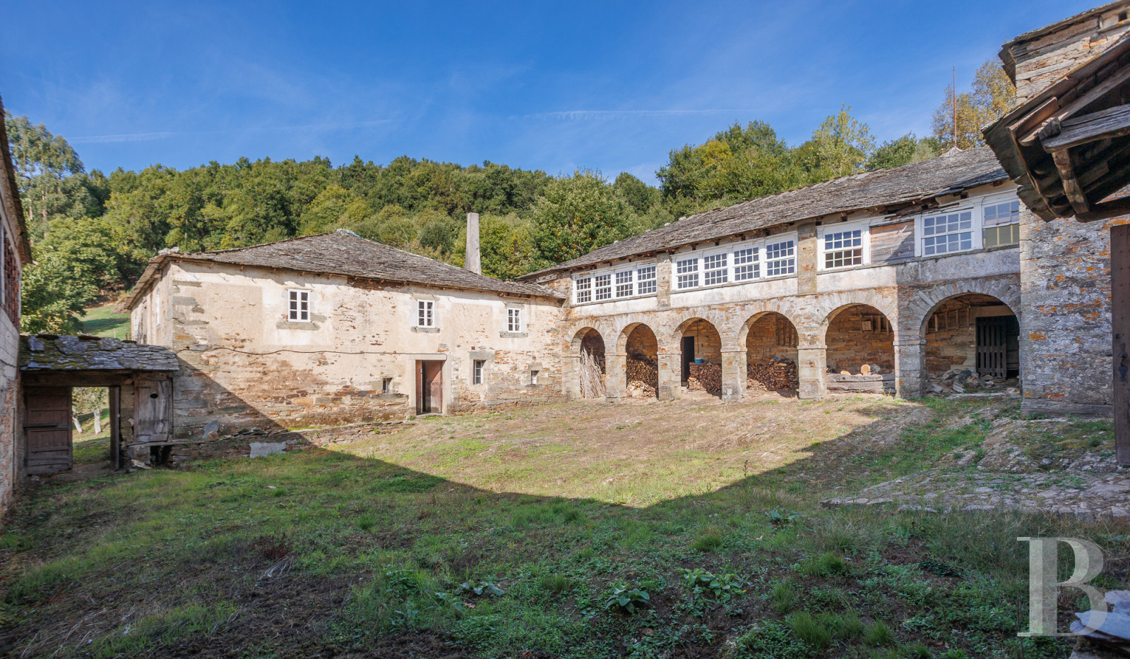 In the mountains of Lugo, a vast residence forms part of a rural architectural complex where several structures are arranged around a large inner courtyard. Houses, stables and a chapel form a complex that time has preserved, awaiting restoration. Stone arcades form a gallery surrounding the courtyard. The residential part has two living rooms, five bedrooms and a kitchen where a traditional wood-burning stove stands next to a stone sink. A caretaker's house and gently sloping grounds of over 17,500 m² planted with fruit trees complete the property. A spring runs through the grounds. This heritage site is crossed by the Primitive Way of Saint James, 60 km from Lugo and its Roman ramparts, which are listed as a World Heritage Site.