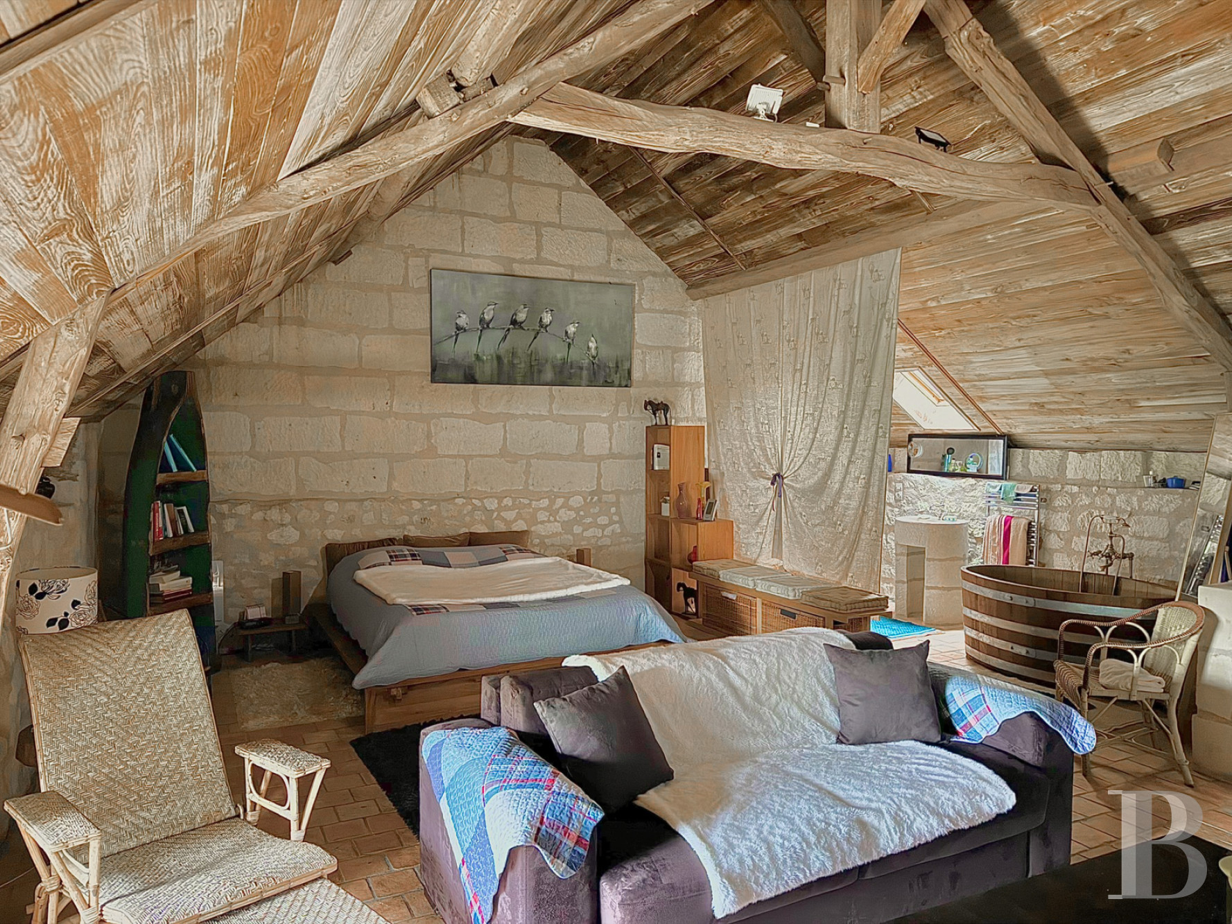 The building also gives on to a relaxing space, with a spa and a sauna, while, from the other conservatory, a spiral stone staircase leads to an immense bedroom, with sloping ceilings and a bathroom.