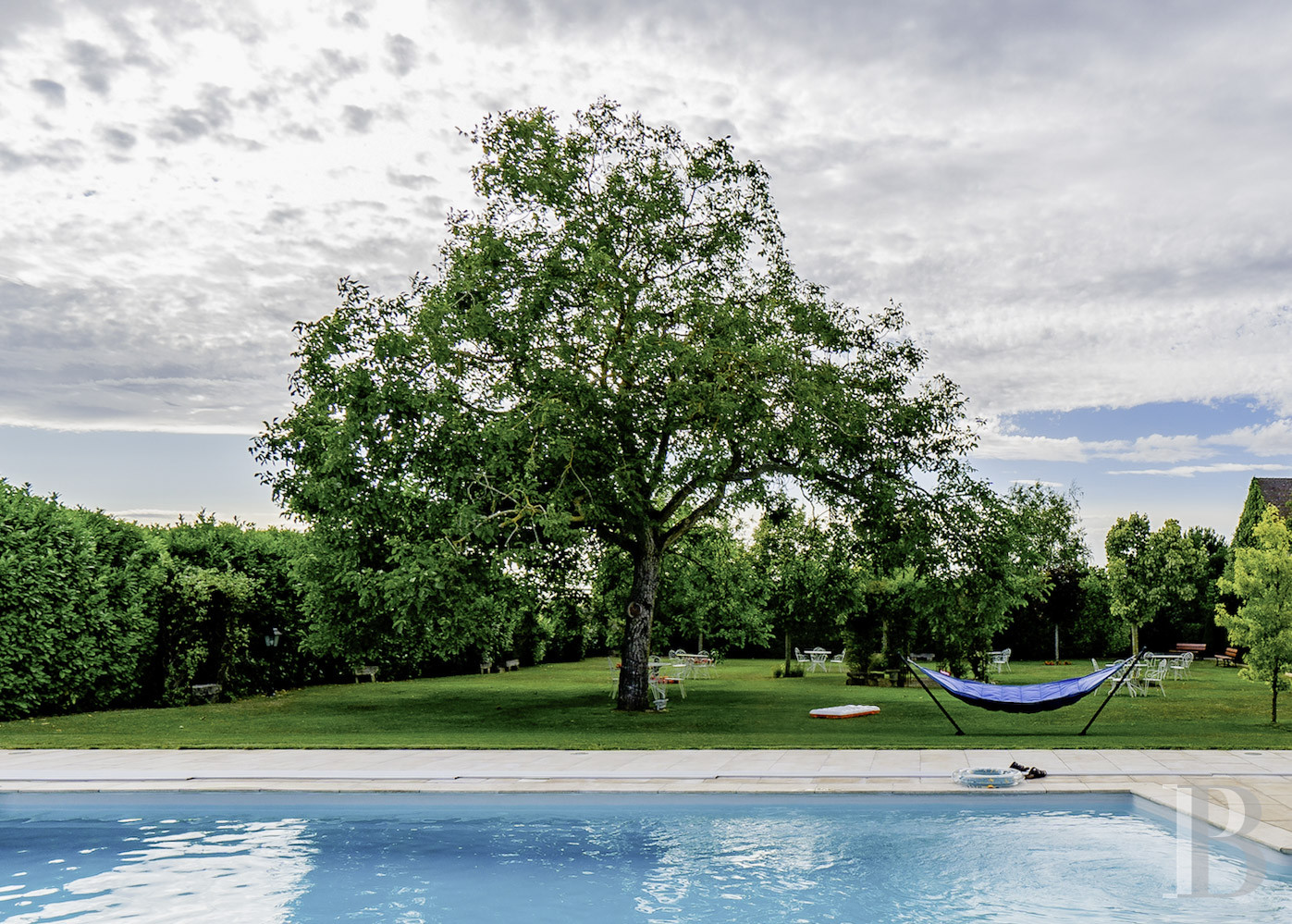 Further on, two gardens, separated by a hedge, one of which features a swimming pool, patio and guest cottage, are located towards the back of the property and planted with a majestic walnut tree and a bed of lavender.