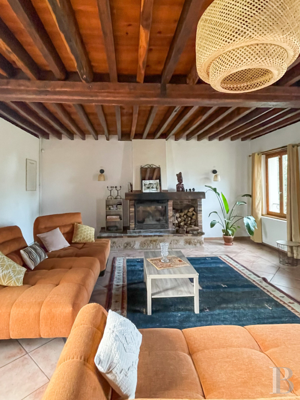With approximately 150 m² of floor area, spread out over two levels, it is accessible via two separate entrances: the first is located in the outdoor parking area next to the dwelling and the other can be found in the courtyard, near a wide carport. Both communicate with a large fitted kitchen that opens on to a living room where a wood-burning stove was installed within a fireplace, while the pointed stone of the interior load-bearing walls, the visible ceiling beams and terracotta-colour floor tiles highlight the charm of this dual-aspect living room, whose windows provide plenty of natural light.