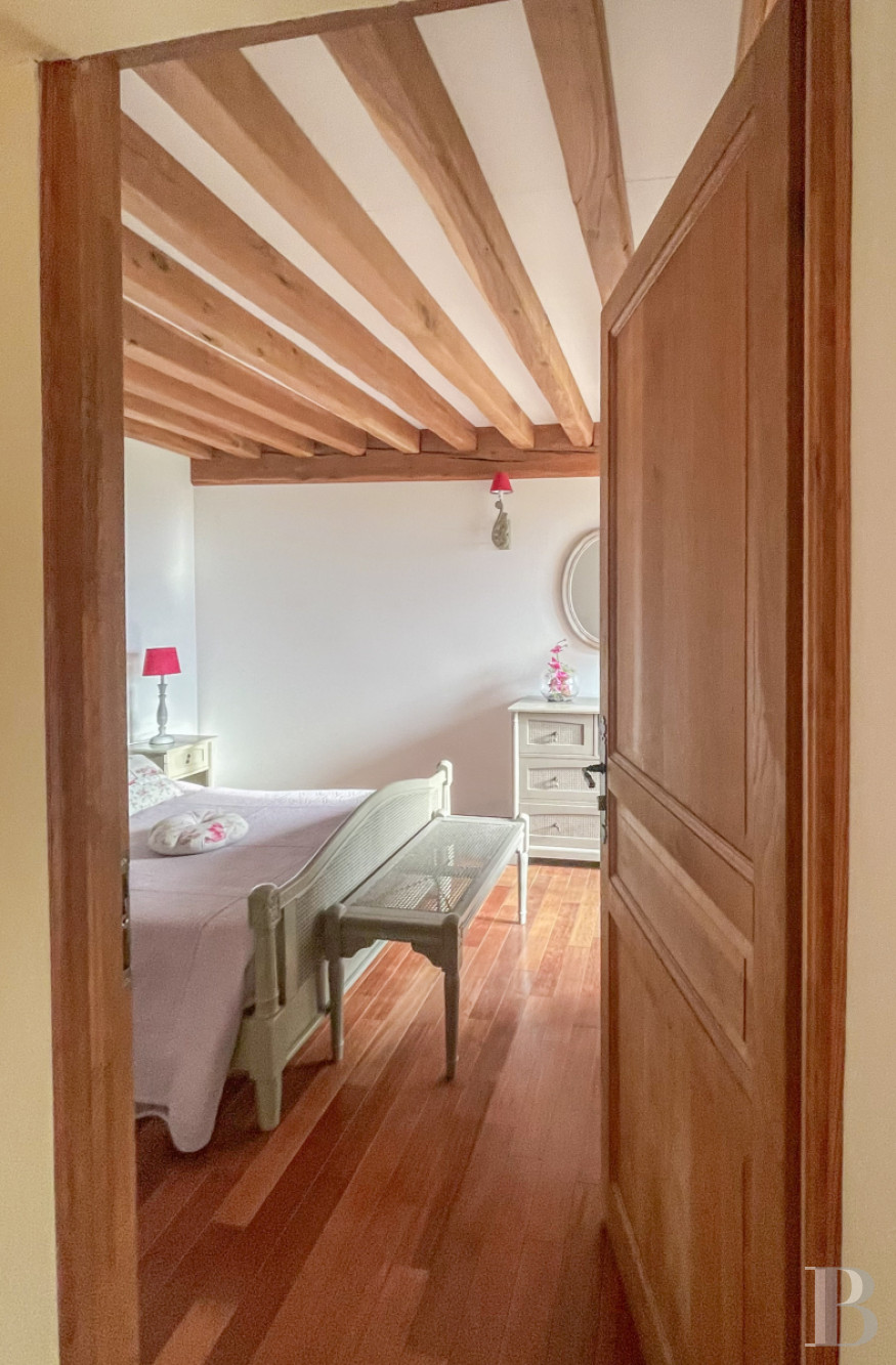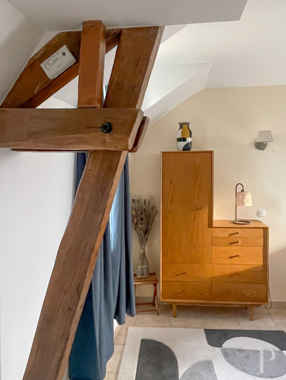 From the courtyard, the duplex flat, located between the dwelling and the guest cottage, includes two rooms over two levels with, on the ground floor, a living-dining room and an open kitchen that gives on to a private garden, while, upstairs, a large dual-aspect bedroom, with parquet floors, abuts a shower room and lavatory.