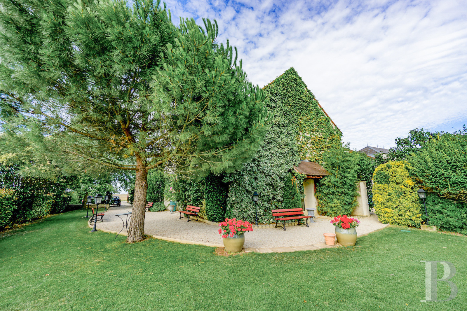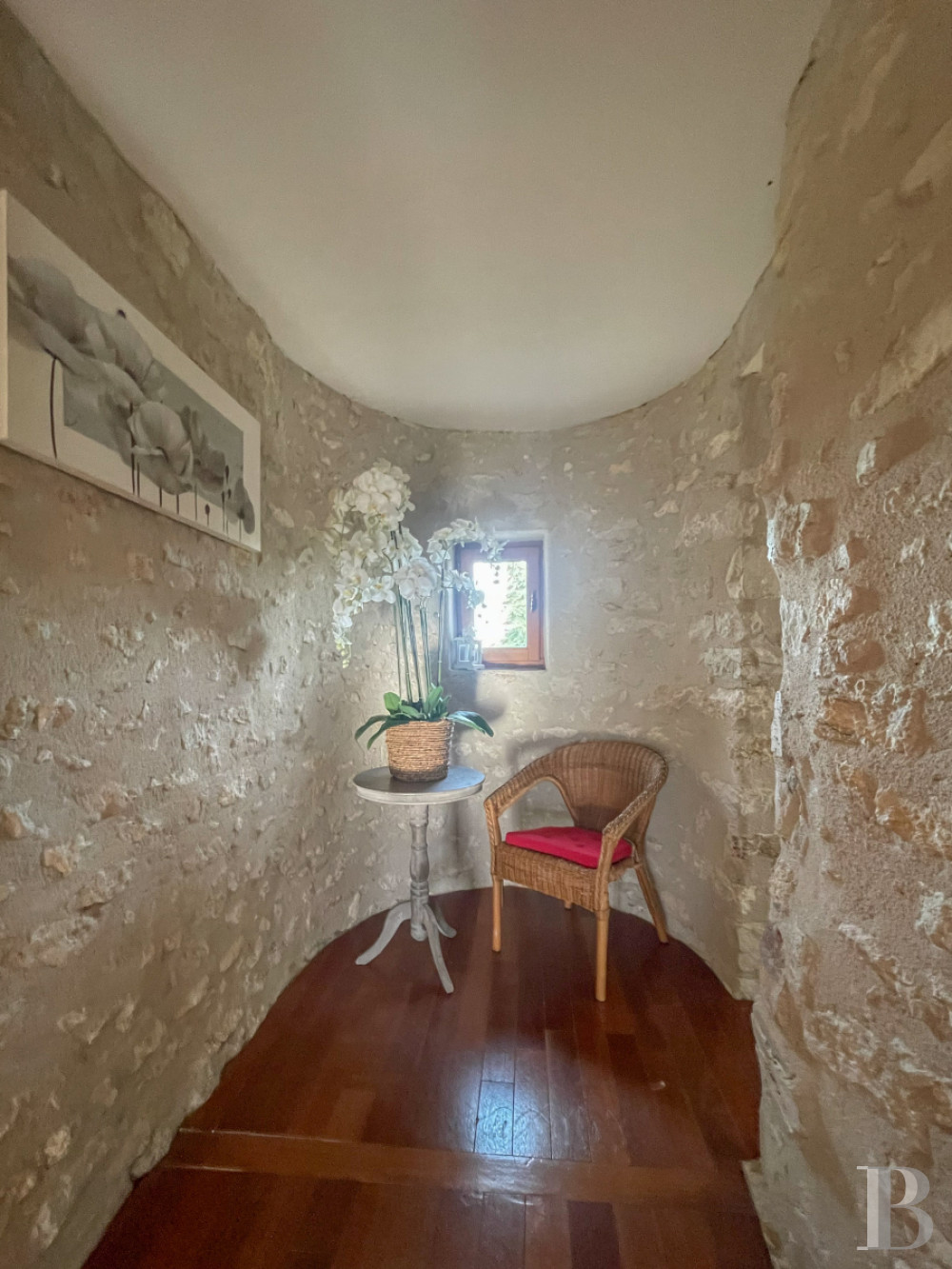 The first garden, larger in size and accessible from the guest accommodations, which each come with a small garden or patio, includes a 11.6 x 4-metre swimming pool, surrounded by a wide stone deck and abutting a patio as well as a central lawn highlighted by a majestic walnut tree as well as a gazebo festooned with rose bushes. In addition, a machine room is located in a recent annexe in which it would also be possible to create a two-room flat.