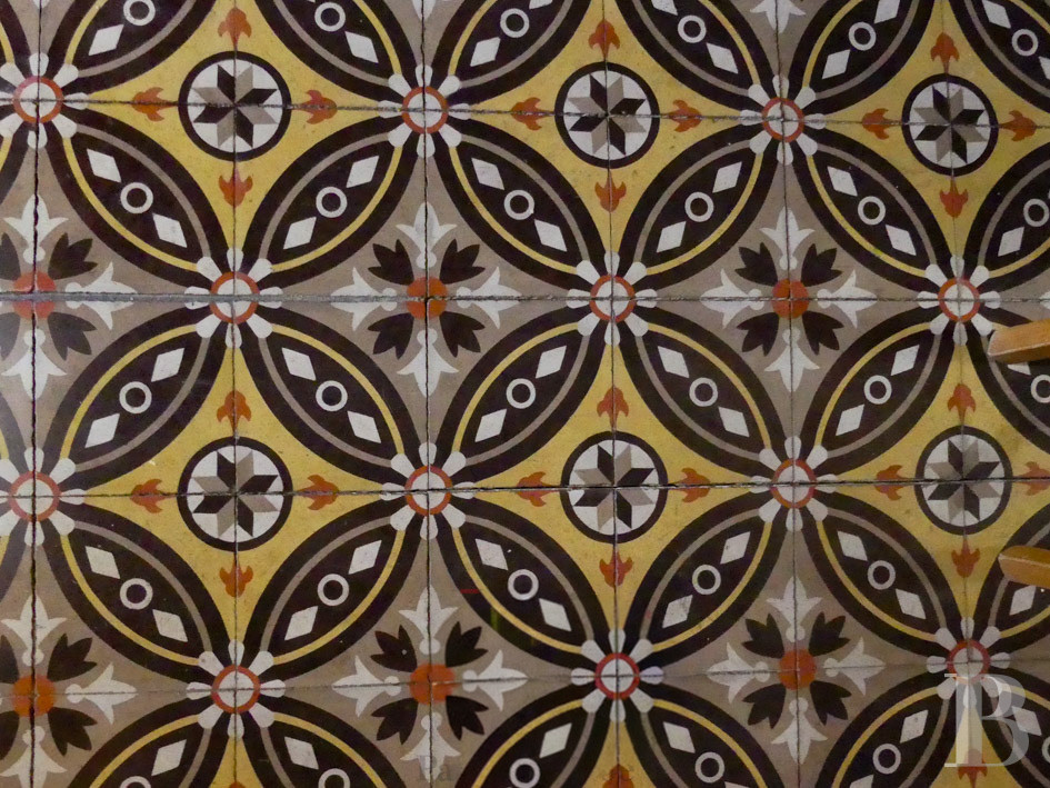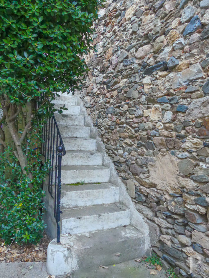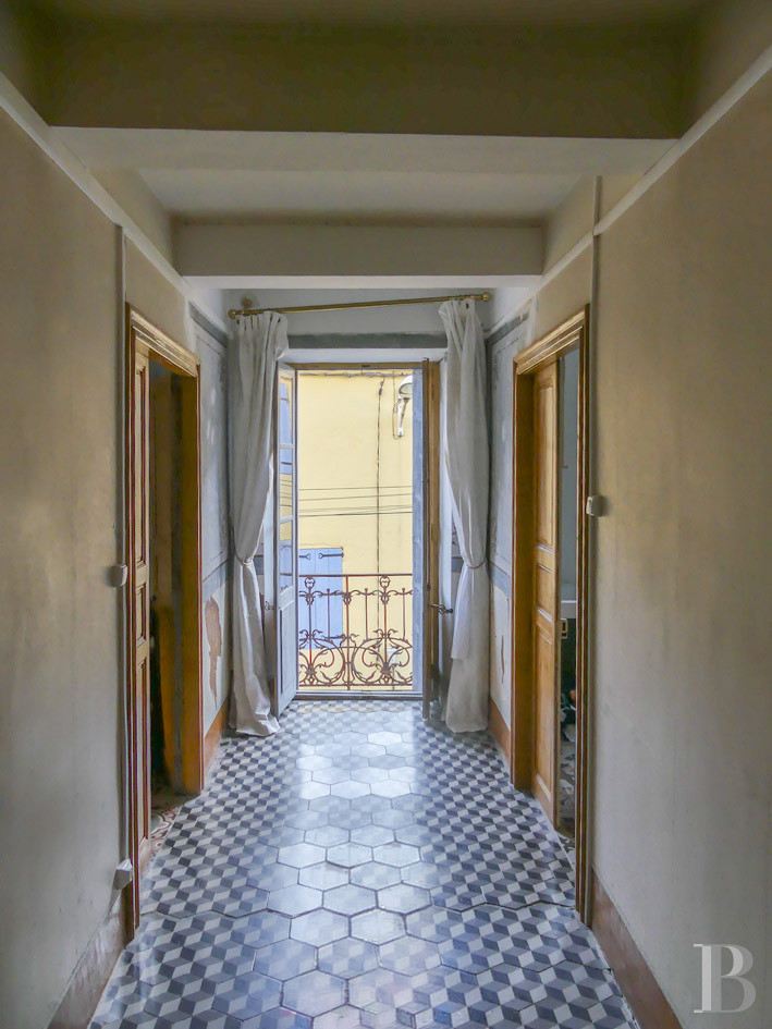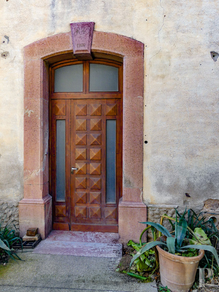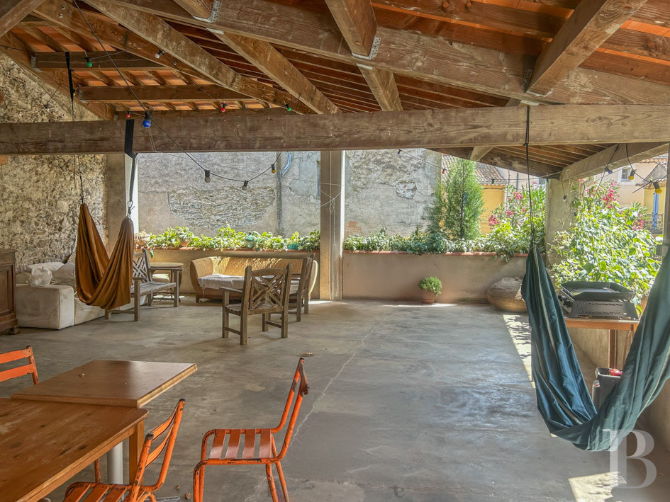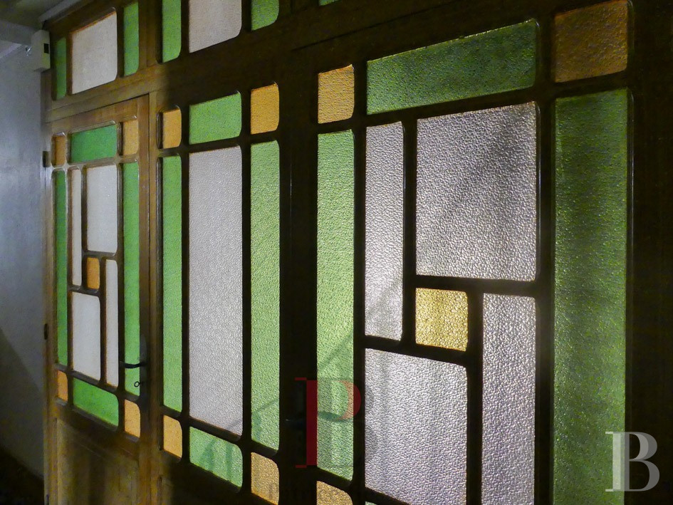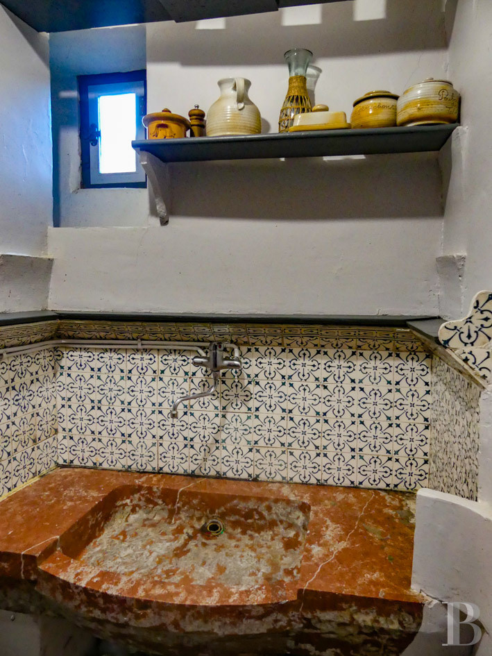 From the landing, you cannot see the stairwell, hidden as it is behind art deco glazing made up of vivid colours. A long corridor connects to the different rooms on this floor. In the middle, it is split into two sections by similar art deco glazing. These two glazed partitions add undeniable decorative value to the house and spare it from wintery draughts. They also used to separate the bedrooms from the reception rooms. On one side of the partition, the floor is covered with black, grey and white cement tiles. On the other side, terrazzo, with similar colours, forms the flooring. Opposite the staircase, a door leads into the lounge. This lounge is plainly adorned with a marble fireplace from the 1930s or 1940s. In the middle of the room, a window looks out at the courtyard and casts natural light onto the room’s original flooring of cement tiles. Beyond it, there is a dining room that has kept its atmosphere from the previous century with its original wallpaper, its old fabrics and its cement-tile flooring with colourful geometric tracery. Two secret cupboards frame a marble fireplace. An east-facing glazed door leads out onto the continuous balcony that runs around the house’s south-east corner. Opposite, a double door leads to a kitchen, which is filled with natural light from a garden-facing window. A sink made of red Languedoc marble, surrounded by original ceramic tiling, sets the tone for the room, where past and present combine in both the fixtures and fittings. Beyond a pellet stove there is a recently restored bathroom that you can reach from the end of the corridor. It has a bath, a shower, a washbasin and a lavatory. The original floor has been preserved. Only the walls have been redecorated with recent ceramic tiling. It lies opposite a first bedroom that has real character and looks out at the court. At the other end of the corridor, on the other side of the glazed partition, there are three bedrooms spread out on either side, as well as an office, a storeroom, a bathroom with a lavatory, a shower room and a lavatory. Apart from the three bathrooms, which were recently renovated completely, the other rooms have kept their original style – mostly a 1920s style. In this part, the floors are mostly covered with terracotta tiles. At the end of the corridor, you can reach a first terrace on the north side. This terrace connects to an outbuilding with an office on the ground floor and a bedroom on the first floor. This terrace, between two buildings, can be reached straight from the court via a flight of steps. It leads to a vast covered terrace.