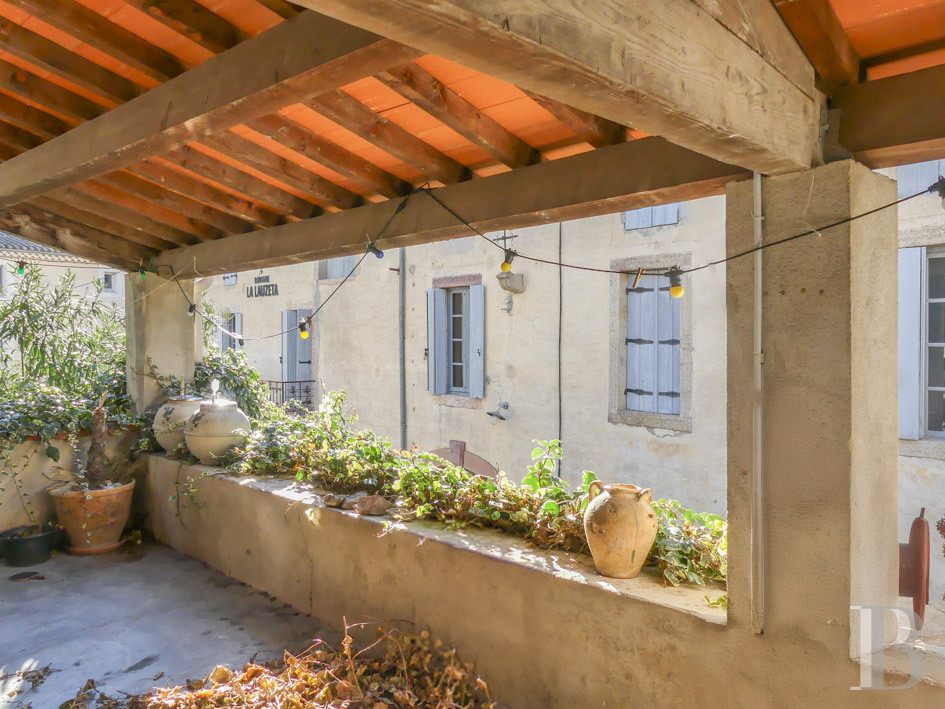 On one side of the court, beside a cypress, a wooden double garage door leads into a storeroom, which is used for storage. The floor is made of concrete and the ceiling is structured into arched bands of terracotta tiles. Above this storeroom, there is a vast covered terrace with a 75m² floor area. It lends itself to many different uses, ranging from meals to games and naps in hammocks and deckchairs in absolute privacy. Plants climbing up the stone walls give this terrace character that is typical of the south of France.