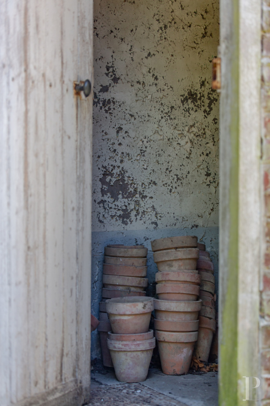 The outbuildings lie on the property’s south side. They have two levels and a tiled roof. Their elevations combine stone and brick. On the ground floor, there are two garages, closed with wooden double doors. You can reach the first floor either via an indoor wooden staircase or outdoor stairs. Up here, a landing connects to six bedrooms and a former bathroom. There is also a former storeroom and an old kitchen and scullery. On the east side, a glazed door leads to a former orangery, which is bathed in natural light. Another door leads to a cellar. A woodstore completes the series of outbuildings.