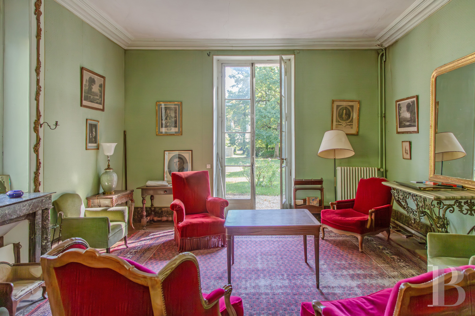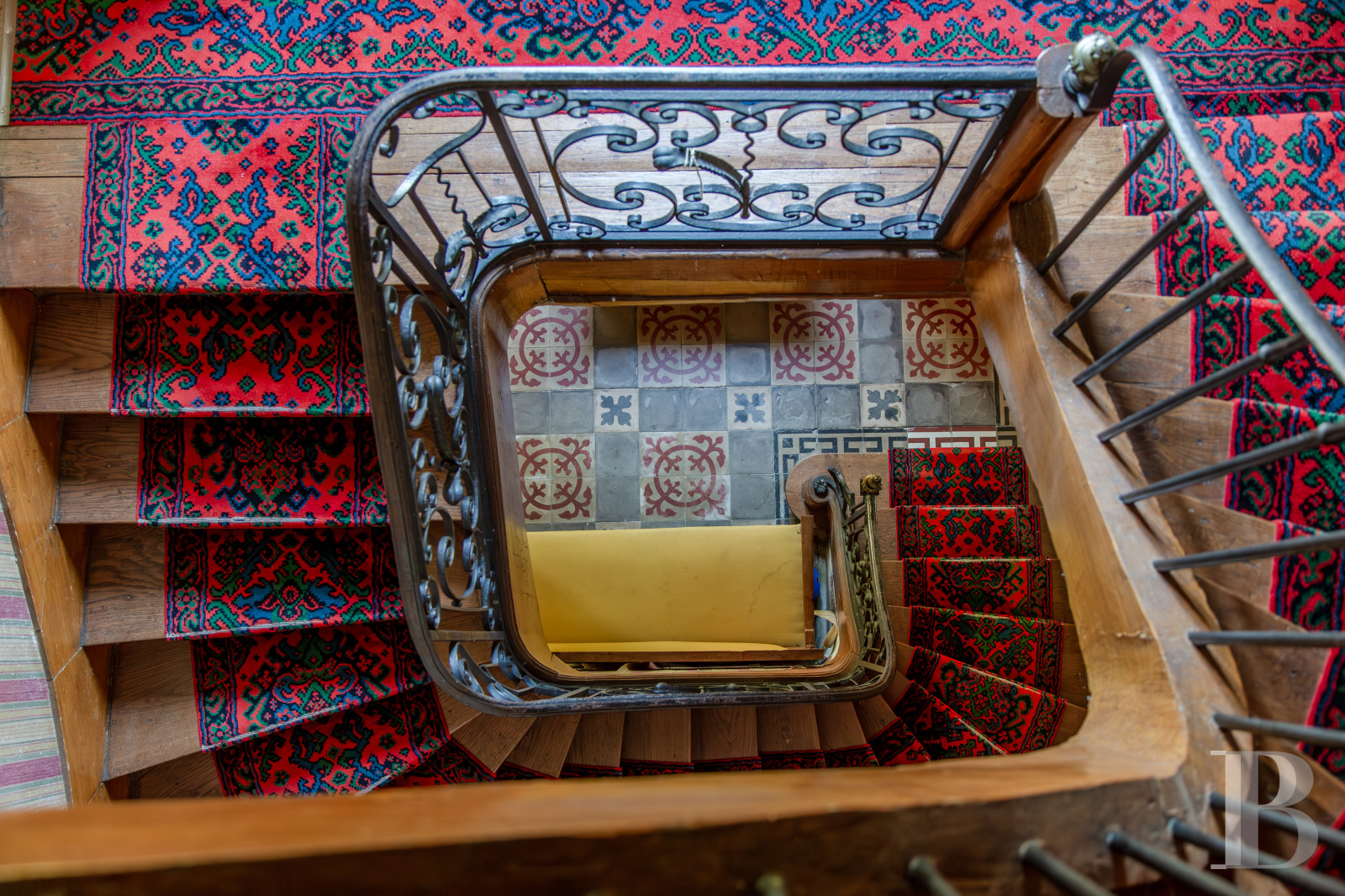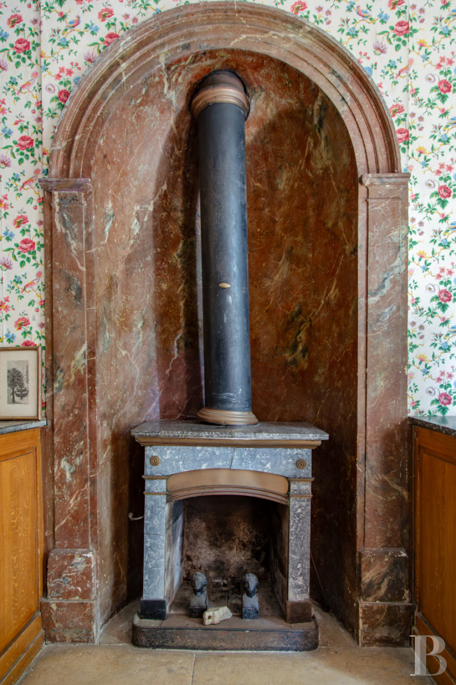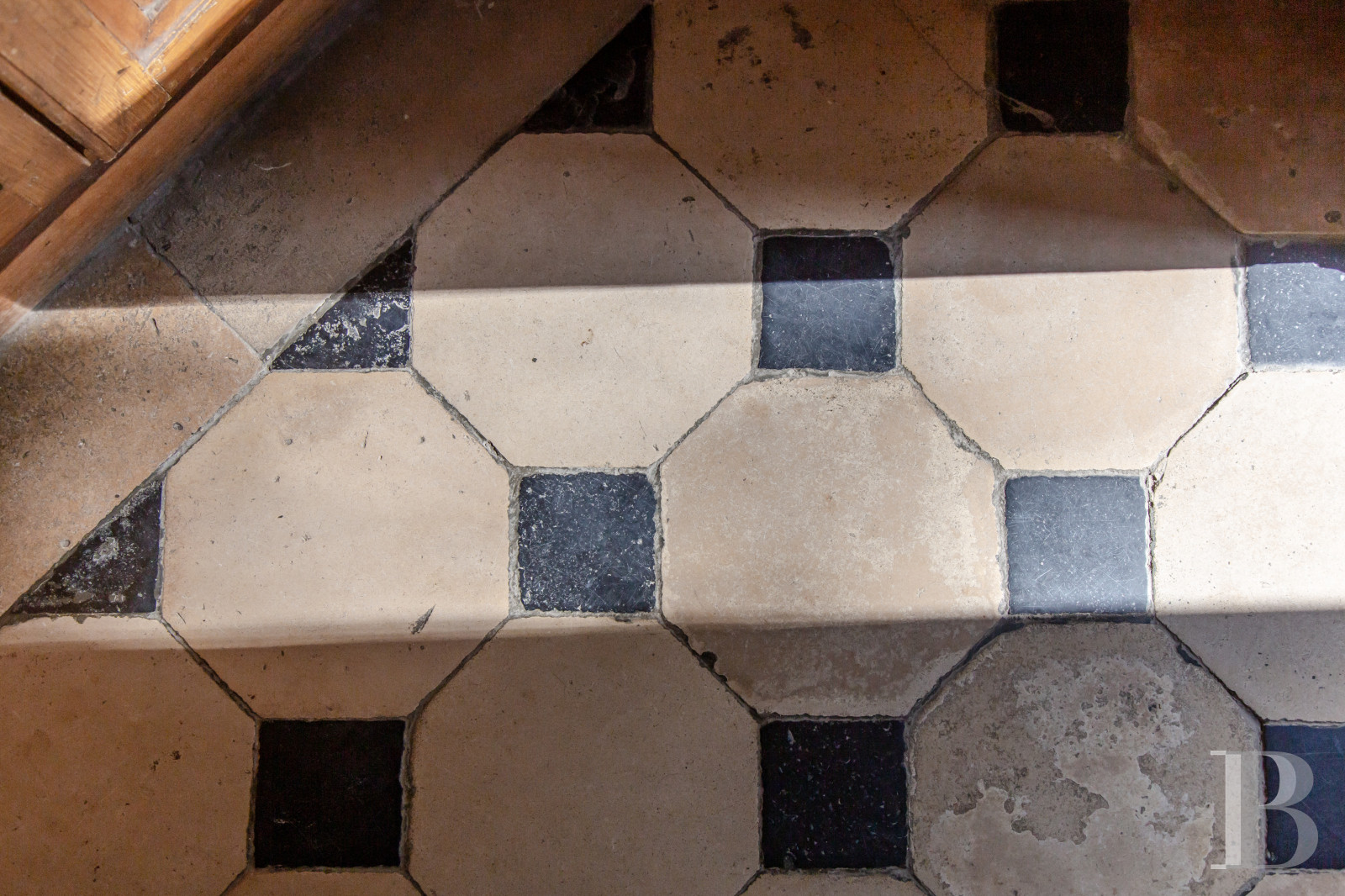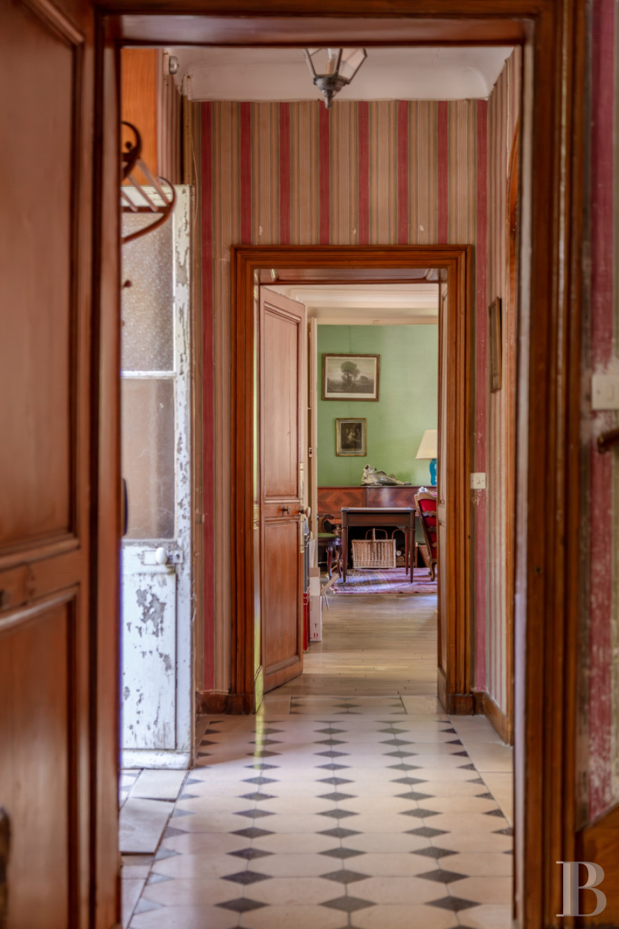 Beyond the main entrance door, there is a spacious hallway with a floor of tiles patterned with black square inserts. The walls are adorned with wallpaper bearing floral motifs and birds of different colours, bringing a touch of refinement. An alcove painted in faux brown marble houses an old stove. This alcove is framed between two console tables with marble tops. Opposite the entrance door, a glazed door leads to a corridor that connects to different reception rooms. On one side, a first door leads to a kitchen where two windows bring in soft natural light. A floor of cement tiles recalls upper-middle-class houses of the late 19th century. A second door takes you to a hallway where there is a lavatory. In the entrance hall, beyond a glazed door, a main staircase with a wrought-iron balustrade climbs elegantly upwards. Next to it, a wooden door leads to a dining room with wood strip flooring and a marble fireplace. Two sets of French windows offering views of the grounds bring in an abundance of natural light. Next, a double door leads to a lounge. This lounge has chevron parquet and a marble fireplace beneath a trumeau panel. A window set in a rococo-style garland of gilded wood offers a view of the garden.