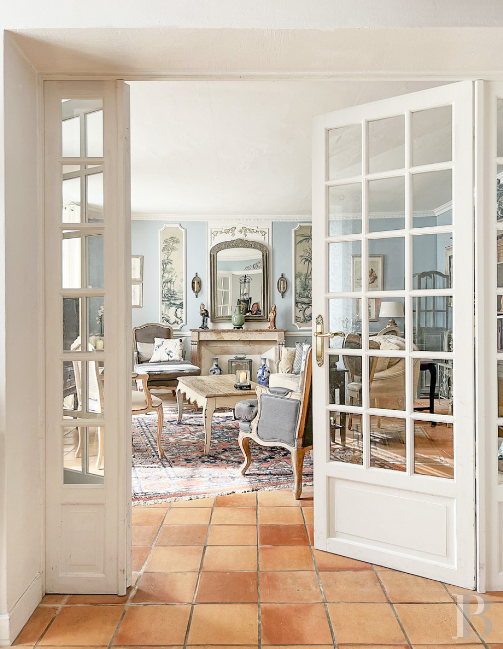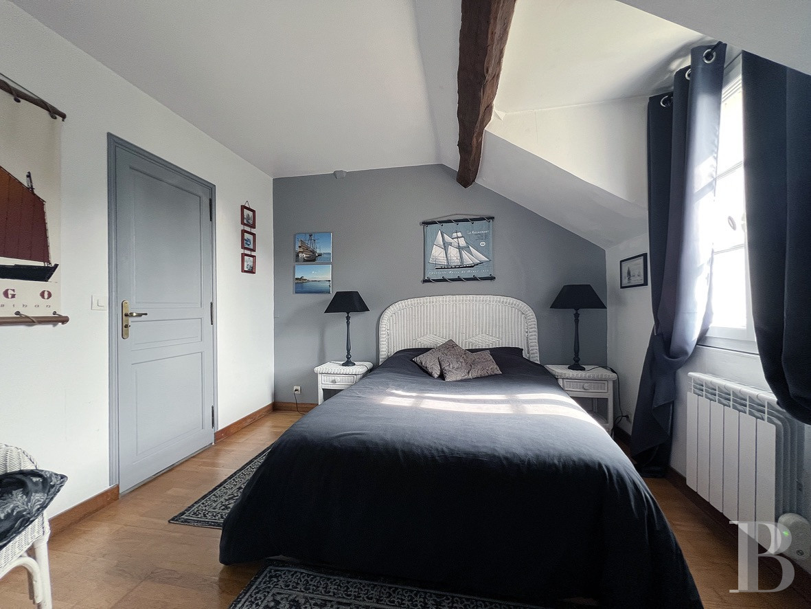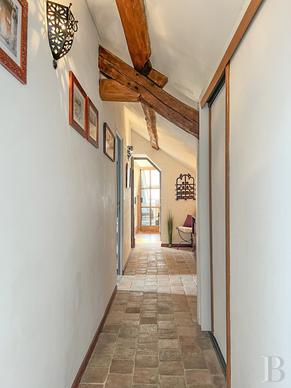 The main quarter-turn staircase links the dining room to a landing tiled with old terracotta tiles. A stained-glass window and a roof window bathe this space in natural light. The landing connects to a shower room and to two bedrooms, one of which currently serves as a linen room. At the end of the east wing, beyond the point where the second staircase arrives, there is a third bedroom, beside a walk-in wardrobe and a lavatory. A long corridor with a floor of old terracotta tiles connects to a fourth bedroom. This corridor includes storage spaces. It then connects to a fifth bedroom with a 50m² floor area, beneath exposed roof beams. The latter bedroom has been turned into an office. It is filled with natural light from two large roof windows, a glazed door and a small window. It adjoins a small walk-in wardrobe, a lavatory and a bathroom with a bath and shower.