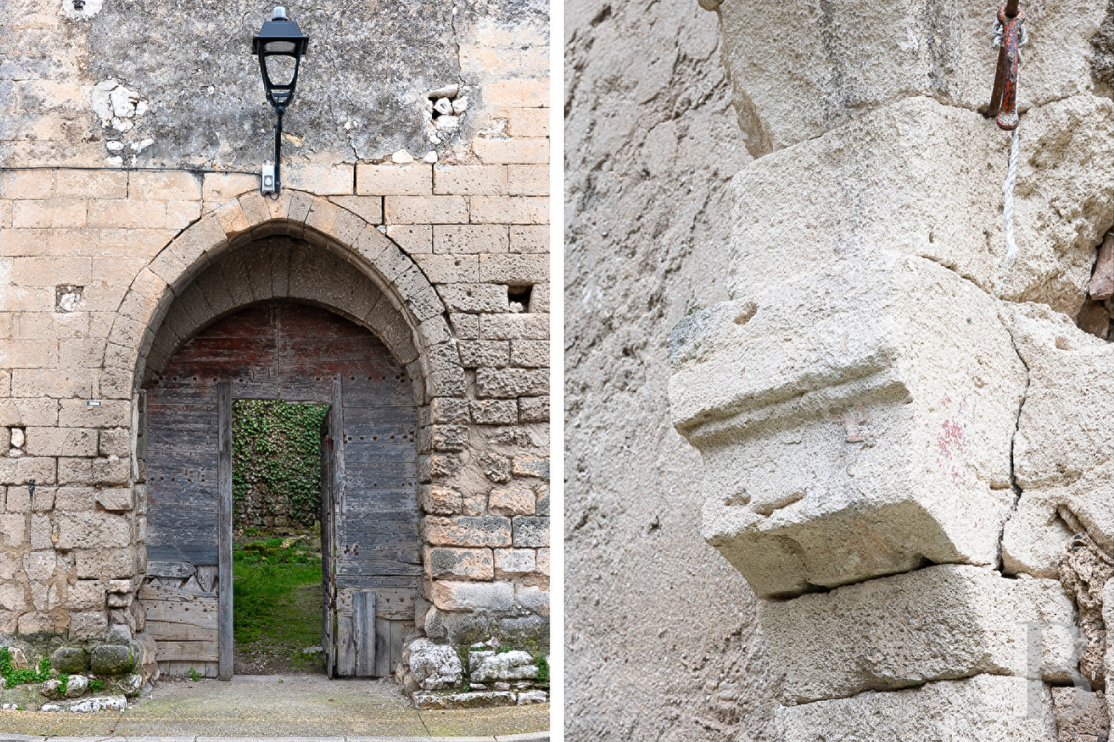 The entrance door, with a glazed Judas hole, opens directly into the lounge with a quadruple vaulted ceiling whose arches descend to the floor and, together with the four semi-circular load-bearing walls, create a slight recess within the room. The locally quarried stone has been plastered over in this room. The morning sunlight illuminates the black and white tiled floor through the windows overlooking the square. Another window opens onto the courtyard, making it possible to see visitors coming through the postern in the square tower.