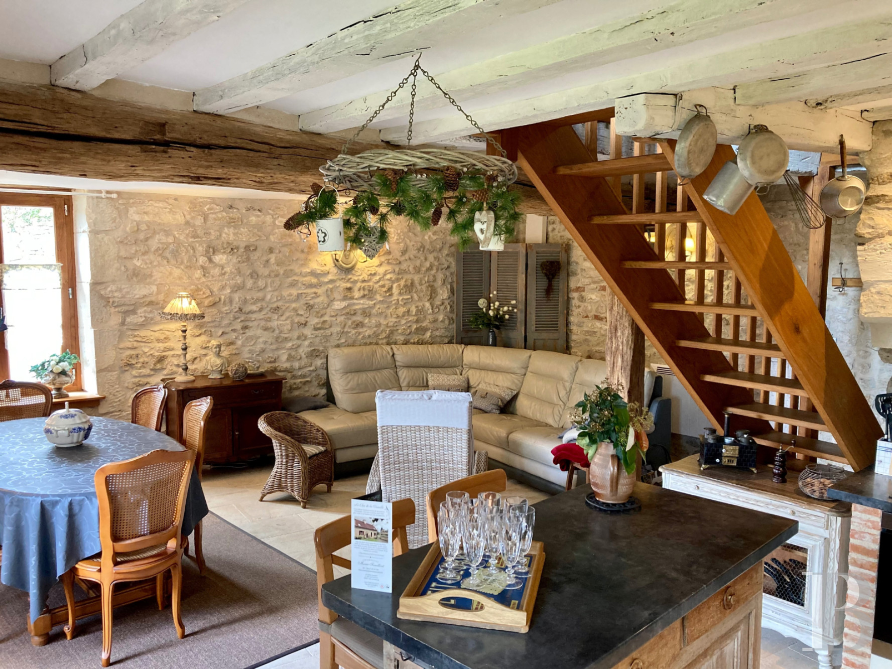 A sliding door makes it possible to separate the residence into two homes and leads to a second dining room, with a black painted stone fireplace, separated from the kitchen by a bar.