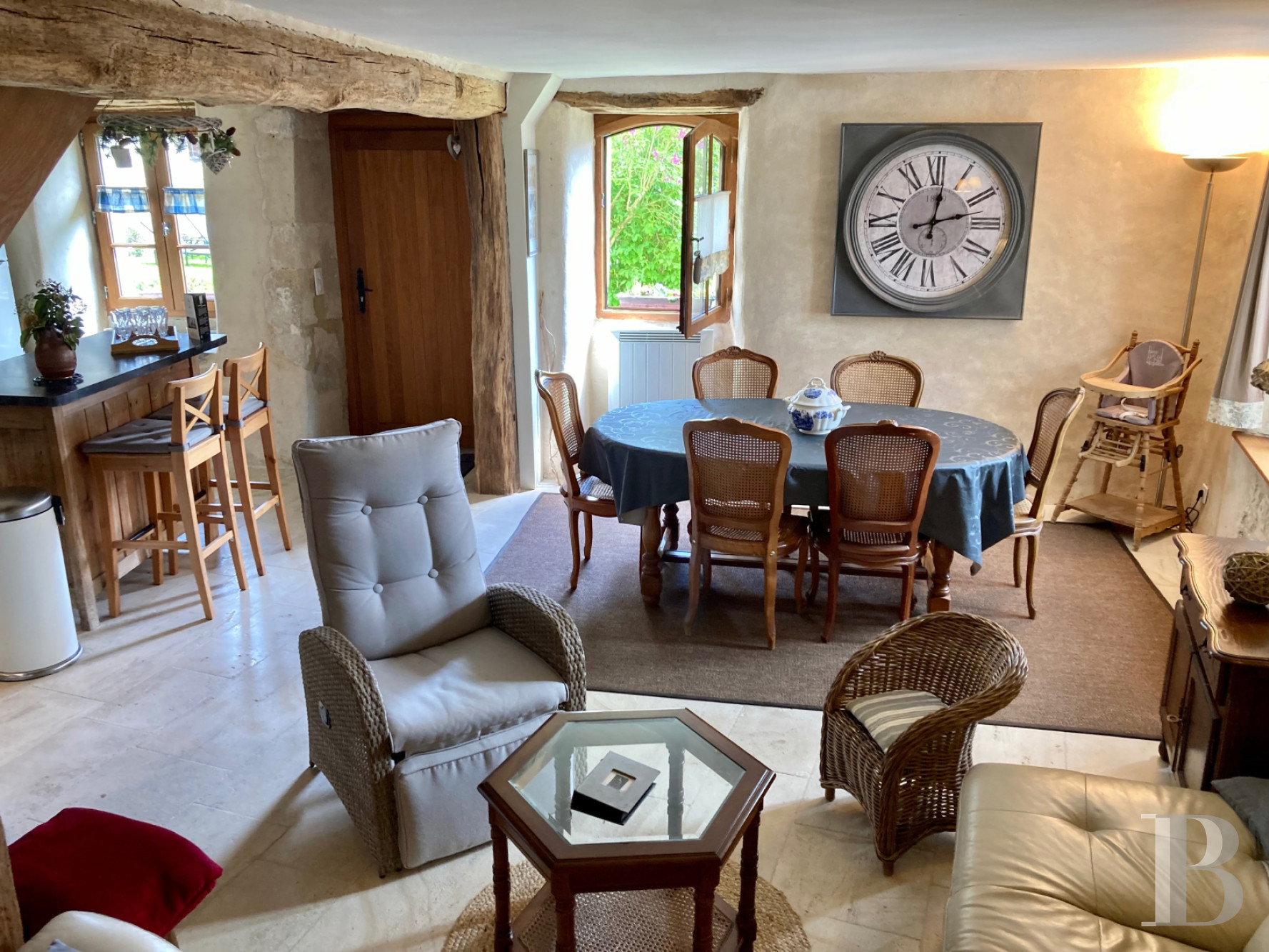 The main entrance leads directly into a living room containing a kitchen area with a bread oven and a shallow stone sink, a dining area and a lounge area. The walls are made of pointed rubble stone and the floor is paved with Burgundy stone slabs.