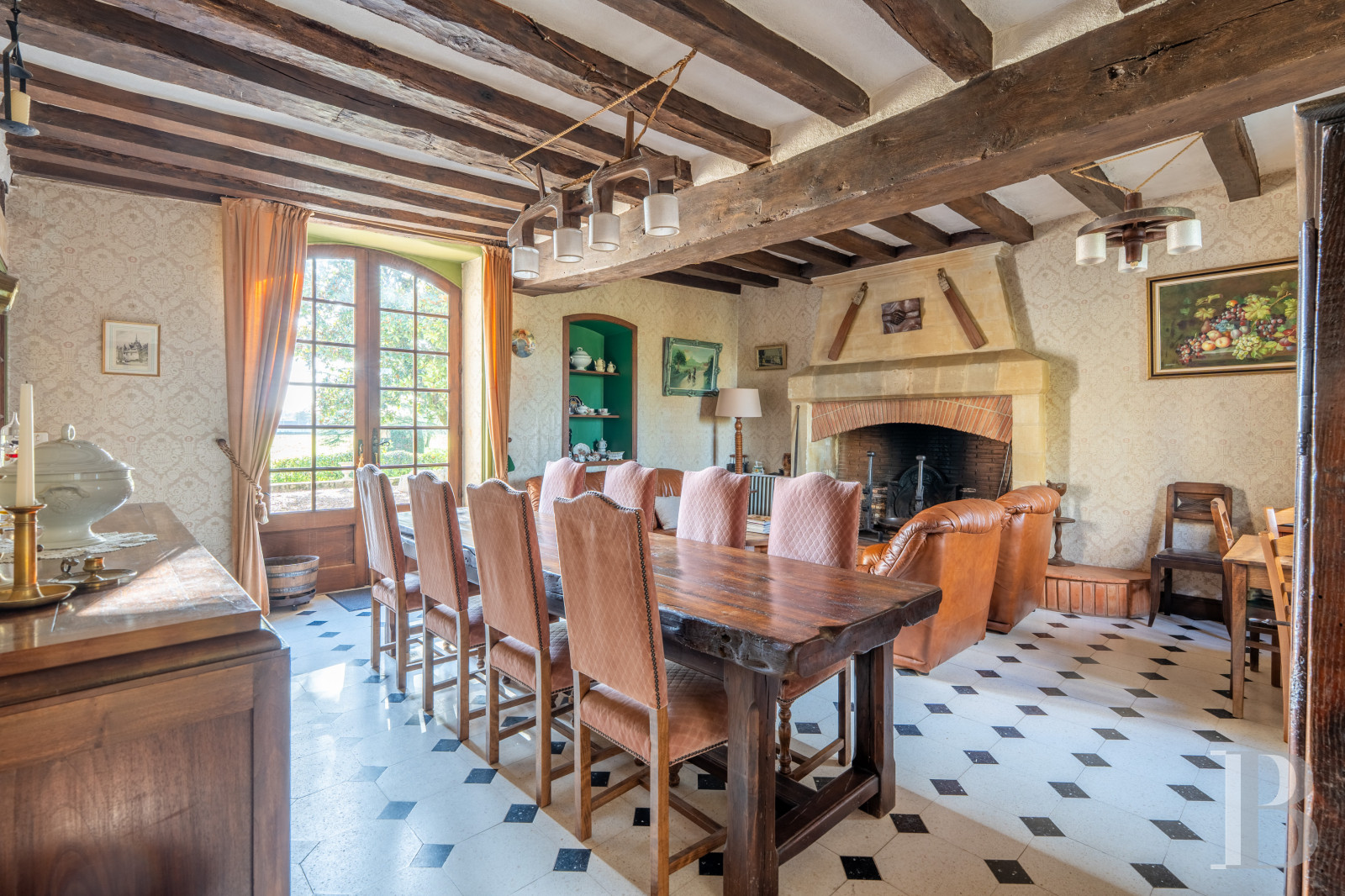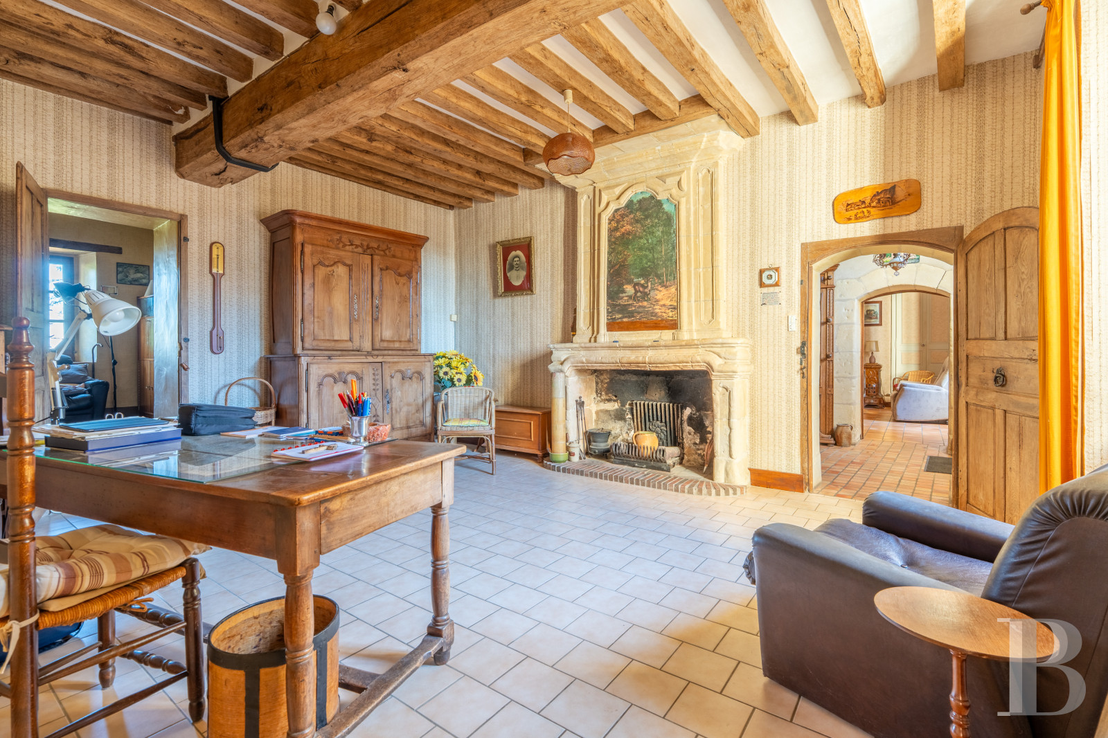 There are two entrance doors to the priory from the partially cobbled patio. The first opens into the main section and leads to a lounge, office and a staircase to the upper floors. Both rooms boast tuffeau stone fireplaces, each topped with an overmantel and cupboards, next to which there are closed alcoves. There are exposed beams on the ceiling and the floors are paved with terracotta or ceramic tiles. The alcoves are equipped with a washbasin. The double-flight wooden staircase has an intermediate landing and a balustrade boasting balusters. The entrance also leads to an approximately 14-m² boiler room and an around 15-m² cellar, from which there is an exit to the outside. The second entrance door into the second section opens into a hallway leading to a kitchen, dining room, lavatory, shower room and a staircase to the upper floors. In the dining room, there are exposed beams and chessboard style floor tiling. A brick and tuffeau stone fireplace stands against one of walls. The hallway also connects with the office.