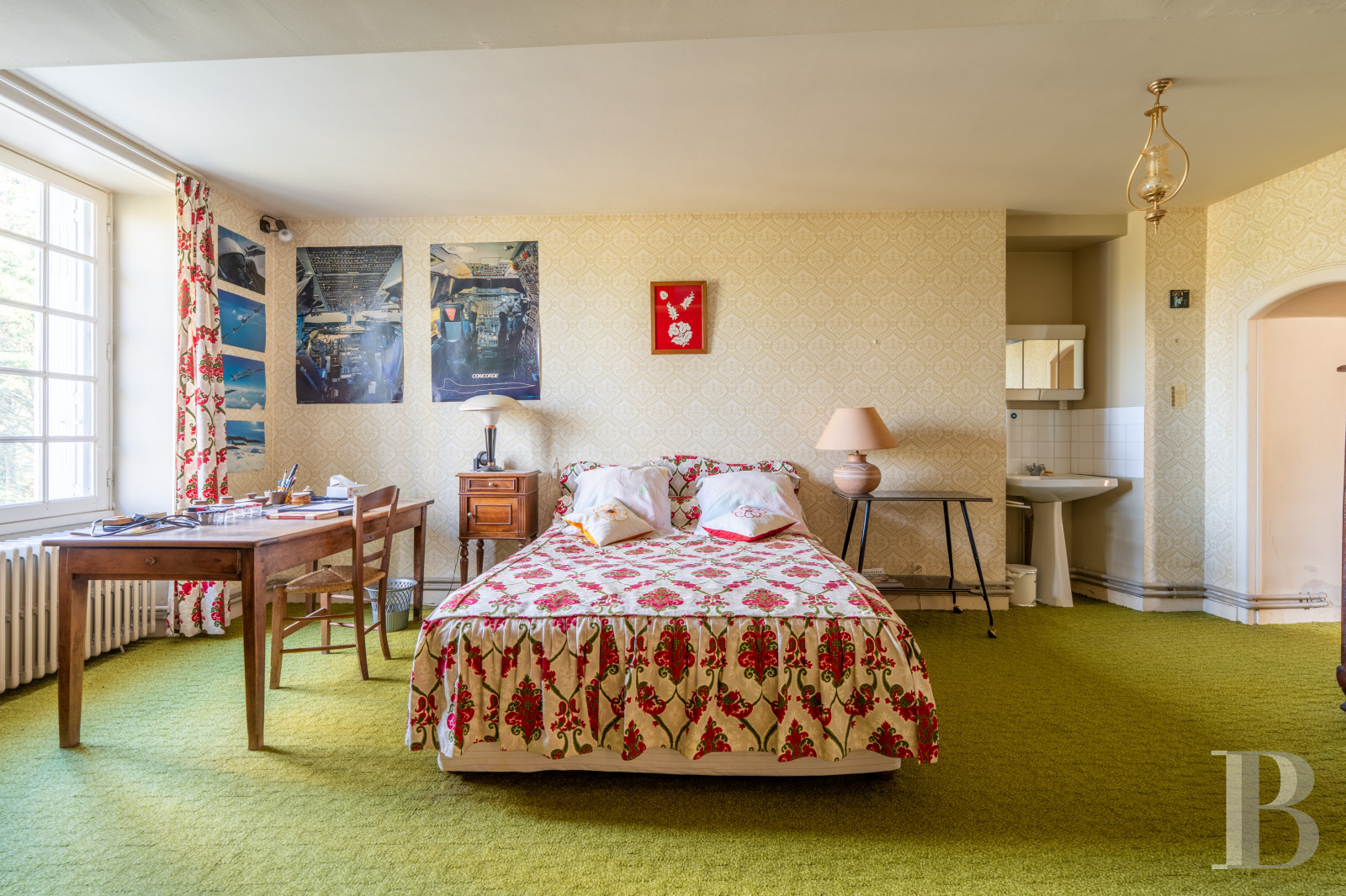 In the main section, there are two bedrooms with tuffeau stone fireplaces and closed alcoves, as well as a bathroom and a lavatory. There are exposed beams on both of the bedrooms’ ceilings. The first floor in the second section is divided into three bedrooms, one of which adjoins a lavatory and provides access to all the rooms on the level. The period terracotta floor tiles still in place are covered with carpet.