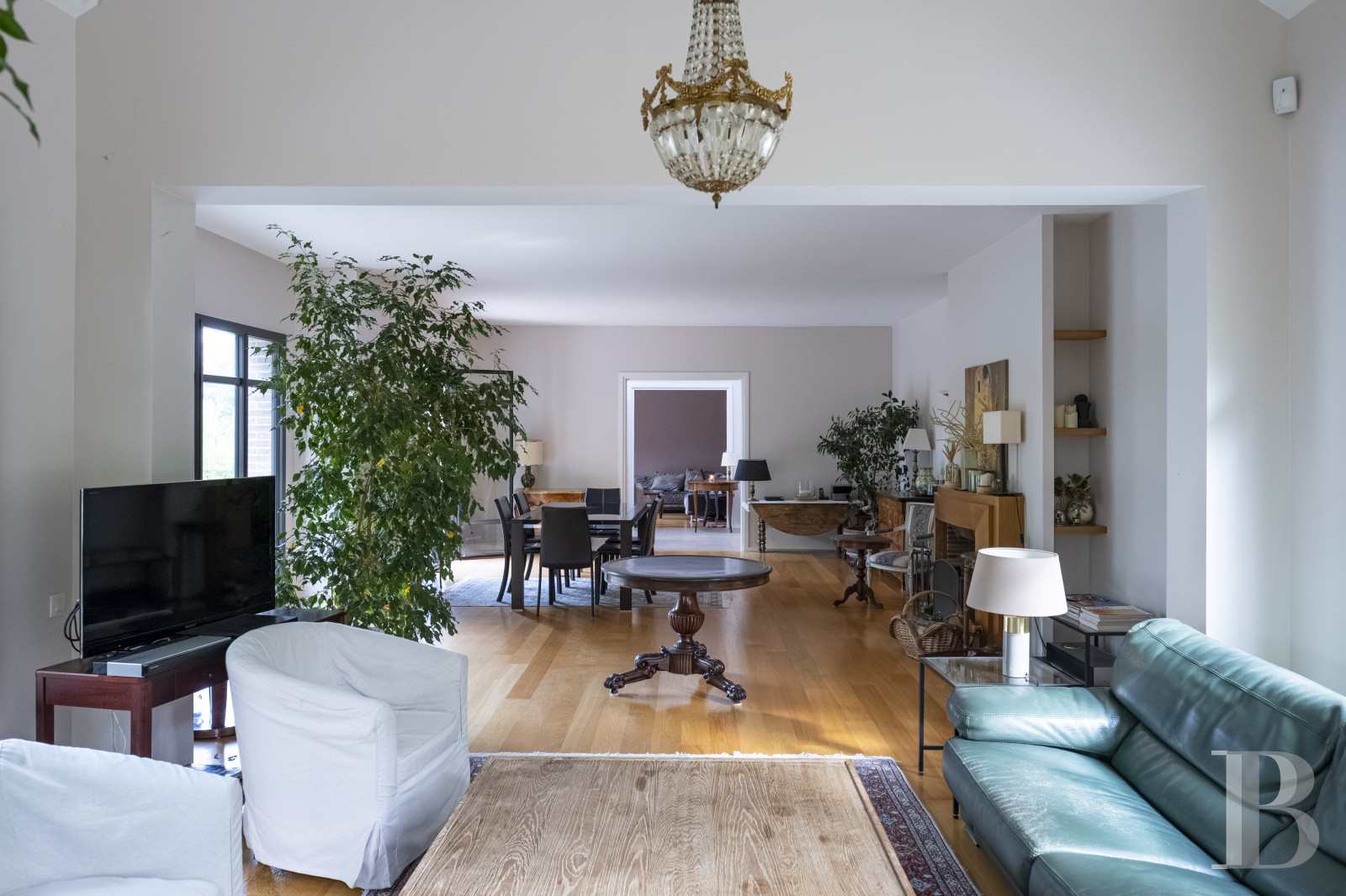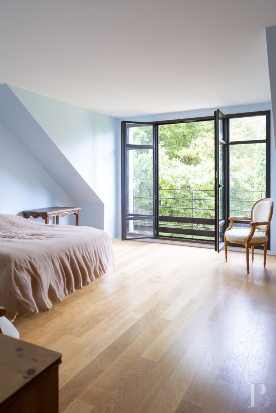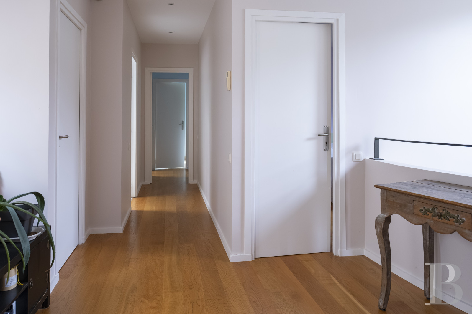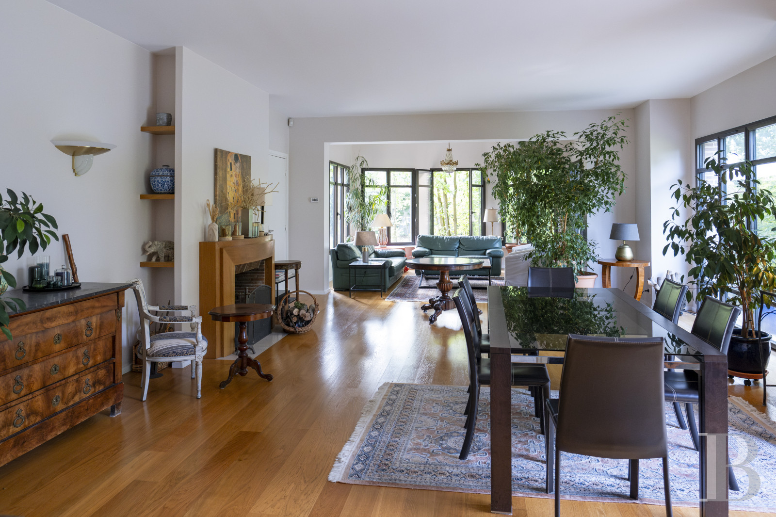 As for the two-storey dwelling, with approximately 230 m² of inhabitable floor area, it contains five bedrooms, including one on the ground floor, and a living room of nearly 80 m², while the basement and garage extend over approximately 180 m². With underfloor heating on every level of the dwelling, on its garden side, an immense flagstone patio, with both an area for dining and relaxing, extends the ground floor towards the exterior.