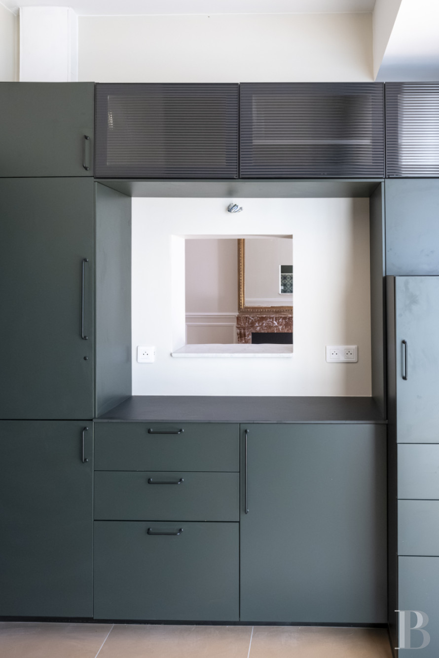 An almost 8-m² corridor leads to the four main rooms on this level and is paved with period cement tiles adorned with a blue rose pattern. A first, approximately 7-m² room to the right of the entrance could be used as a large family cloakroom or as a workspace. To the left, an approximately 35-m², dual aspect, double reception room with chevron-patterned wood stripped flooring is oriented north to south. A small-paned, double-leaf, wooden French window separates it from the living room, without blocking the light that pours in or the views of the garden. The pink marble fireplace topped by a large trumeau mirror framed with golden coloured moulding underlines the elegance of the premises. The corridor continues to an almost 9-m² fully equipped fitted kitchen, which merges into an approximately 13-m² dining room that is generously bathed in light. A door in one of its walls also leads into the lounge. Next to the dining room, there is a custom-made conservatory extension with workshop style glass walls and roof. It opens onto the garden and gives the feeling of an outside patio inside. The various sections of the conservatory can be opened and the glass has been specially treated to enjoy the sunlight while limiting passage of heat. It also boasts air conditioning. The green metal structure of the conservatory and fitted kitchen elements echo the nature surrounding the house.